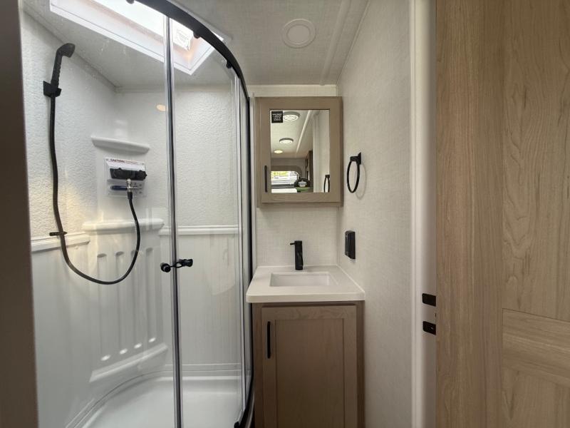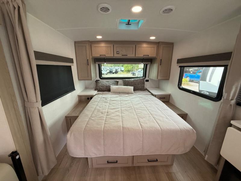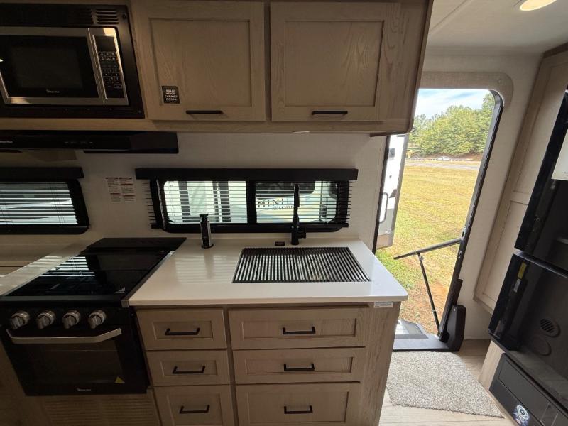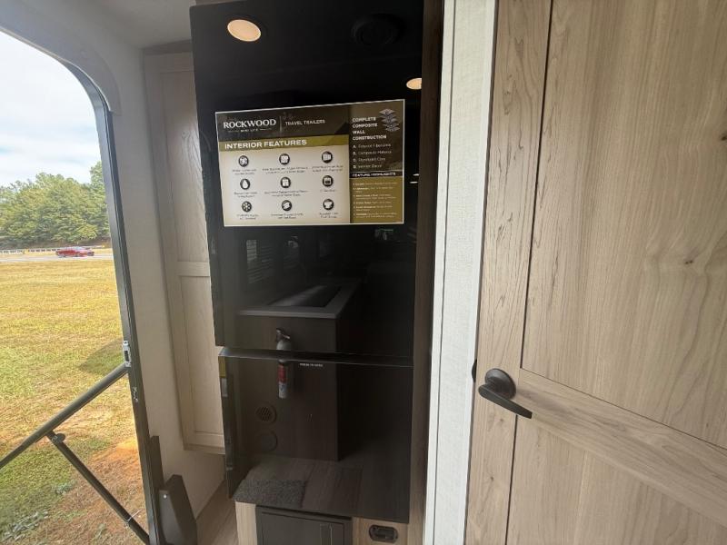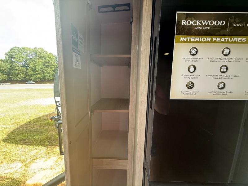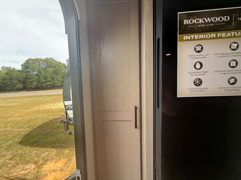 Each Rockwood Mini Lite travel trailer by Forest River is constructed with a fully laminated one-piece walkable roof, sleek frameless windows, and a six-sided full aluminum frame for strength and durability. The 12V thermostatically controlled heated tanks, plus radiant foil in the underbelly will allow you to camp well into the colder months, and the 200W roof solar panel will be perfect for a little off-gridding. Each model includes solid surface kitchen countertops, hidden hinge cabinet doors, roller shades, plus many more interior features. Having an AIR 360+ omnidirectional antenna with WiFi prep on board gives you the option to get some work done if it's needed, and the power tongue jack provides hassle-free set up, so you can enjoy more time relaxing!