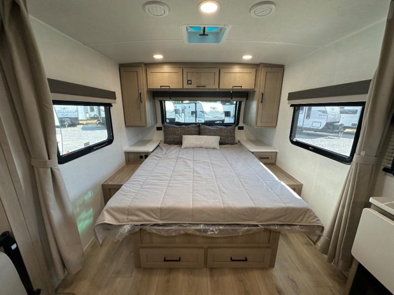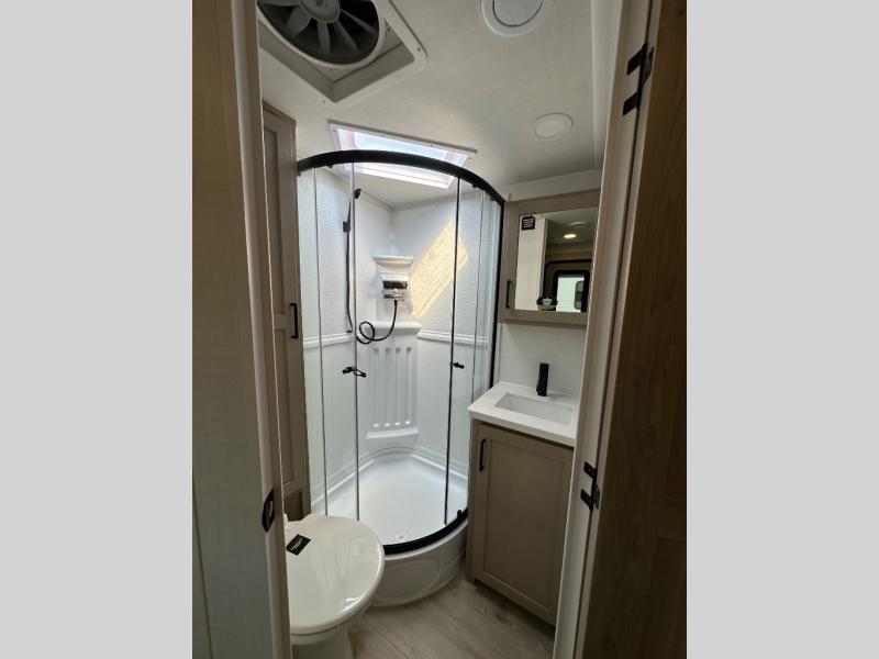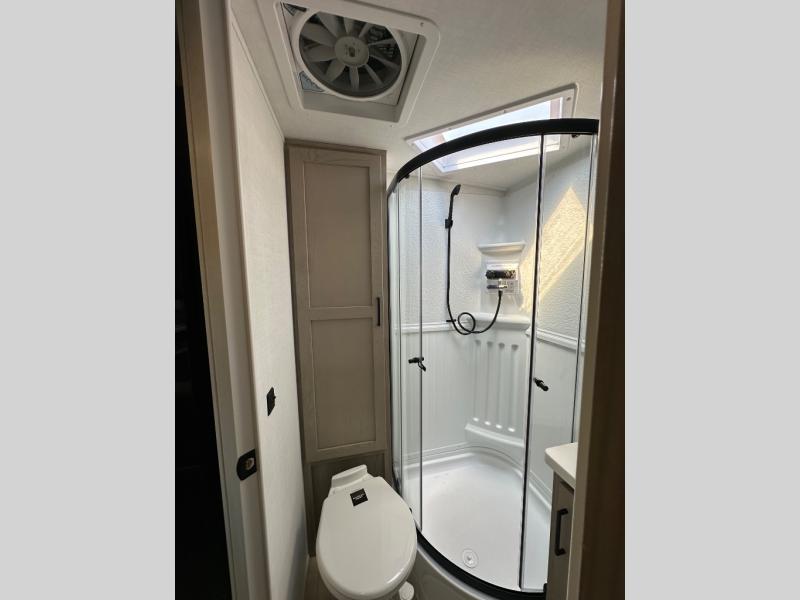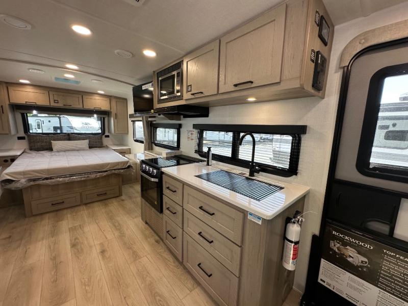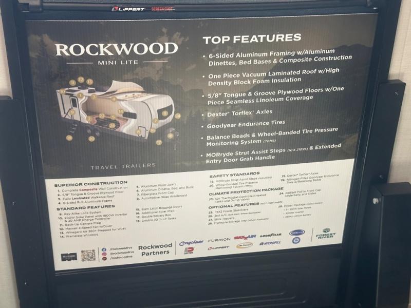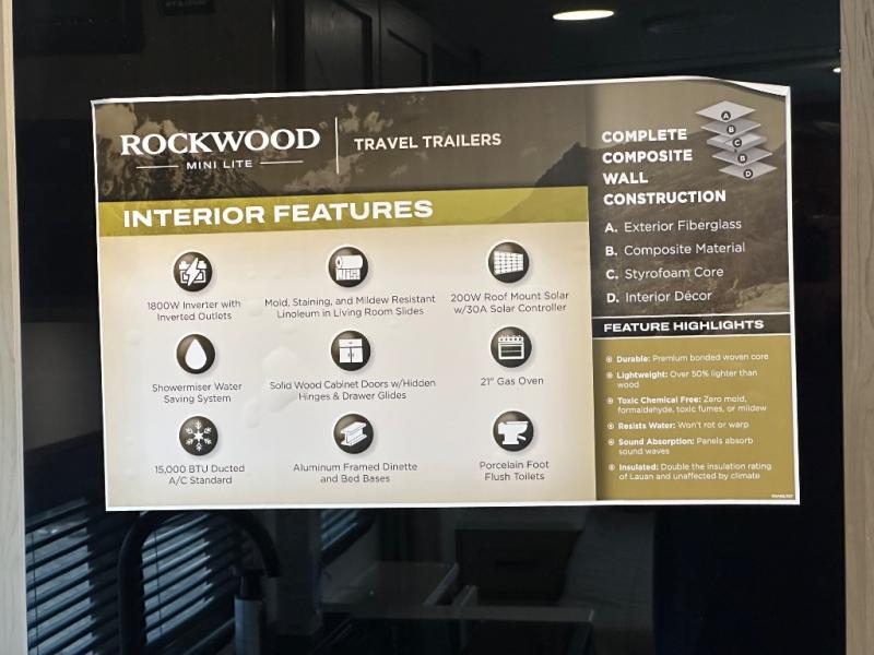 Each Rockwood Mini Lite travel trailer by Forest River is constructed with a fully laminated one-piece walkable roof, sleek frameless windows, and a six-sided full aluminum frame for strength and durability. The 12V thermostatically controlled heated tanks, plus radiant foil in the underbelly will allow you to camp well into the colder months, and the 200W roof solar panel will be perfect for a little off-gridding. Each model includes solid surface kitchen countertops, hidden hinge cabinet doors, roller shades, plus many more interior features. Having an AIR 360+ omnidirectional antenna with WiFi prep on board gives you the option to get some work done if it's needed, and the power tongue jack provides hassle-free set up, so you can enjoy more time relaxing!