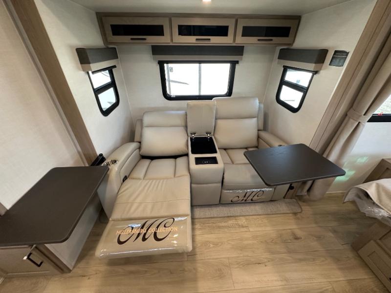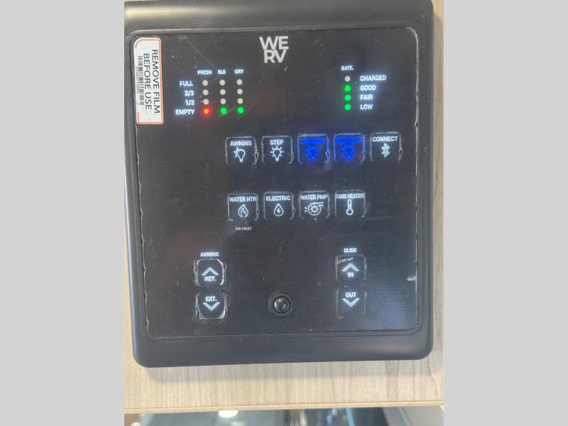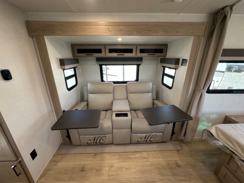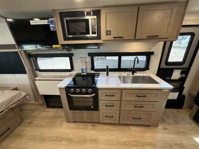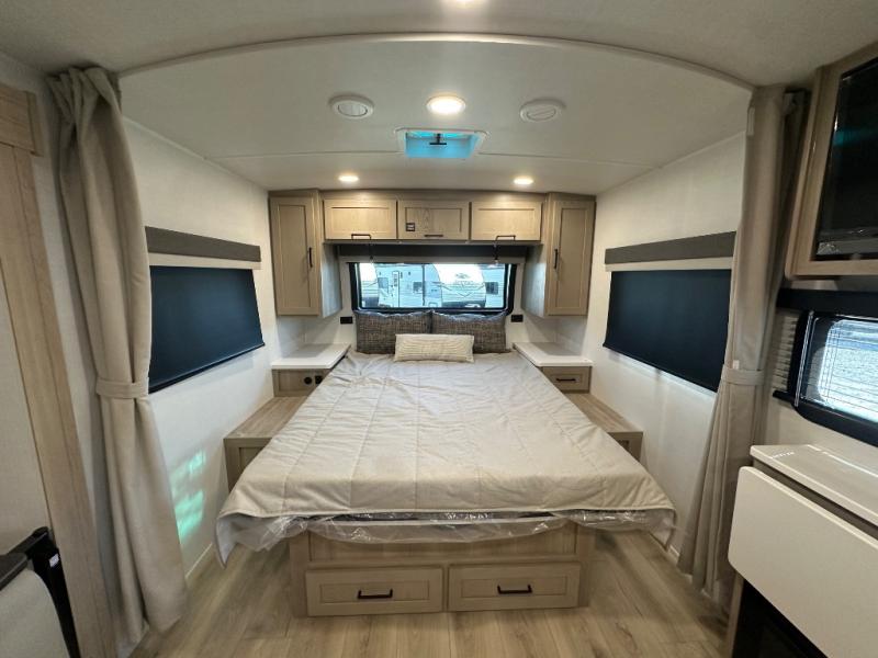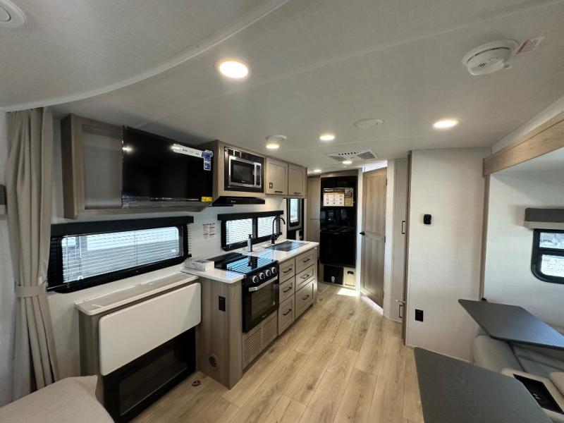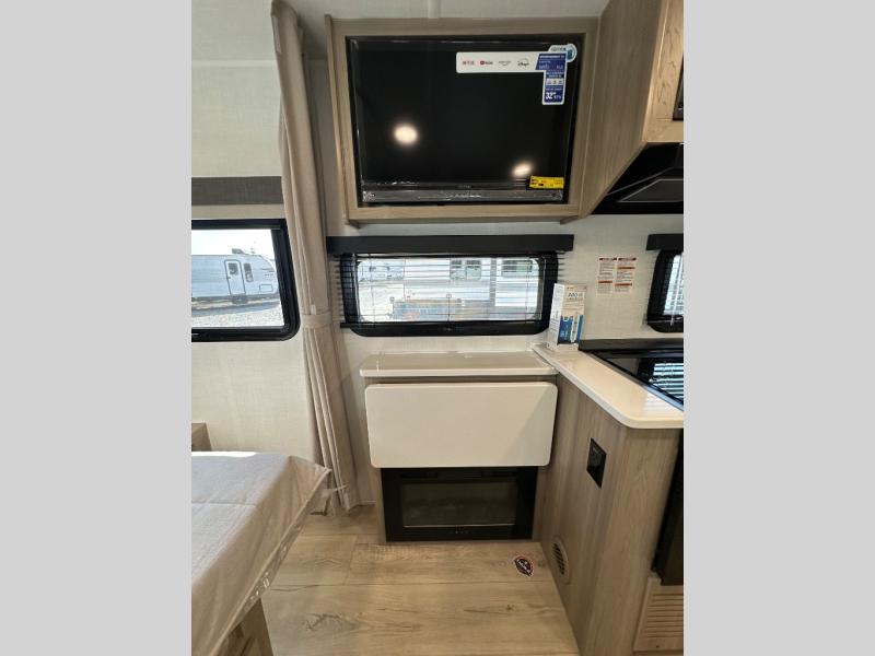 Enjoy the camping season with your spouse, friend, or significant other in this cozy travel trailer for two. Each morning, you can have your coffee on the 67" theater seats with a table within the slide out, then head outdoors to make pancakes on the outdoor griddle with an LP hookup. The interior kitchen includes a three burner cooktop, a microwave oven, plus a 12 volt refrigerator for perishables. An entertainment center with a fireplace will make your space feel more like home, and what's better than sleeping on your own queen bed with dual bedroom wardrobes for your clothes!?