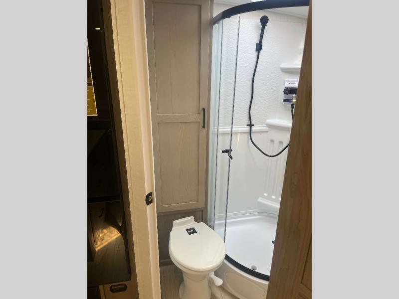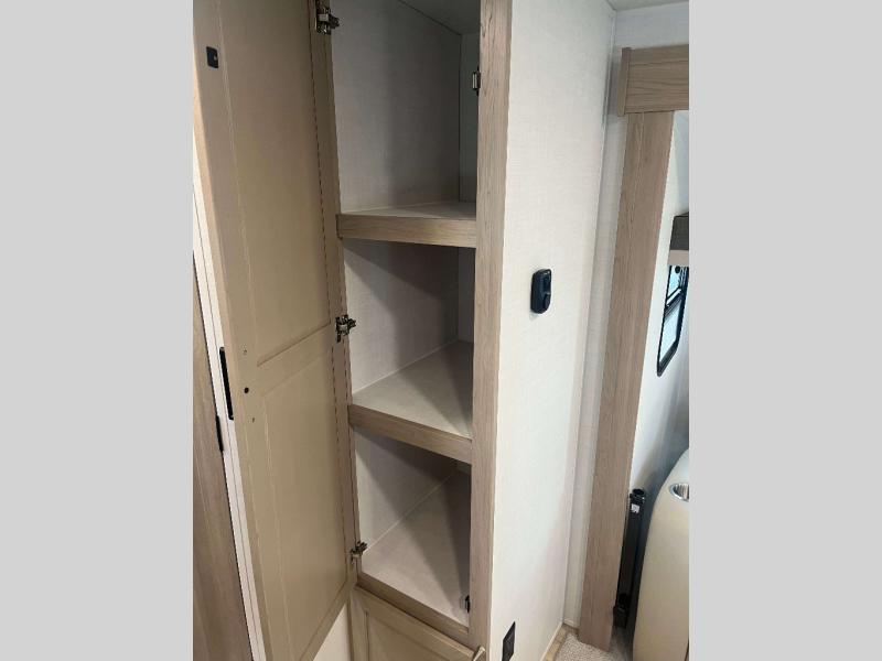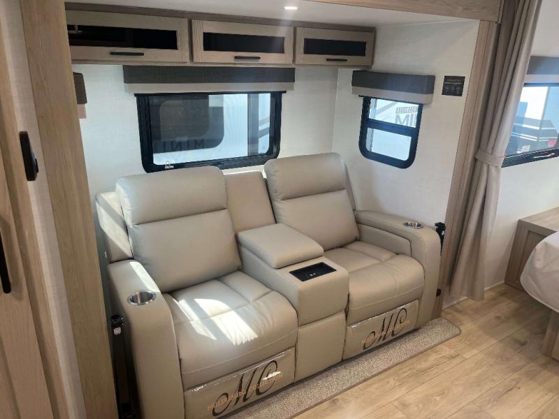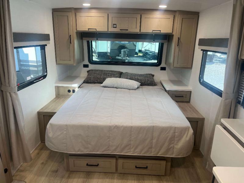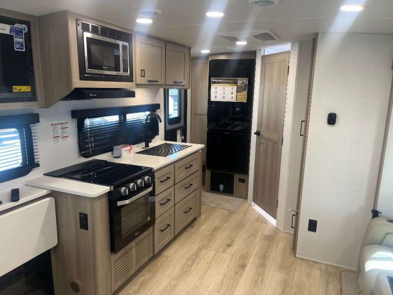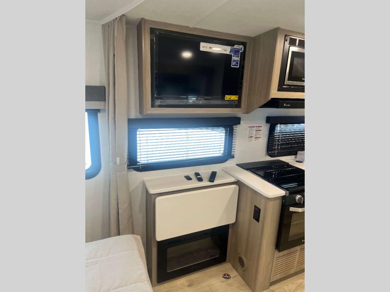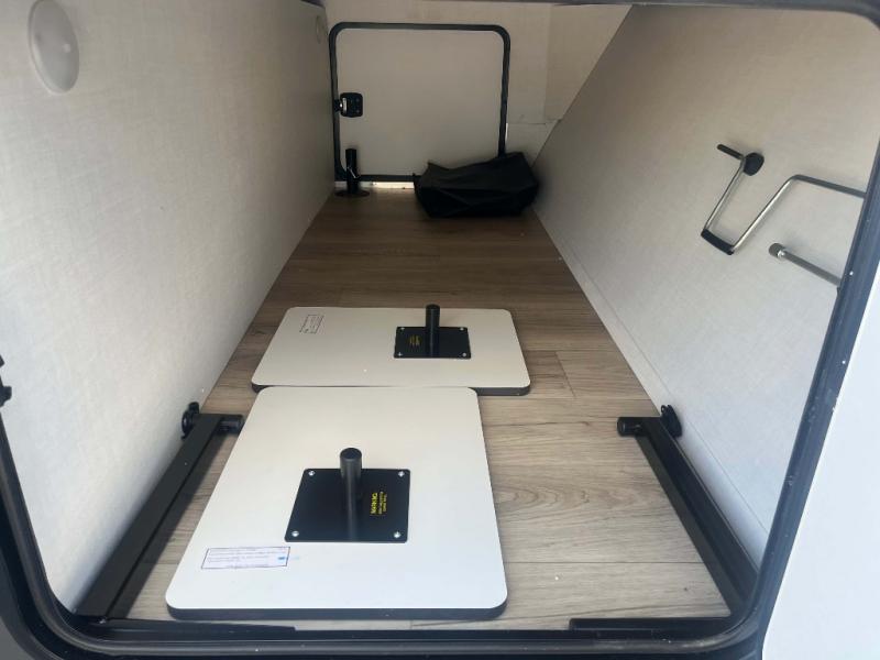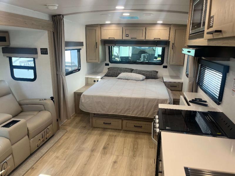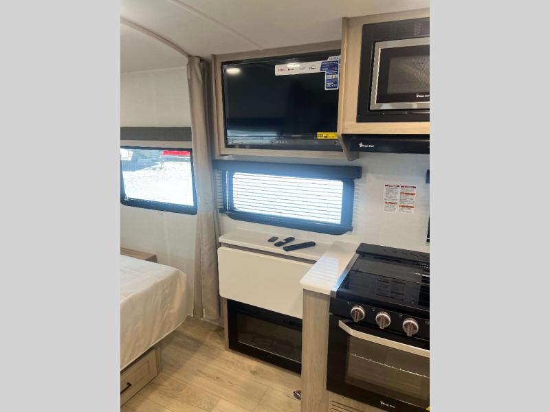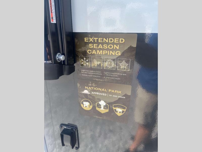 Enjoy the camping season with your spouse, friend, or significant other in this cozy travel trailer for two. Each morning, you can have your coffee on the 67" theater seats with a table within the slide out, then head outdoors to make pancakes on the outdoor griddle with an LP hookup. The interior kitchen includes a three burner cooktop, a microwave oven, plus a 12 volt refrigerator for perishables. An entertainment center with a fireplace will make your space feel more like home, and what's better than sleeping on your own queen bed with dual bedroom wardrobes for your clothes!?