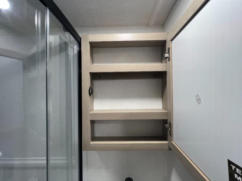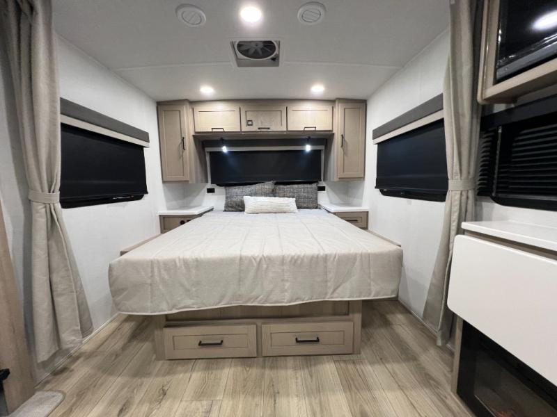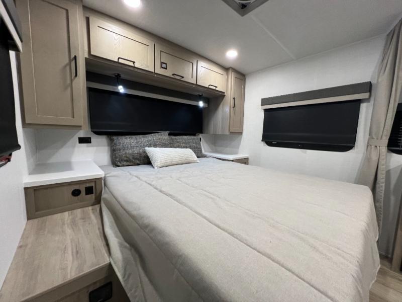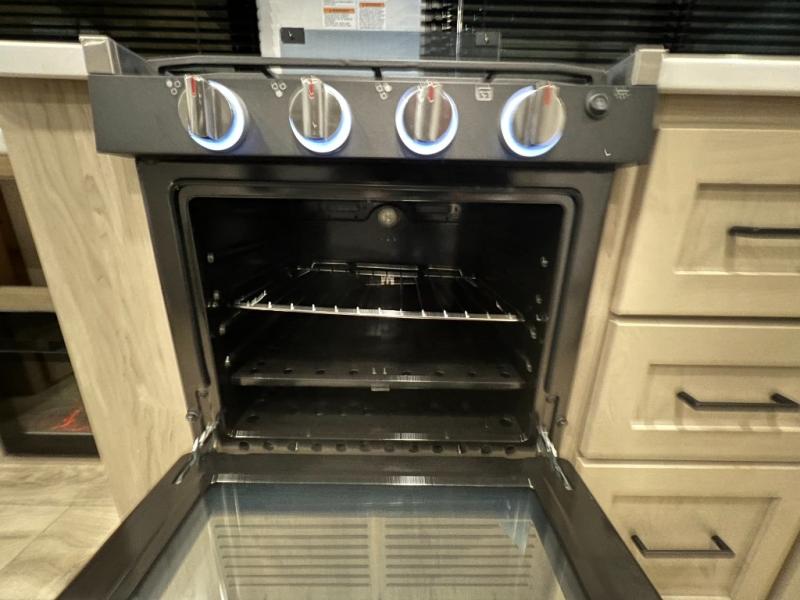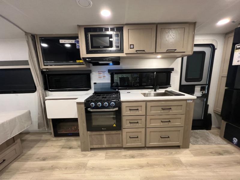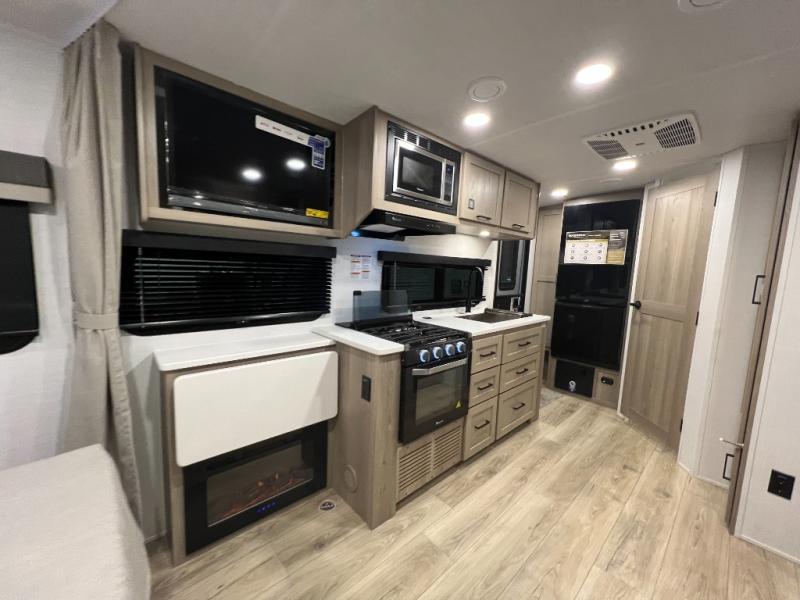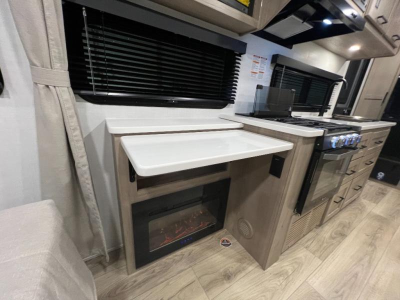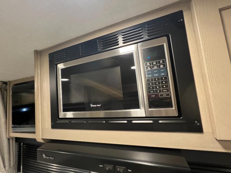 Enjoy the camping season with your spouse, friend, or significant other in this cozy travel trailer for two. Each morning, you can have your coffee on the 67" theater seats with a table within the slide out, then head outdoors to make pancakes on the outdoor griddle with an LP hookup. The interior kitchen includes a three burner cooktop, a microwave oven, plus a 12 volt refrigerator for perishables. An entertainment center with a fireplace will make your space feel more like home, and what's better than sleeping on your own queen bed with dual bedroom wardrobes for your clothes!?