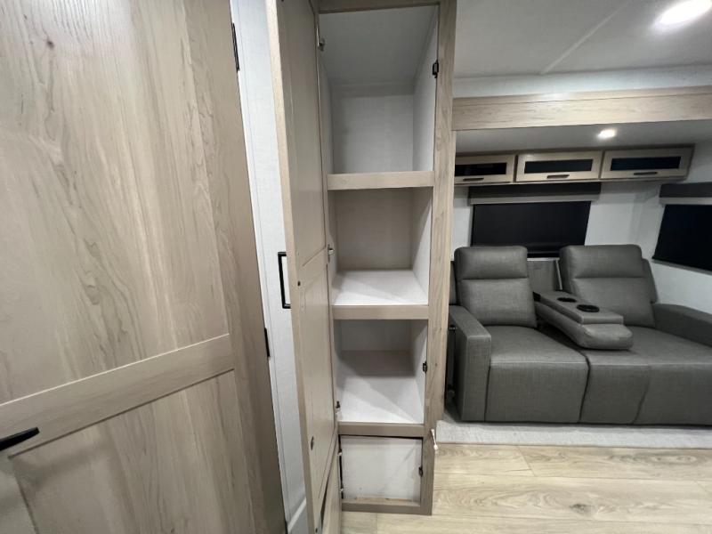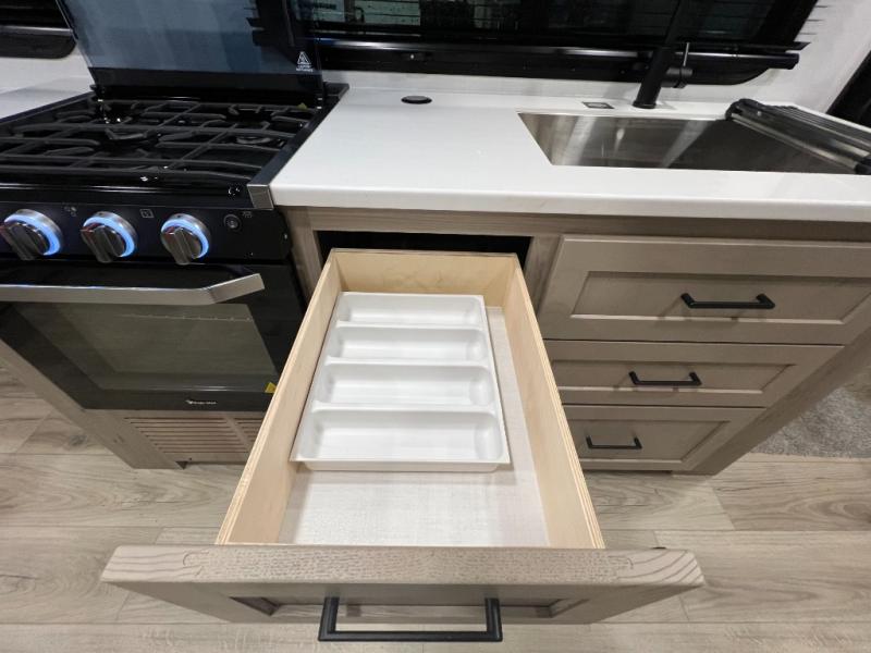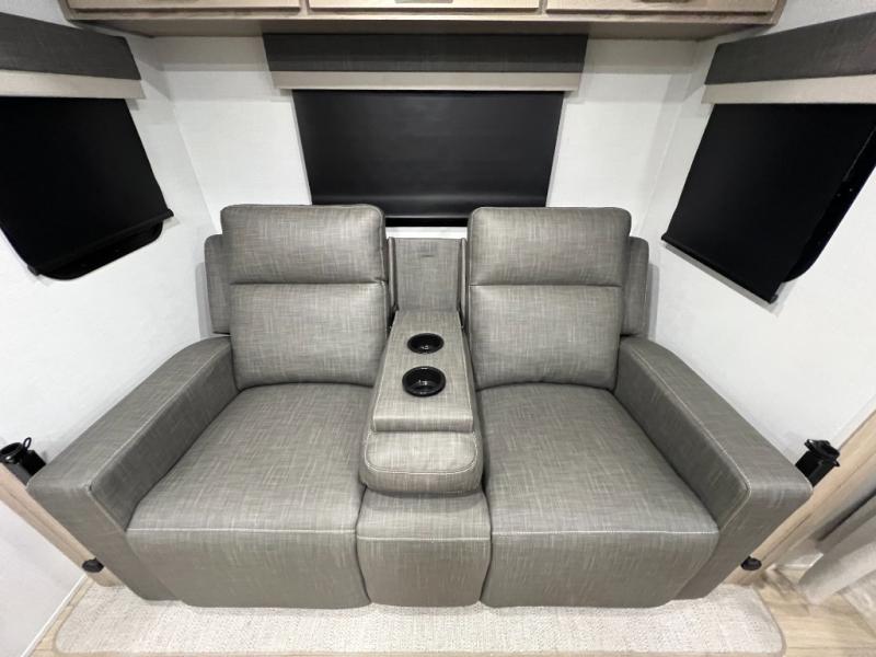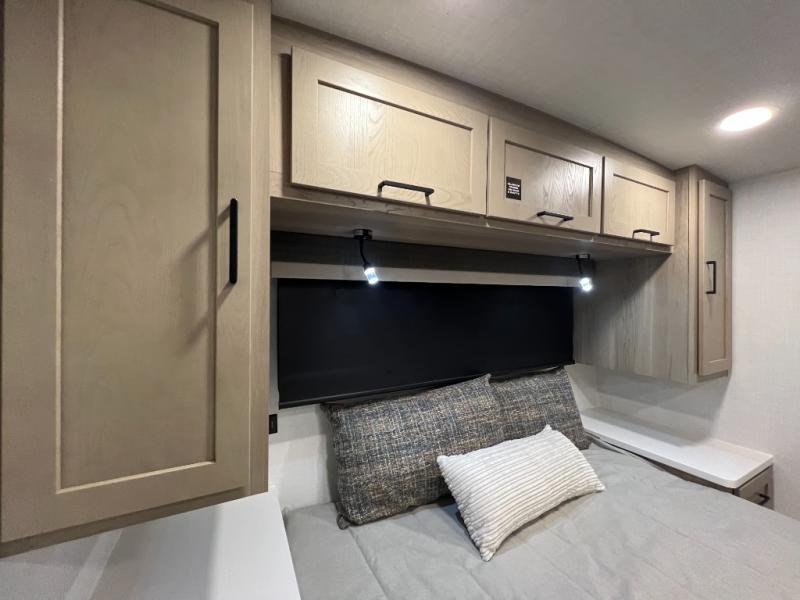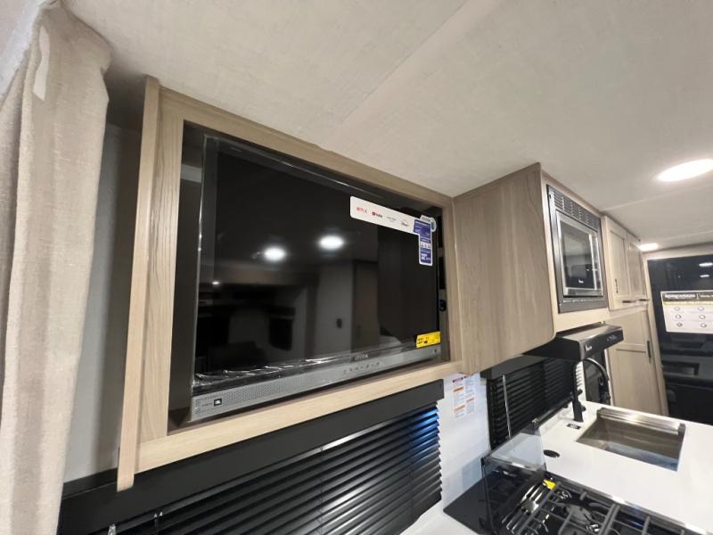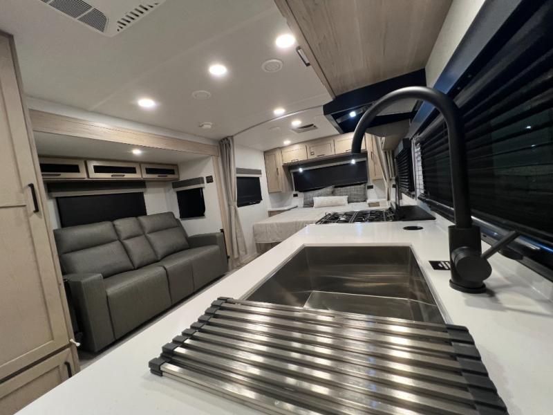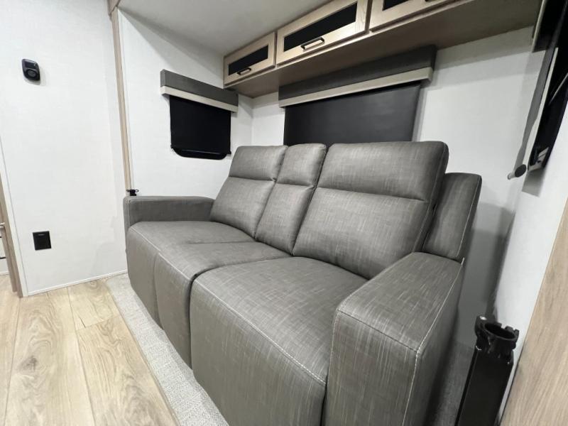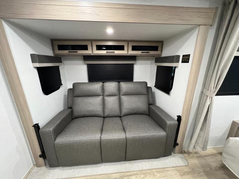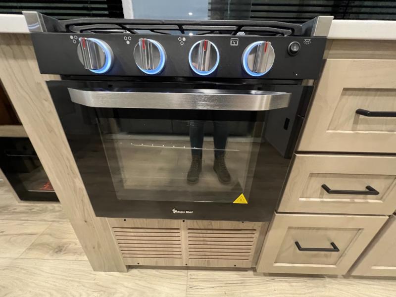 Enjoy the camping season with your spouse, friend, or significant other in this cozy travel trailer for two. Each morning, you can have your coffee on the 67" theater seats with a table within the slide out, then head outdoors to make pancakes on the outdoor griddle with an LP hookup. The interior kitchen includes a three burner cooktop, a microwave oven, plus a 12 volt refrigerator for perishables. An entertainment center with a fireplace will make your space feel more like home, and what's better than sleeping on your own queen bed with dual bedroom wardrobes for your clothes!?