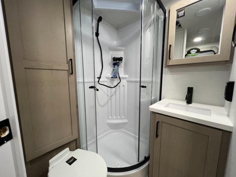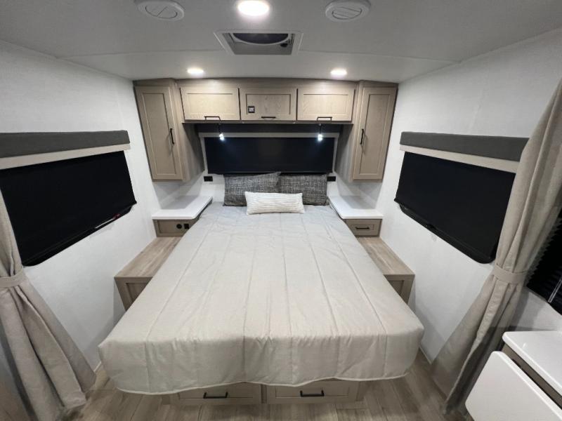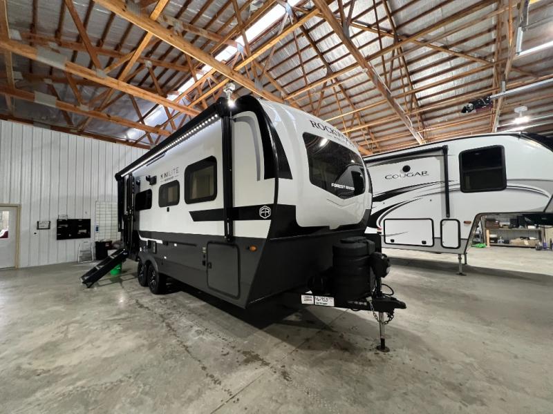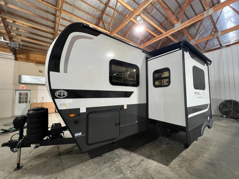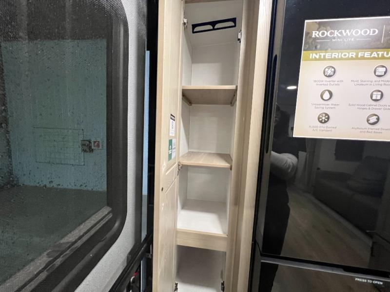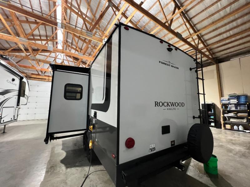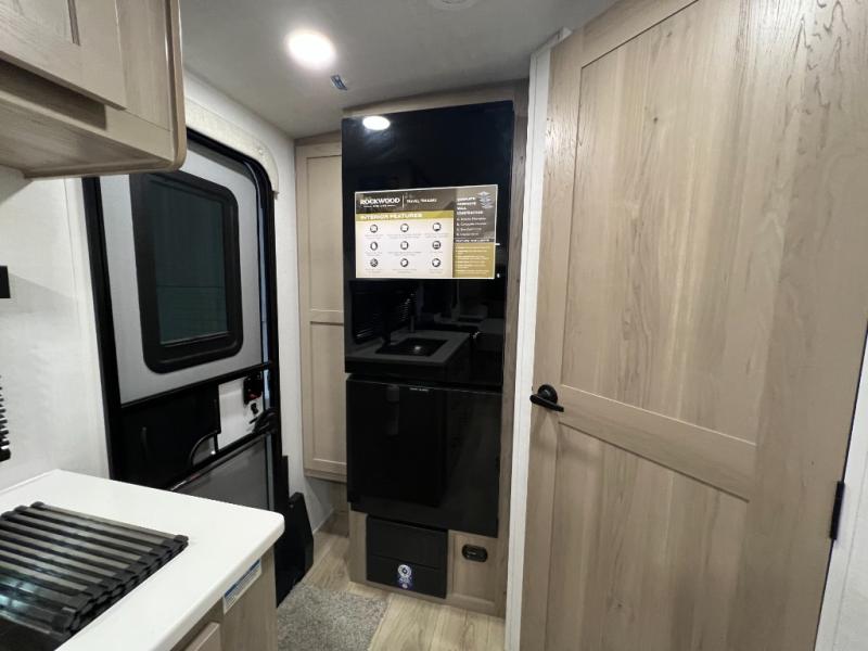 Each Rockwood Mini Lite travel trailer by Forest River is constructed with a fully laminated one-piece walkable roof, sleek frameless windows, and a six-sided full aluminum frame for strength and durability. The 12V thermostatically controlled heated tanks, plus radiant foil in the underbelly will allow you to camp well into the colder months, and the 200W roof solar panel will be perfect for a little off-gridding. Each model includes solid surface kitchen countertops, hidden hinge cabinet doors, roller shades, plus many more interior features. Having an AIR 360+ omnidirectional antenna with WiFi prep on board gives you the option to get some work done if it's needed, and the power tongue jack provides hassle-free set up, so you can enjoy more time relaxing!