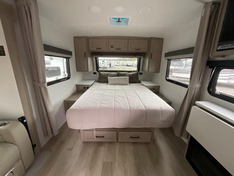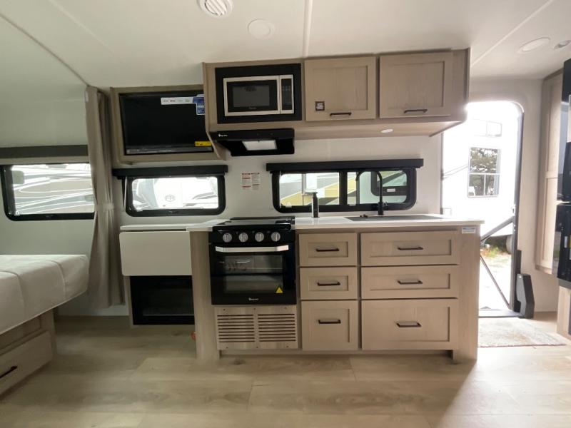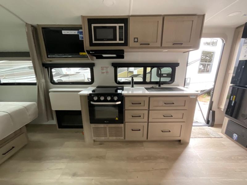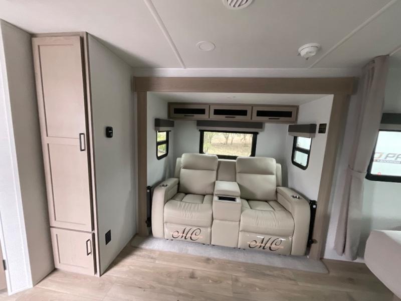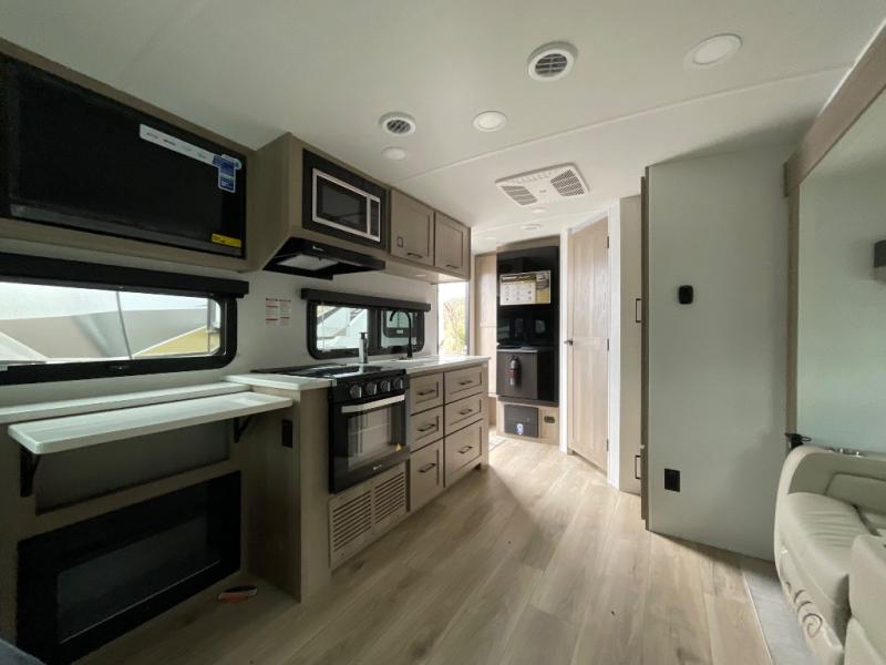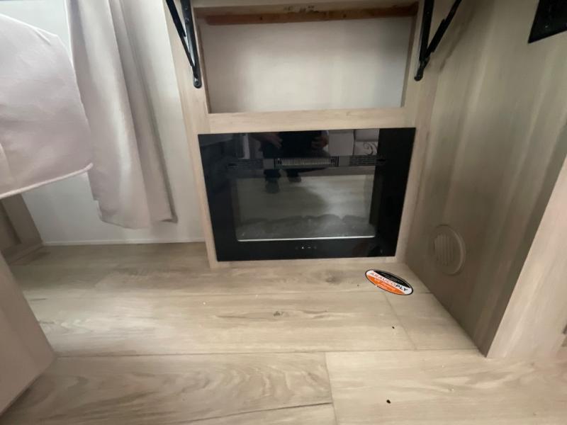 Enjoy the camping season with your spouse, friend, or significant other in this cozy travel trailer for two. Each morning, you can have your coffee on the 67" theater seats with tables within the slide out, then head outdoors to relax under the awning. The interior kitchen includes a three burner cooktop, a microwave oven, plus a 12 volt refrigerator for perishables. An entertainment center with a fireplace will make your space feel more like home, and what's better than sleeping on your own queen bed with dual bedroom wardrobes for your clothes!?