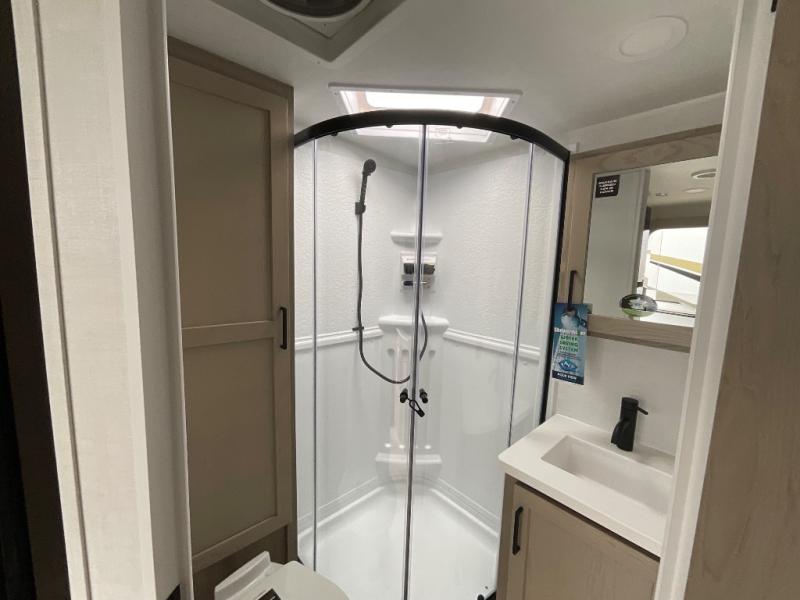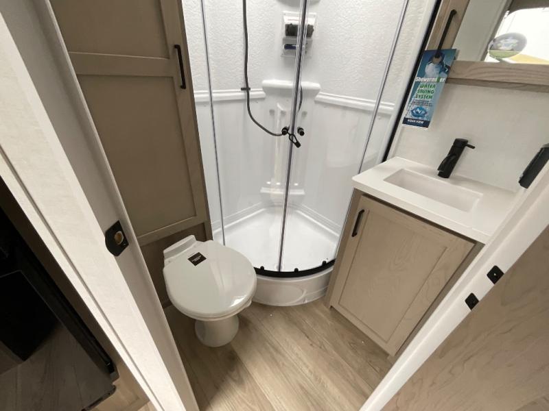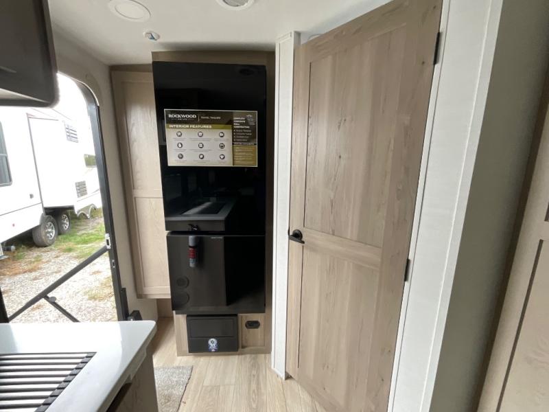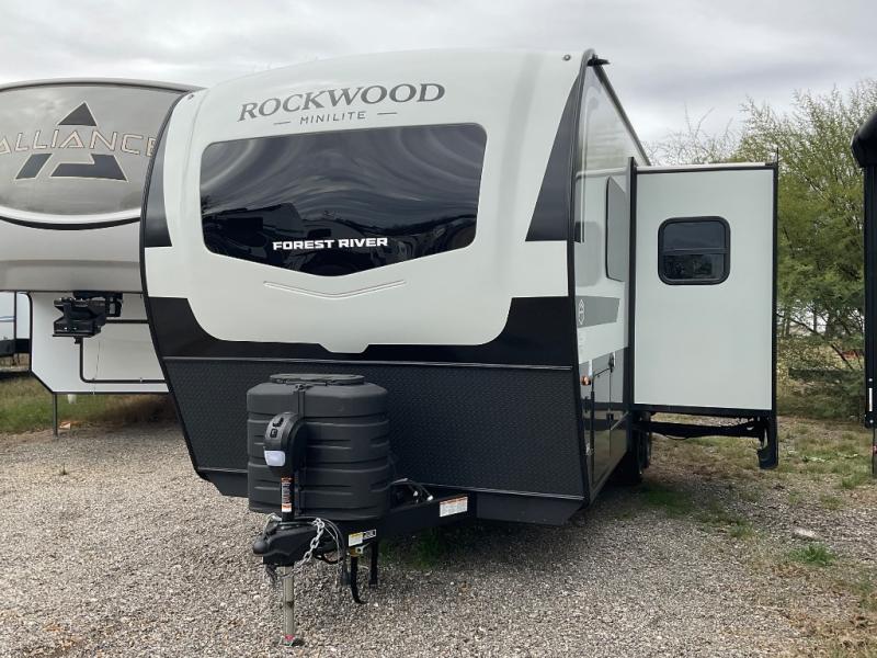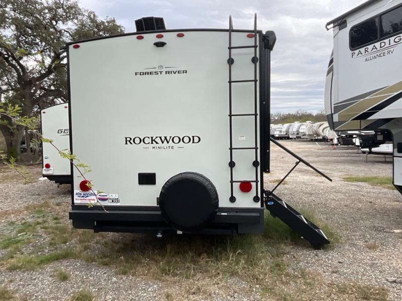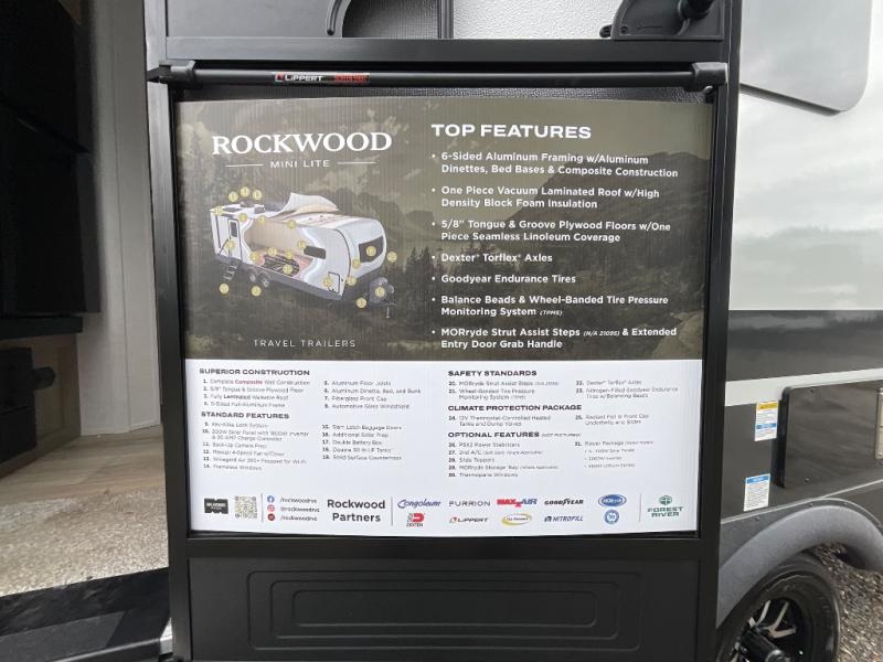Each Rockwood Mini Lite travel trailer by Forest River is constructed with a fully laminated one-piece walkable roof, sleek frameless windows, and a six-sided full aluminum frame for strength and durability. The 12V thermostatically controlled heated tanks, plus radiant foil in the underbelly will allow you to camp well into the colder months, and the 200W roof solar panel will be perfect for a little off-gridding. Each model includes solid surface kitchen countertops, hidden hinge cabinet doors, roller shades, plus many more interior features. Having an AIR 360+ omnidirectional antenna with WiFi prep on board gives you the option to get some work done if it's needed, and the power tongue jack provides hassle-free set up, so you can enjoy more time relaxing!