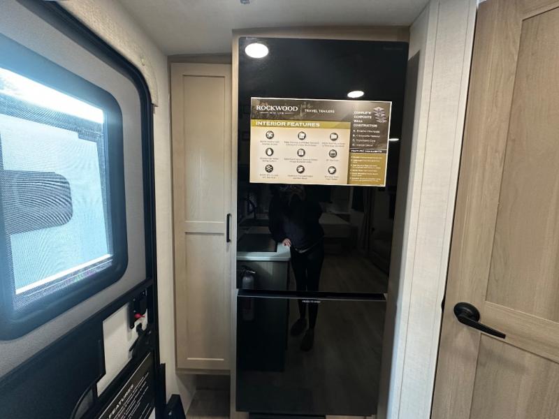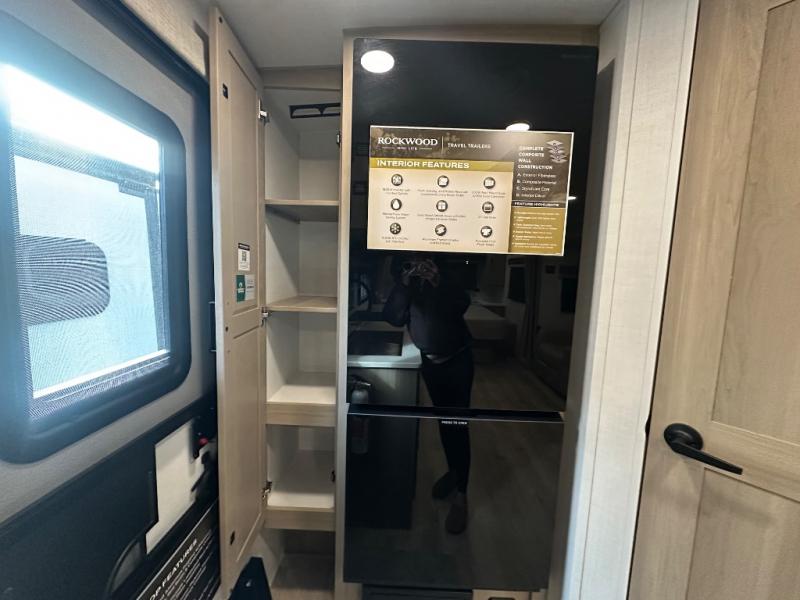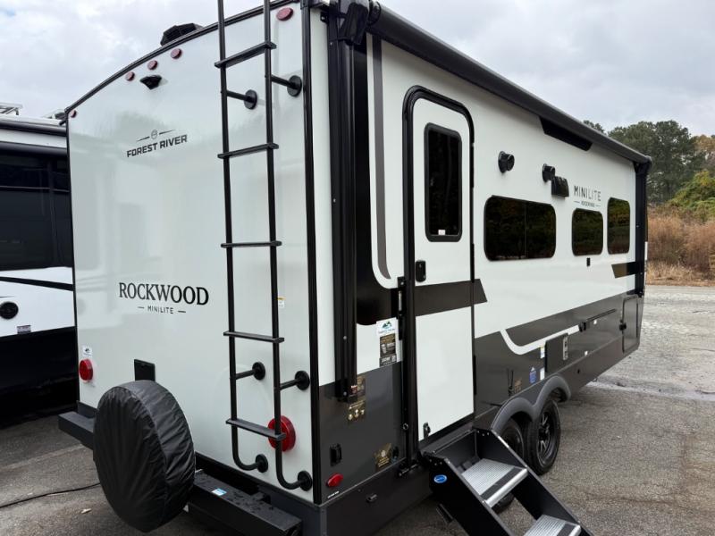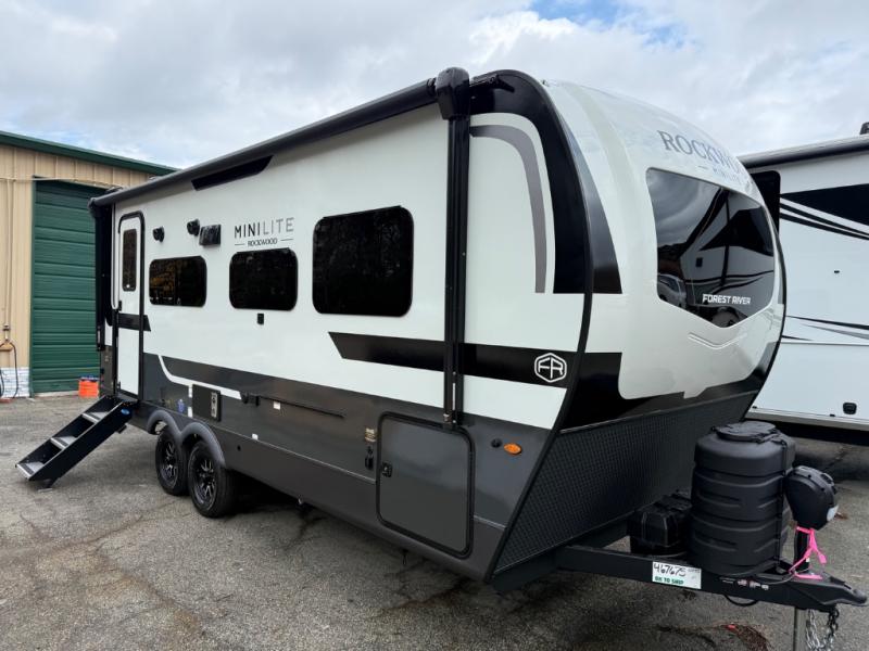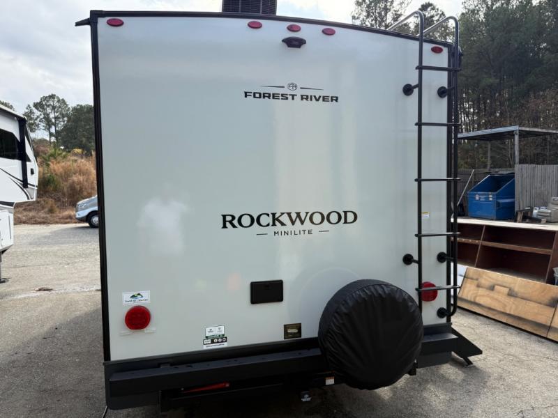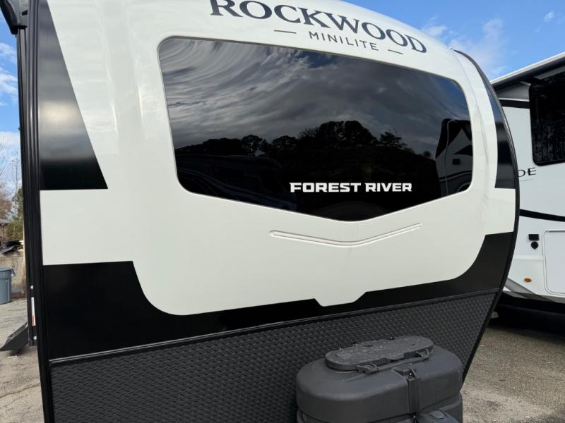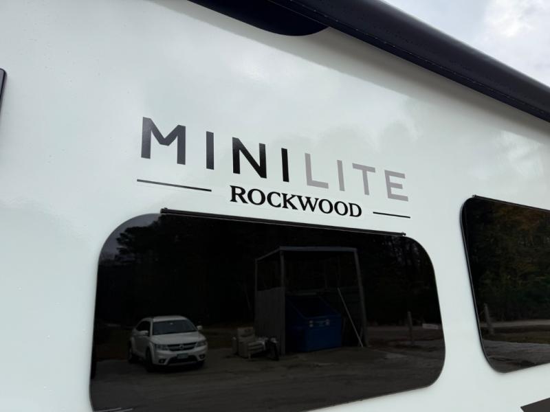 Each Rockwood Mini Lite travel trailer by Forest River is constructed with a fully laminated one-piece walkable roof, sleek frameless windows, and a six-sided full aluminum frame for strength and durability. The 12V thermostatically controlled heated tanks, plus radiant foil in the underbelly will allow you to camp well into the colder months, and the 200W roof solar panel will be perfect for a little off-gridding. Each model includes solid surface kitchen countertops, hidden hinge cabinet doors, roller shades, plus many more interior features. Having an AIR 360+ omnidirectional antenna with WiFi prep on board gives you the option to get some work done if it's needed, and the power tongue jack provides hassle-free set up, so you can enjoy more time relaxing!