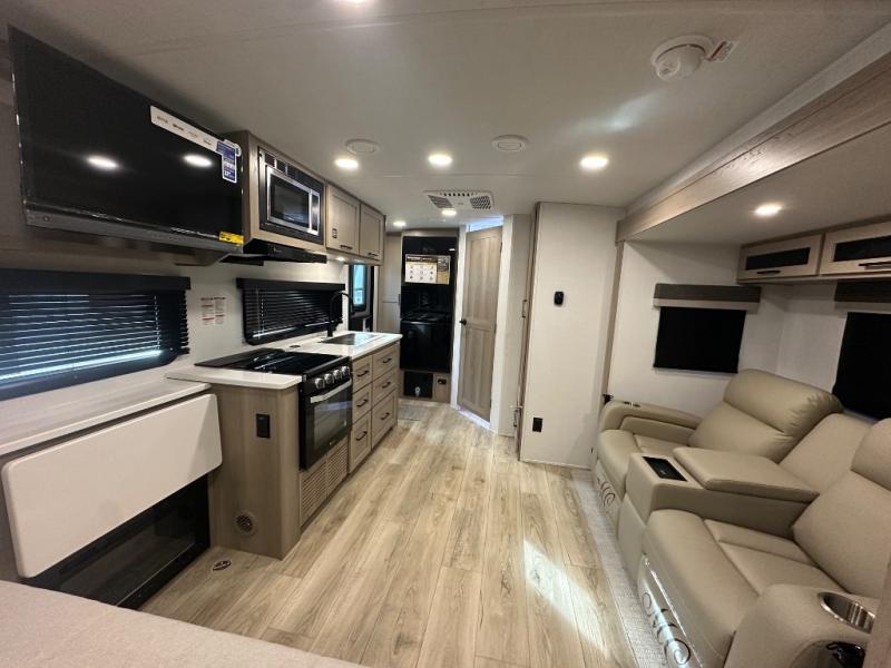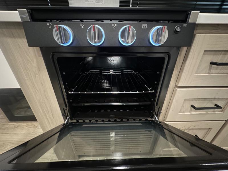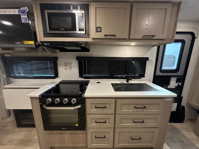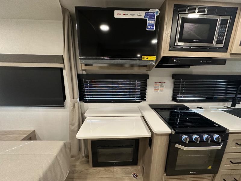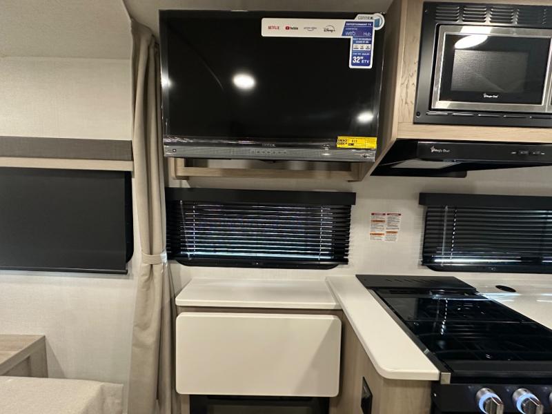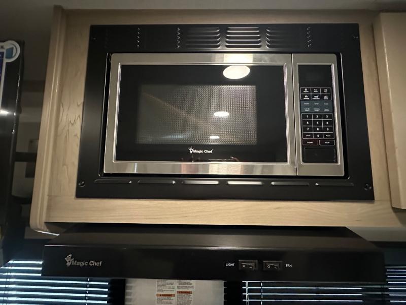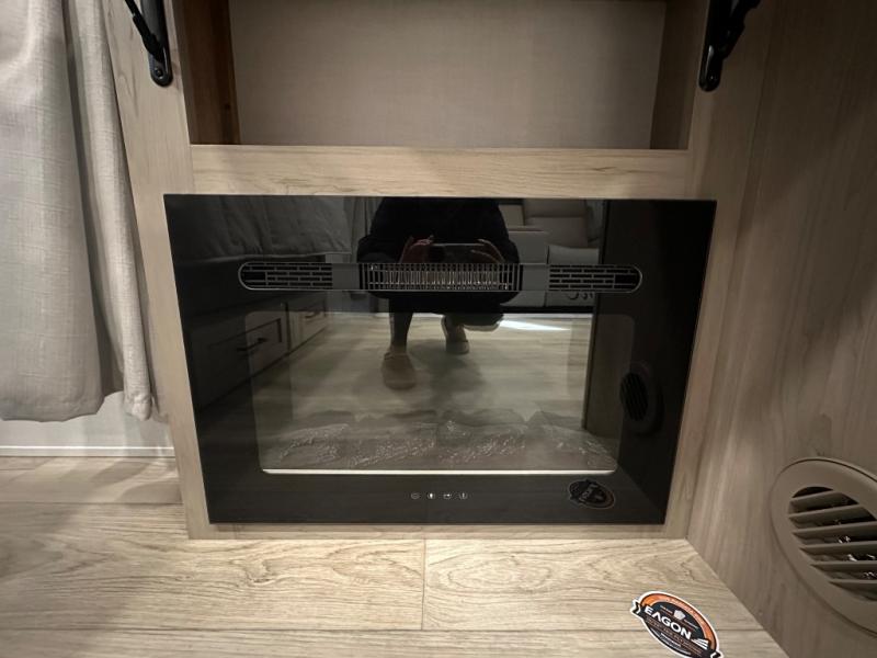 Enjoy the camping season with your spouse, friend, or significant other in this cozy travel trailer for two. Each morning, you can have your coffee on the 67" theater seats with a table within the slide out, then head outdoors to make pancakes on the outdoor griddle with an LP hookup. The interior kitchen includes a three burner cooktop, a microwave oven, plus a 12 volt refrigerator for perishables. An entertainment center with a fireplace will make your space feel more like home, and what's better than sleeping on your own queen bed with dual bedroom wardrobes for your clothes!?