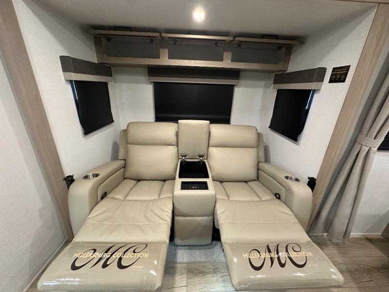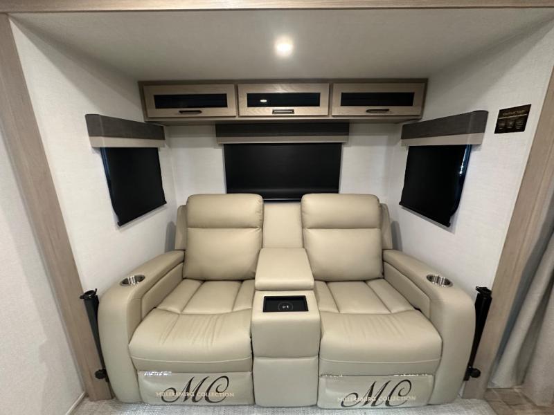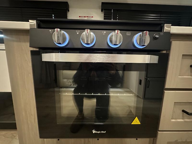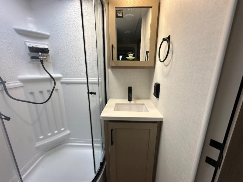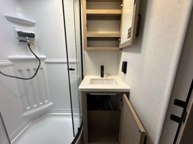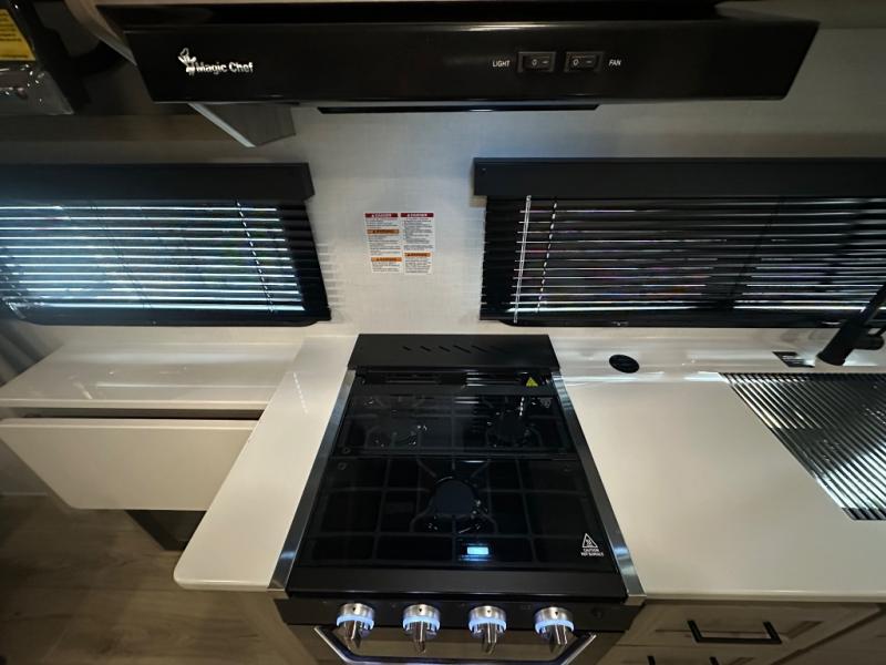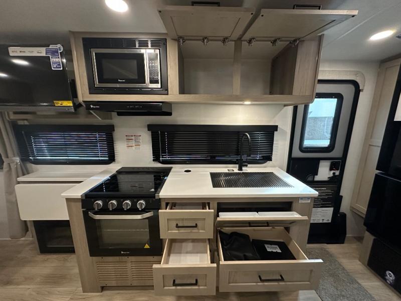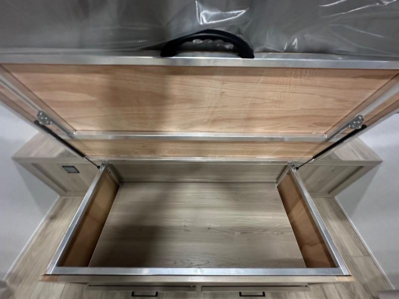 Enjoy the camping season with your spouse, friend, or significant other in this cozy travel trailer for two. Each morning, you can have your coffee on the 67" theater seats with a table within the slide out, then head outdoors to make pancakes on the outdoor griddle with an LP hookup. The interior kitchen includes a three burner cooktop, a microwave oven, plus a 12 volt refrigerator for perishables. An entertainment center with a fireplace will make your space feel more like home, and what's better than sleeping on your own queen bed with dual bedroom wardrobes for your clothes!?