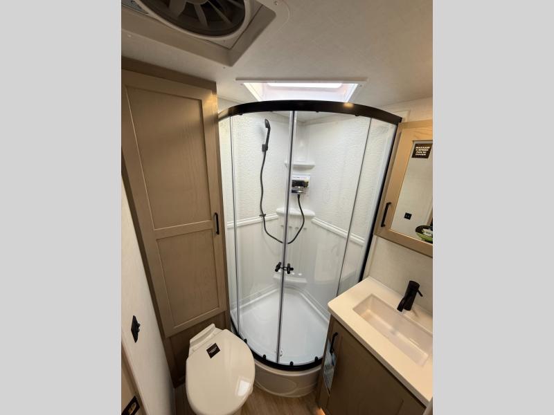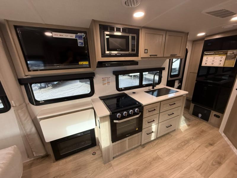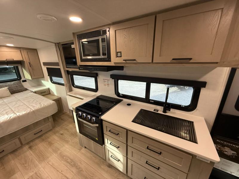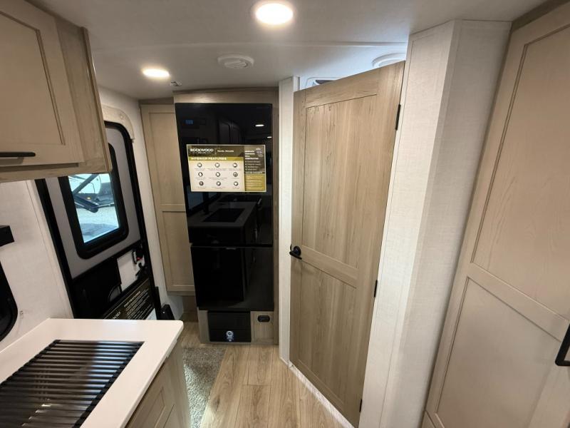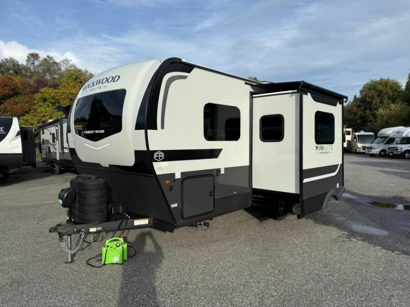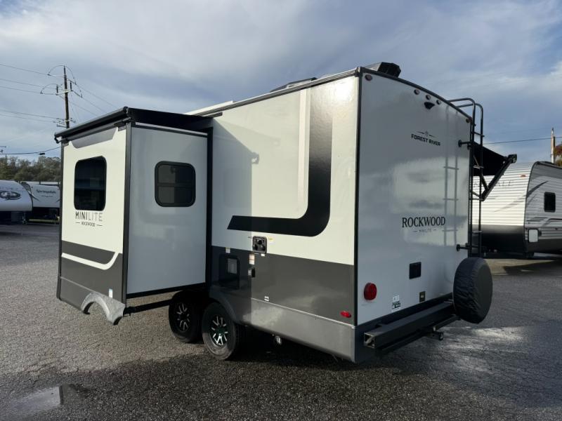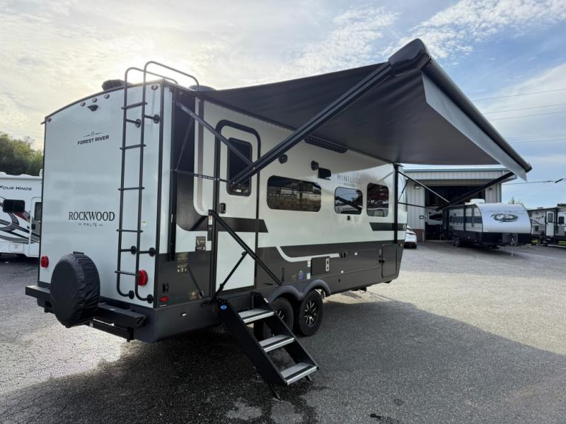 Each Rockwood Mini Lite travel trailer by Forest River is constructed with a fully laminated one-piece walkable roof, sleek frameless windows, and a six-sided full aluminum frame for strength and durability. The 12V thermostatically controlled heated tanks, plus radiant foil in the underbelly will allow you to camp well into the colder months, and the 200W roof solar panel will be perfect for a little off-gridding. Each model includes solid surface kitchen countertops, hidden hinge cabinet doors, roller shades, plus many more interior features. Having an AIR 360+ omnidirectional antenna with WiFi prep on board gives you the option to get some work done if it's needed, and the power tongue jack provides hassle-free set up, so you can enjoy more time relaxing!