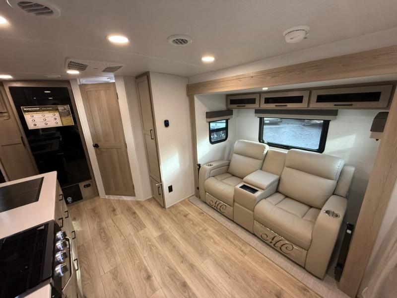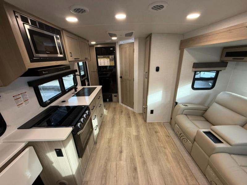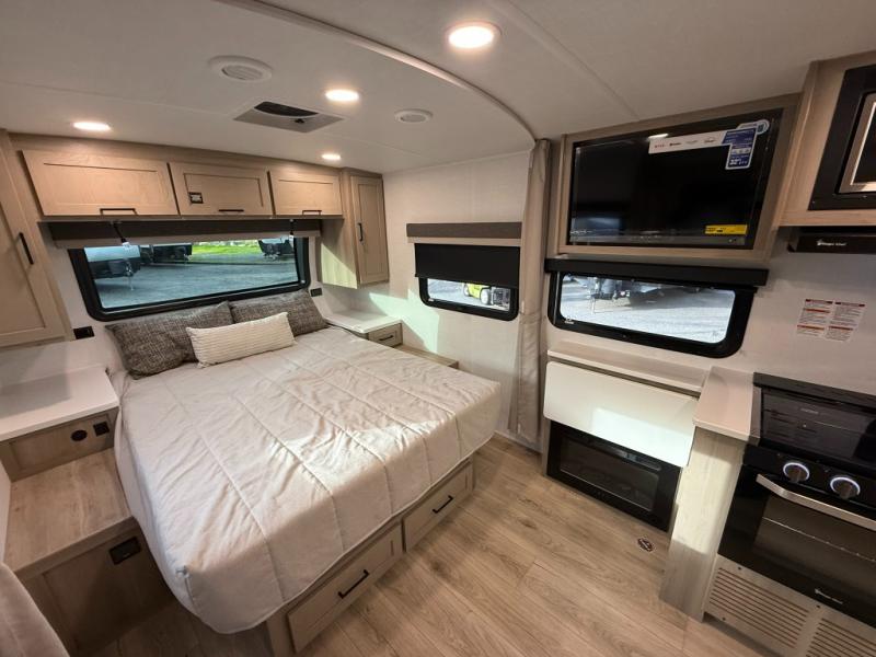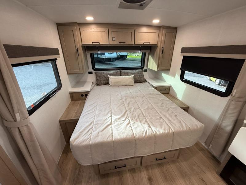 Enjoy the camping season with your spouse, friend, or significant other in this cozy travel trailer for two. Each morning, you can have your coffee on the 67" theater seats with a table within the slide out, then head outdoors to make pancakes on the outdoor griddle with an LP hookup. The interior kitchen includes a three burner cooktop, a microwave oven, plus a 12 volt refrigerator for perishables. An entertainment center with a fireplace will make your space feel more like home, and what's better than sleeping on your own queen bed with dual bedroom wardrobes for your clothes!?
