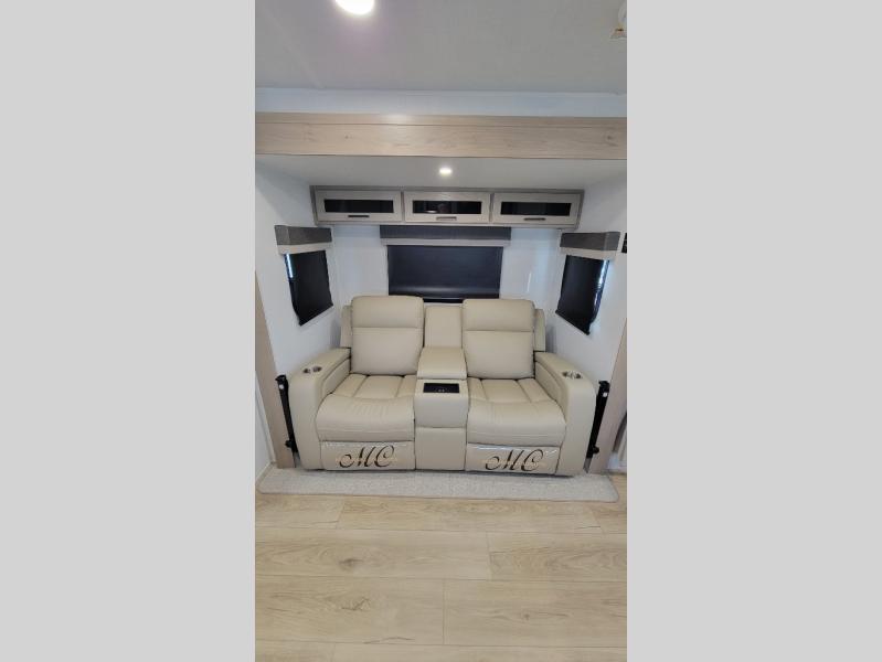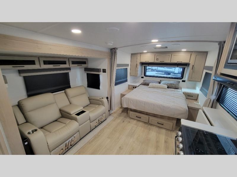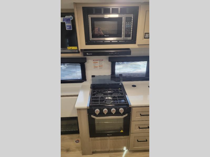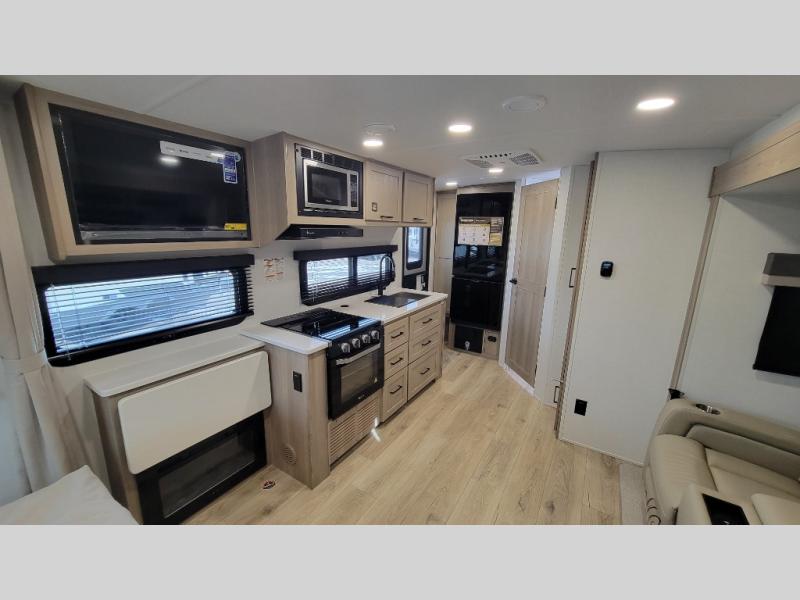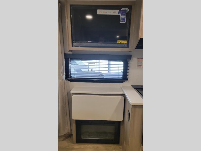 Enjoy the camping season with your spouse, friend, or significant other in this cozy travel trailer for two. Each morning, you can have your coffee on the 67" theater seats with a table within the slide out, then head outdoors to make pancakes on the outdoor griddle with an LP hookup. The interior kitchen includes a three burner cooktop, a microwave oven, plus a 12 volt refrigerator for perishables. An entertainment center with a fireplace will make your space feel more like home, and what's better than sleeping on your own queen bed with dual bedroom wardrobes for your clothes!?
