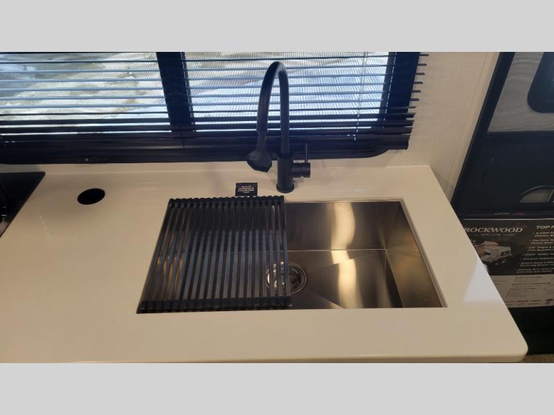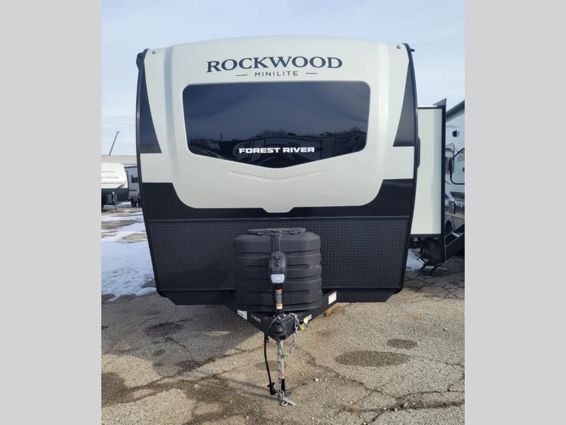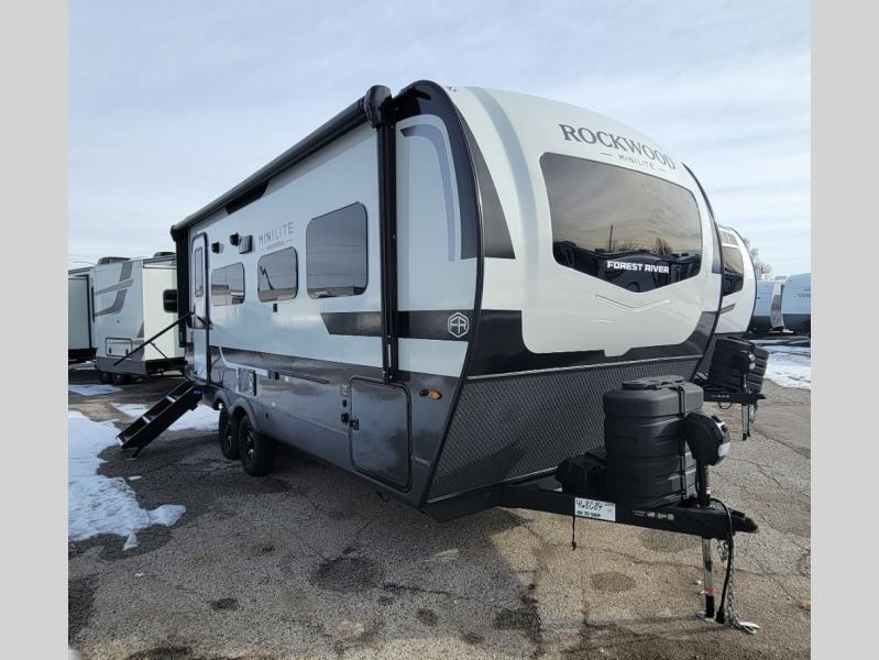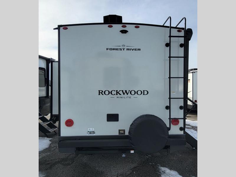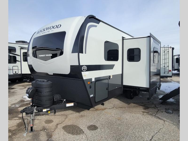 Each Rockwood Mini Lite travel trailer by Forest River is constructed with a fully laminated one-piece walkable roof, sleek frameless windows, and a six-sided full aluminum frame for strength and durability. The 12V thermostatically controlled heated tanks, plus radiant foil in the underbelly will allow you to camp well into the colder months, and the 200W roof solar panel will be perfect for a little off-gridding. Each model includes solid surface kitchen countertops, hidden hinge cabinet doors, roller shades, plus many more interior features. Having an AIR 360+ omnidirectional antenna with WiFi prep on board gives you the option to get some work done if it's needed, and the power tongue jack provides hassle-free set up, so you can enjoy more time relaxing!