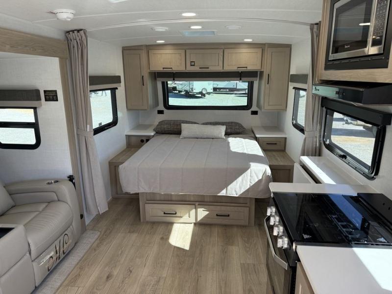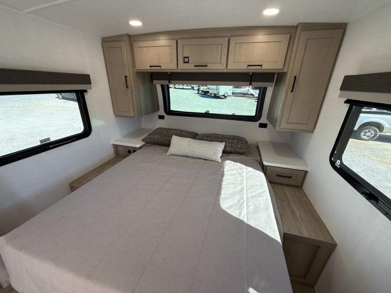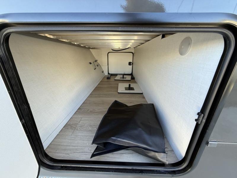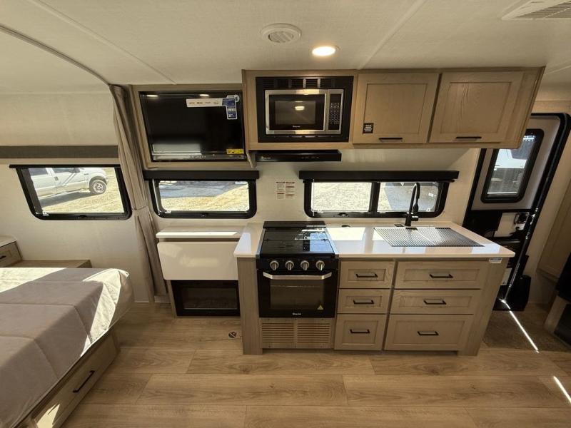 Enjoy the camping season with your spouse, friend, or significant other in this cozy travel trailer for two. Each morning, you can have your coffee on the 67" theater seats with a table within the slide out, then head outdoors to make pancakes on the outdoor griddle with an LP hookup. The interior kitchen includes a three burner cooktop, a microwave oven, plus a 12 volt refrigerator for perishables. An entertainment center with a fireplace will make your space feel more like home, and what's better than sleeping on your own queen bed with dual bedroom wardrobes for your clothes!?