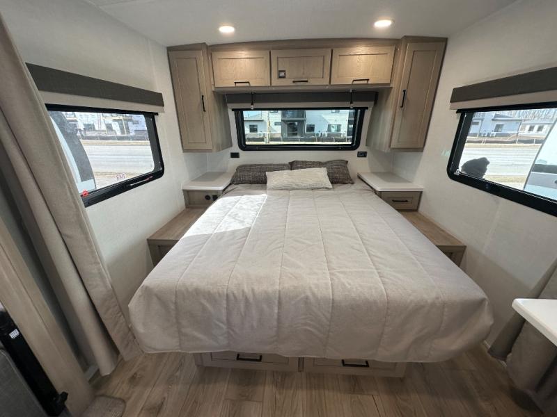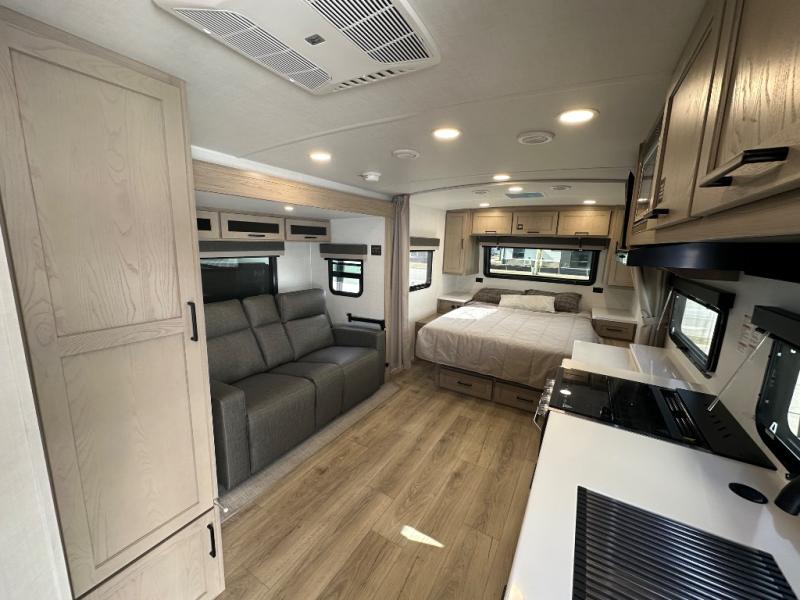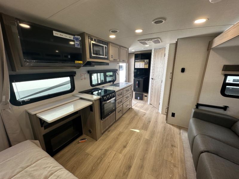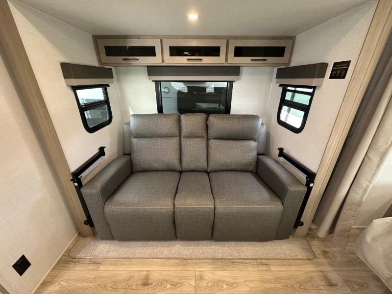 Enjoy the camping season with your spouse, friend, or significant other in this cozy travel trailer for two. Each morning, you can have your coffee on the 67" theater seats with tables within the slide out, then head outdoors to relax under the awning. The interior kitchen includes a three burner cooktop, a microwave oven, plus a 12 volt refrigerator for perishables. An entertainment center with a fireplace will make your space feel more like home, and what's better than sleeping on your own queen bed with dual bedroom wardrobes for your clothes!?