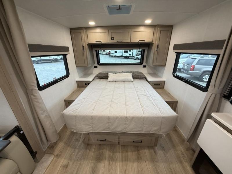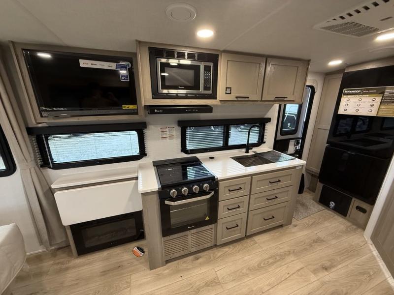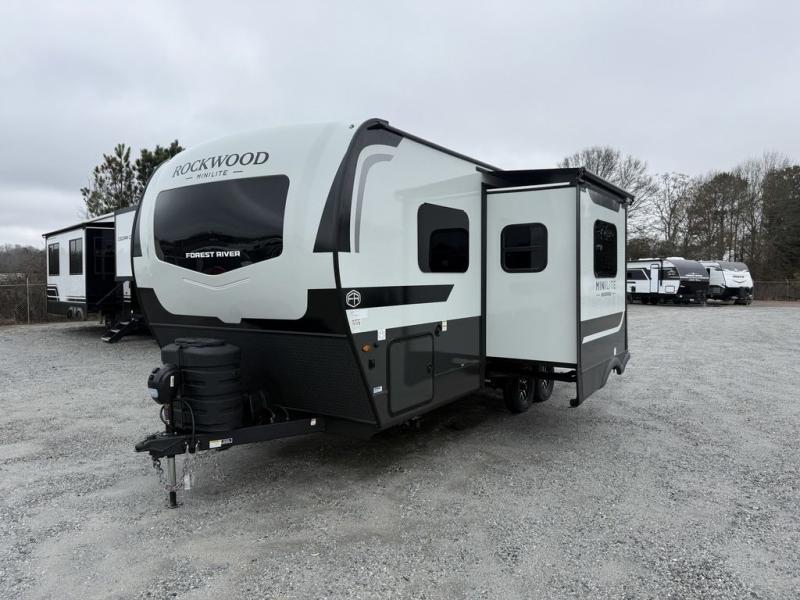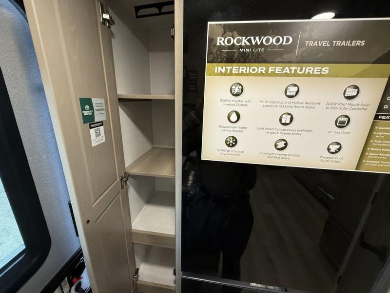 Each Rockwood Mini Lite travel trailer by Forest River is constructed with a fully laminated one-piece walkable roof, sleek frameless windows, and a six-sided full aluminum frame for strength and durability. The 12V thermostatically controlled heated tanks, plus radiant foil in the underbelly will allow you to camp well into the colder months, and the 200W roof solar panel will be perfect for a little off-gridding. Each model includes solid surface kitchen countertops, hidden hinge cabinet doors, roller shades, plus many more interior features. Having an AIR 360+ omnidirectional antenna with WiFi prep on board gives you the option to get some work done if it's needed, and the power tongue jack provides hassle-free set up, so you can enjoy more time relaxing!