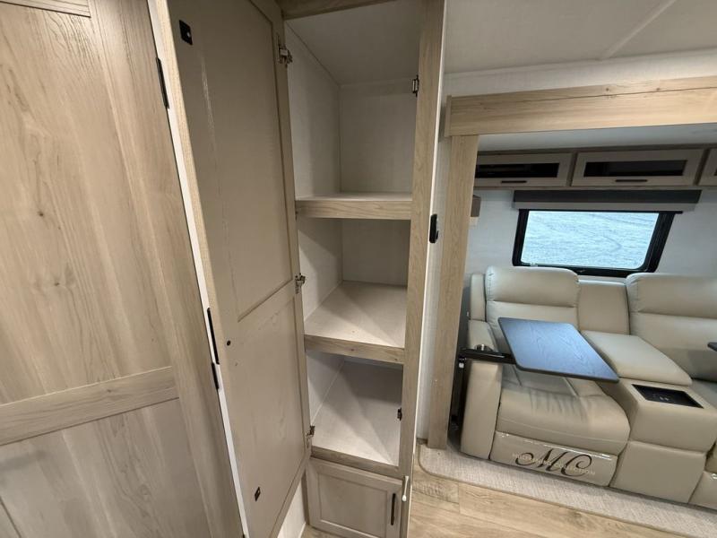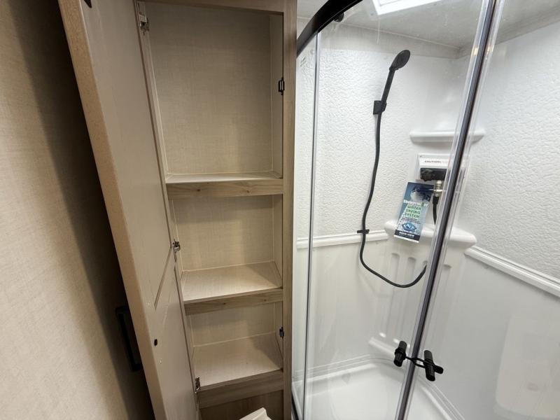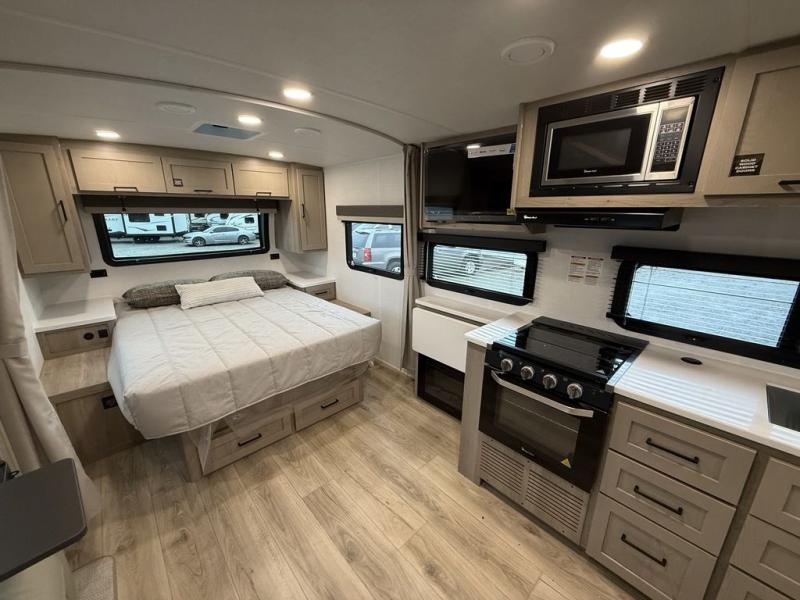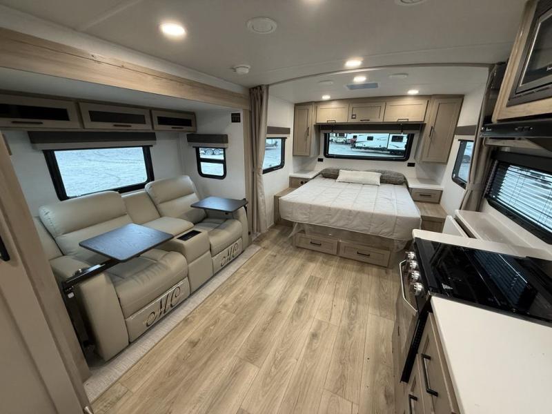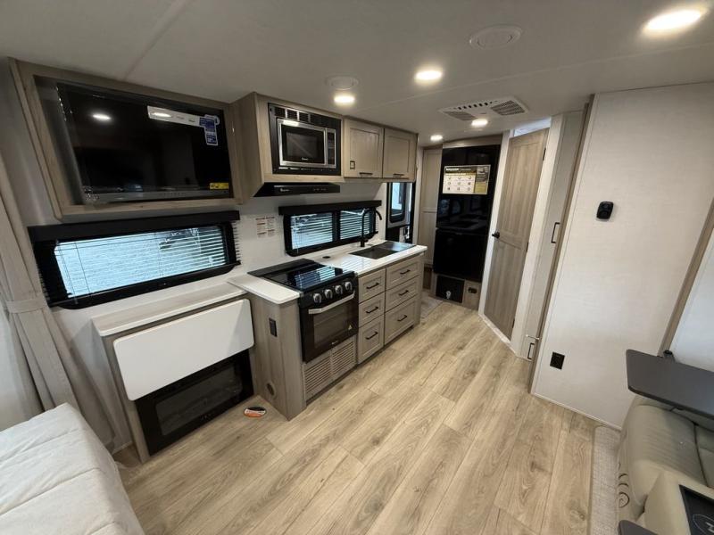 Enjoy the camping season with your spouse, friend, or significant other in this cozy travel trailer for two. Each morning, you can have your coffee on the 67" theater seats with tables within the slide out, then head outdoors to relax under the awning. The interior kitchen includes a three burner cooktop, a microwave oven, plus a 12 volt refrigerator for perishables. An entertainment center with a fireplace will make your space feel more like home, and what's better than sleeping on your own queen bed with dual bedroom wardrobes for your clothes!?