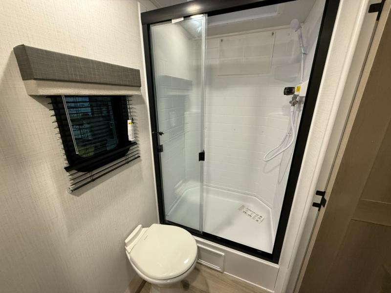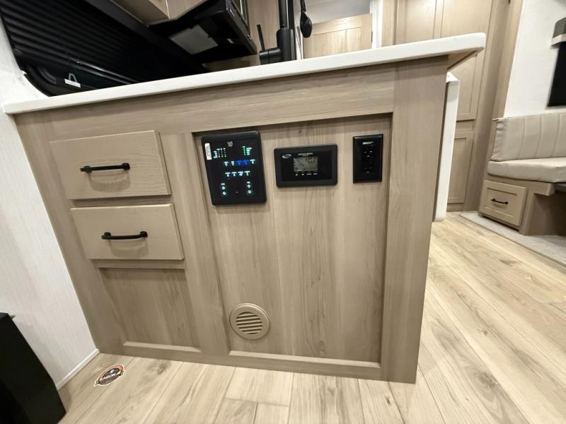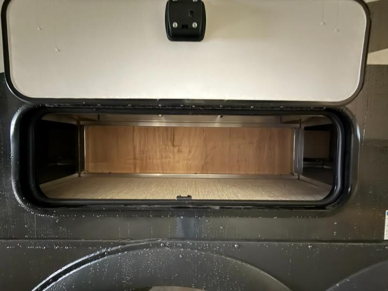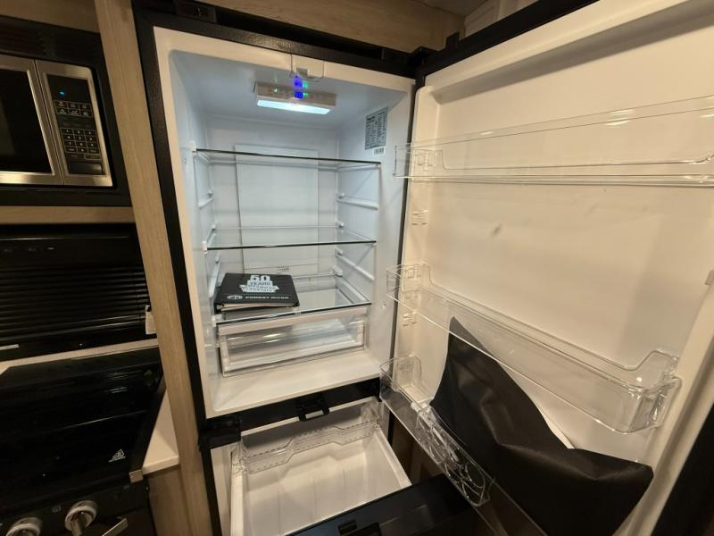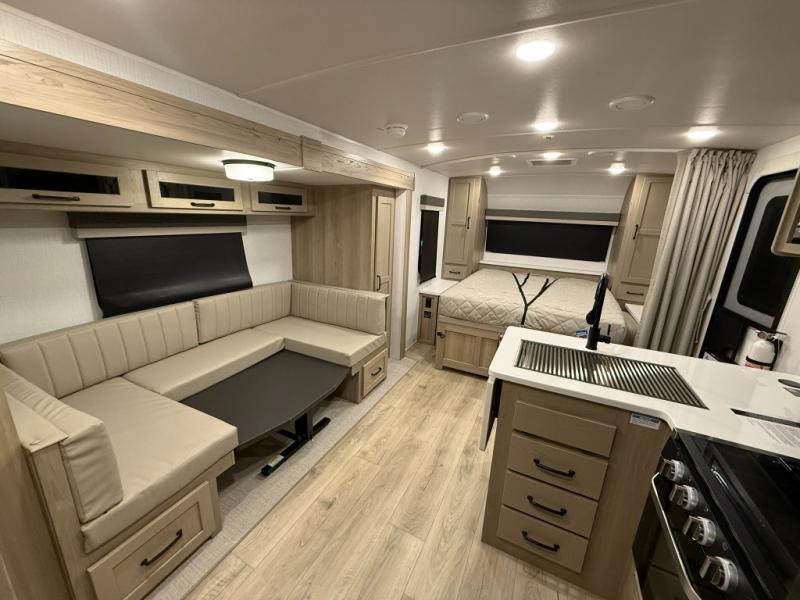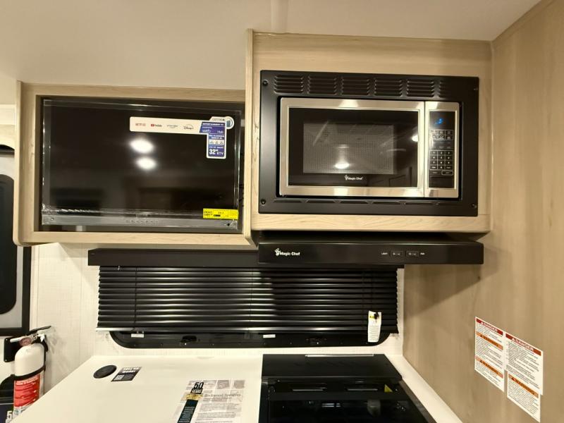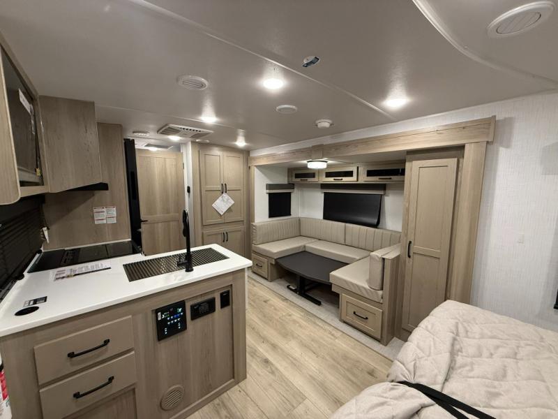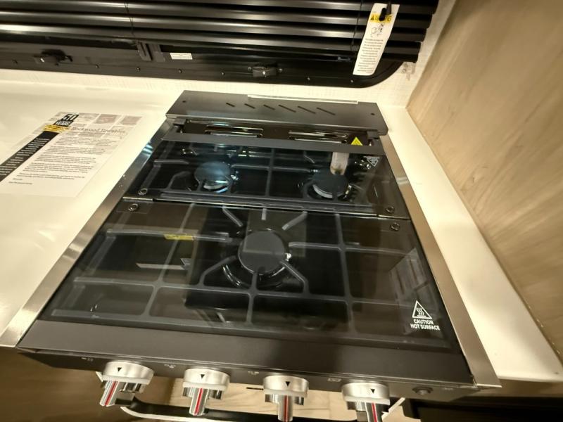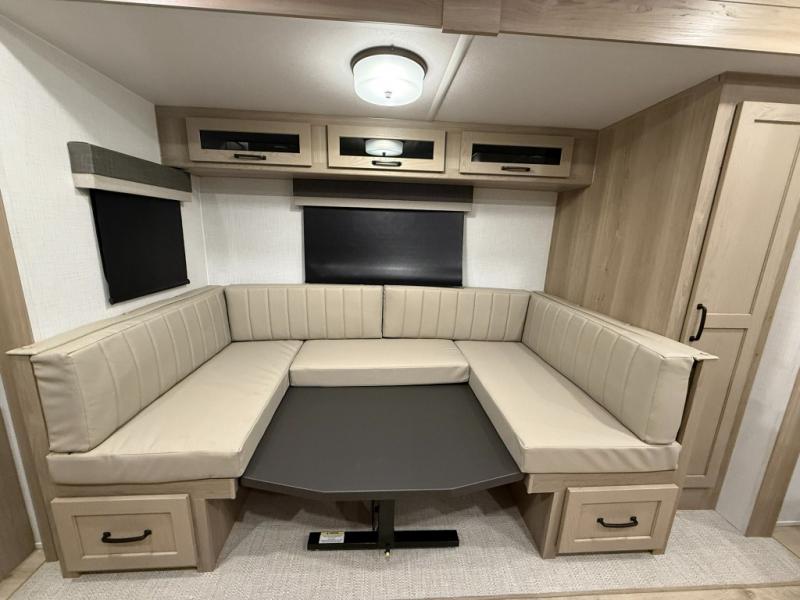 This versatile and cozy travel trailer will be perfect for weekend trips to the lake. Once you arrive at your campground, you can unload the water toys from the pass-thru storage, put out the 15' power awning, then make lunch on the exterior griddle. The U-shaped dinette slide inside will provide a place to dine, play board games, and let a guest or two sleep over, while you take the RV queen-size Murphy bed up front. In the morning, just fold up the bed to expose the 74" sofa! There is a three burner cooktop and microwave oven in the kitchen to make meals each day, along with a 12V refrigerator to keep leftovers fresh.