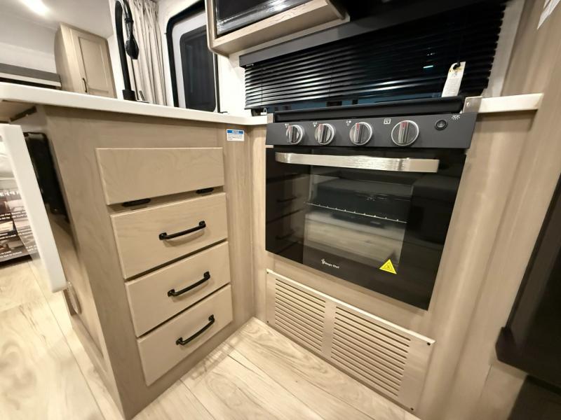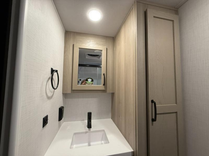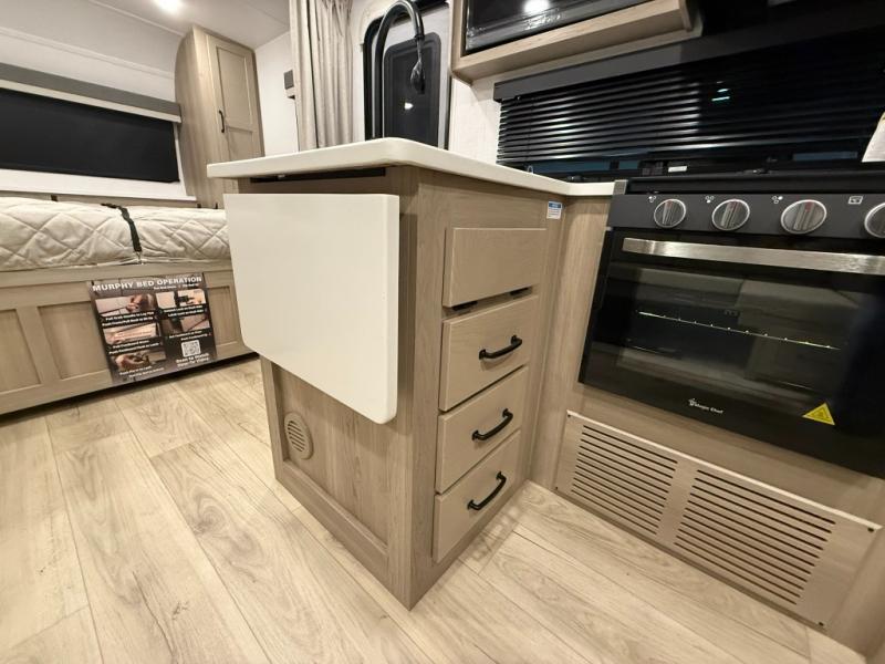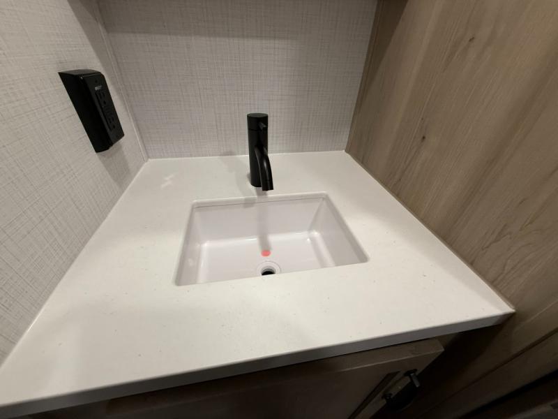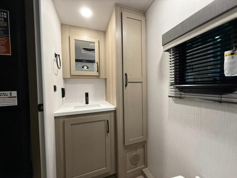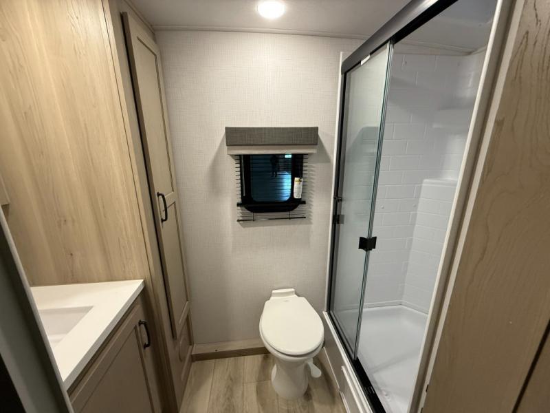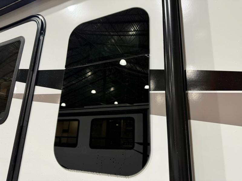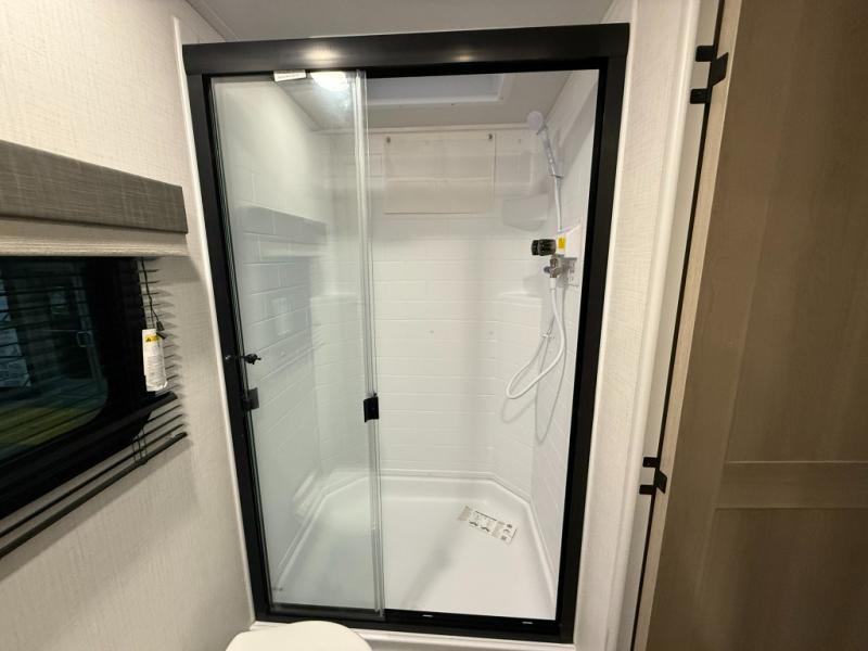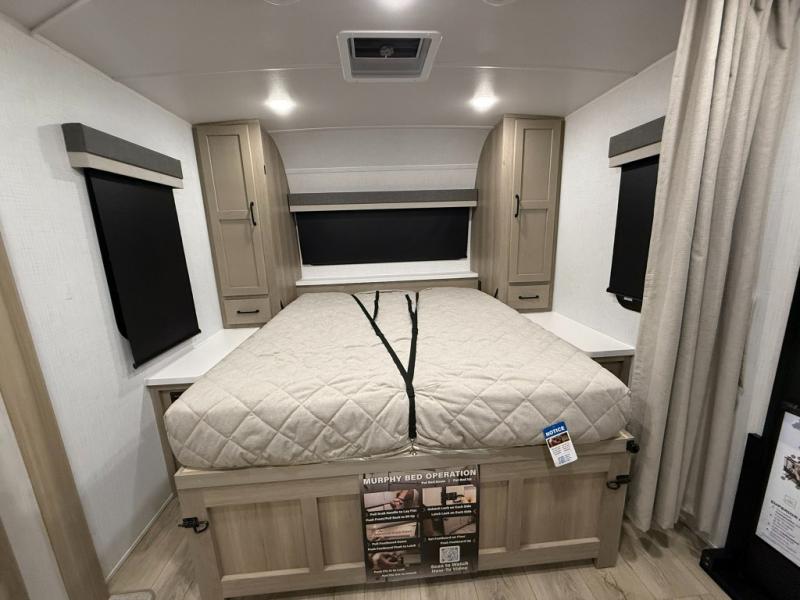 This versatile and cozy travel trailer will be perfect for weekend trips to the lake. Once you arrive at your campground, you can unload the water toys from the pass-thru storage, put out the 15' power awning, then make lunch on the exterior griddle. The U-shaped dinette slide inside will provide a place to dine, play board games, and let a guest or two sleep over, while you take the RV queen-size Murphy bed up front. In the morning, just fold up the bed to expose the 74" sofa! There is a three burner cooktop and microwave oven in the kitchen to make meals each day, along with a 12V refrigerator to keep leftovers fresh.