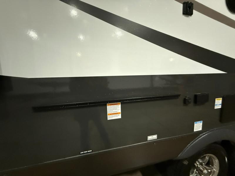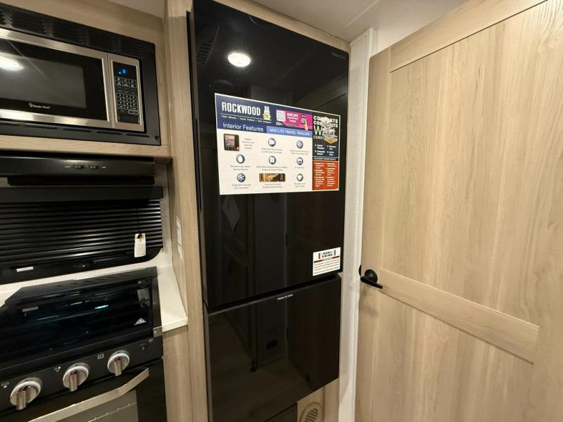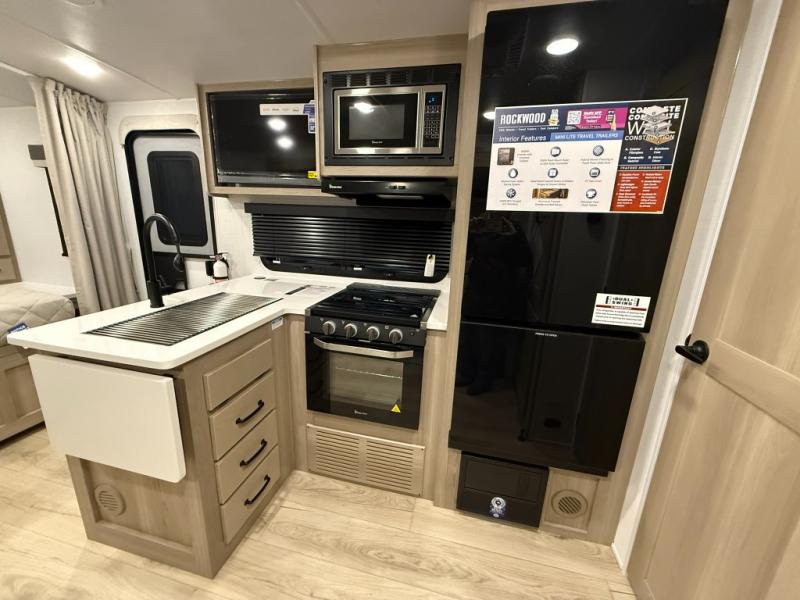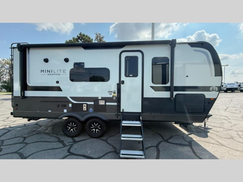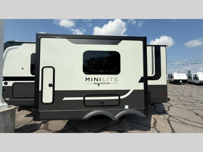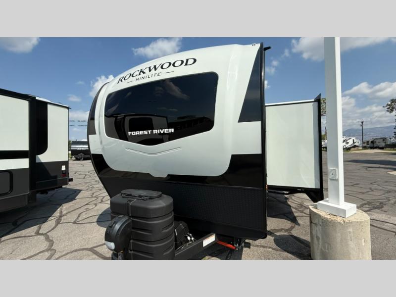 Each Rockwood Mini Lite travel trailer by Forest River is constructed with a fully laminated one-piece walkable roof, sleek frameless windows, and a six-sided full aluminum frame for strength and durability. The 12V thermostatically controlled heated tanks, plus radiant foil in the underbelly will allow you to camp well into the colder months, and the 200W roof solar panel will be perfect for a little off-gridding. Each model includes solid surface kitchen countertops, hidden hinge cabinet doors, roller shades, plus many more interior features. Having an AIR 360+ omnidirectional antenna with WiFi prep on board gives you the option to get some work done if it's needed, and the power tongue jack provides hassle-free set up, so you can enjoy more time relaxing!