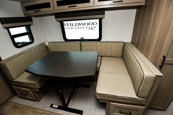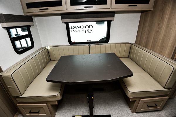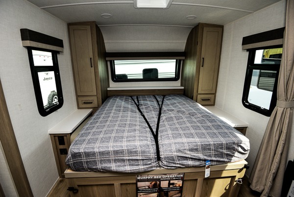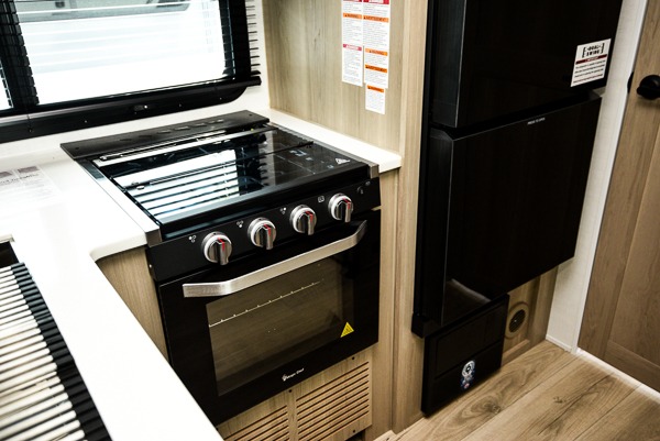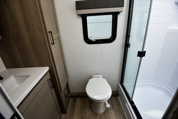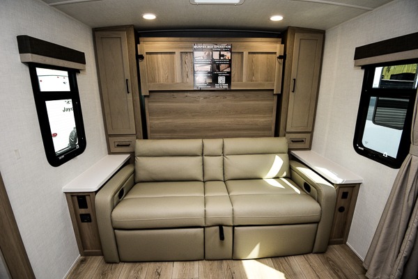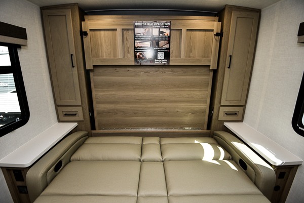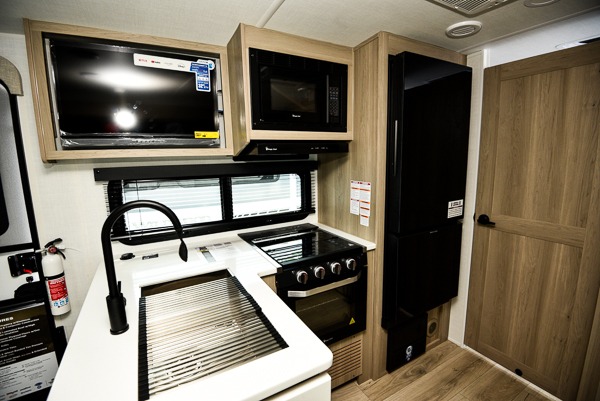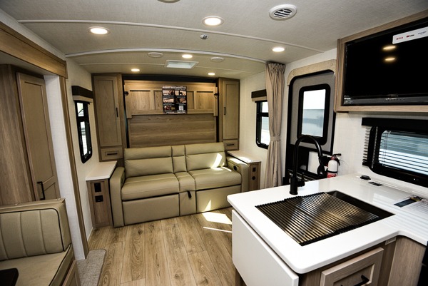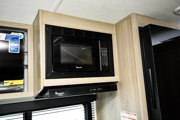 This versatile and cozy travel trailer will be perfect for weekend trips to the lake. Once you arrive at your campground, you can unload the water toys from the pass-thru storage, put out the 15' power awning, then make lunch on the exterior griddle. The U-shaped dinette slide inside will provide a place to dine, play board games, and let a guest or two sleep over, while you take the RV queen-size Murphy bed up front. In the morning, just fold up the bed to expose the 74" sofa! There is a three burner cooktop and microwave oven in the kitchen to make meals each day, along with a 12V refrigerator to keep leftovers fresh.