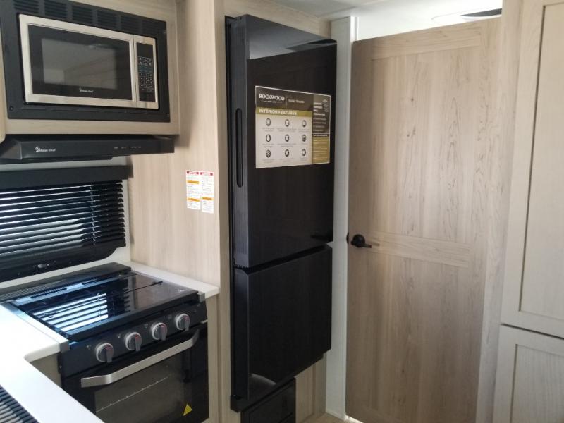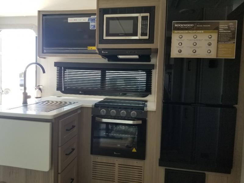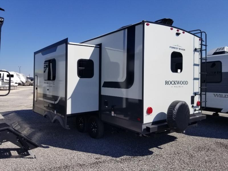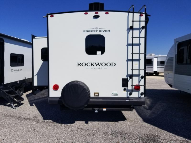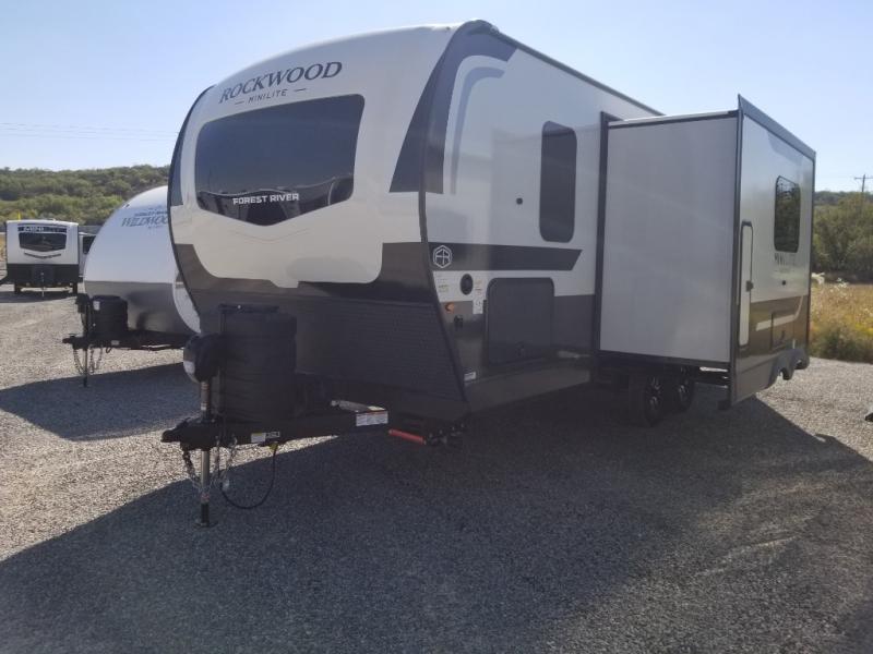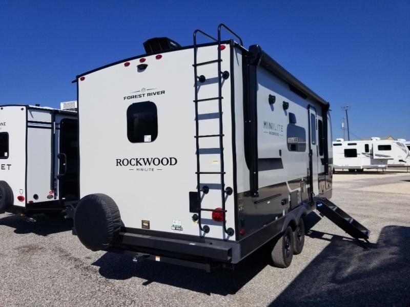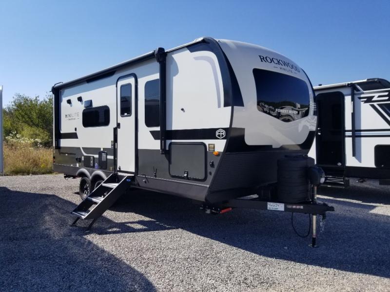 Each Rockwood Mini Lite travel trailer by Forest River is constructed with a fully laminated one-piece walkable roof, sleek frameless windows, and a six-sided full aluminum frame for strength and durability. The 12V thermostatically controlled heated tanks, plus radiant foil in the underbelly will allow you to camp well into the colder months, and the 200W roof solar panel will be perfect for a little off-gridding. Each model includes solid surface kitchen countertops, hidden hinge cabinet doors, roller shades, plus many more interior features. Having an AIR 360+ omnidirectional antenna with WiFi prep on board gives you the option to get some work done if it's needed, and the power tongue jack provides hassle-free set up, so you can enjoy more time relaxing!
