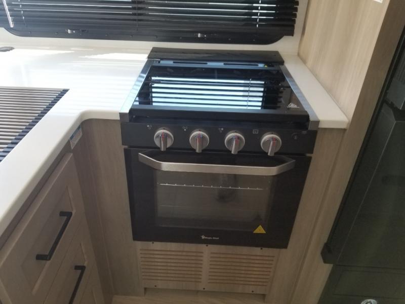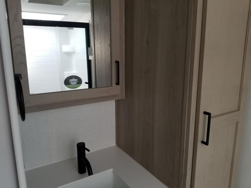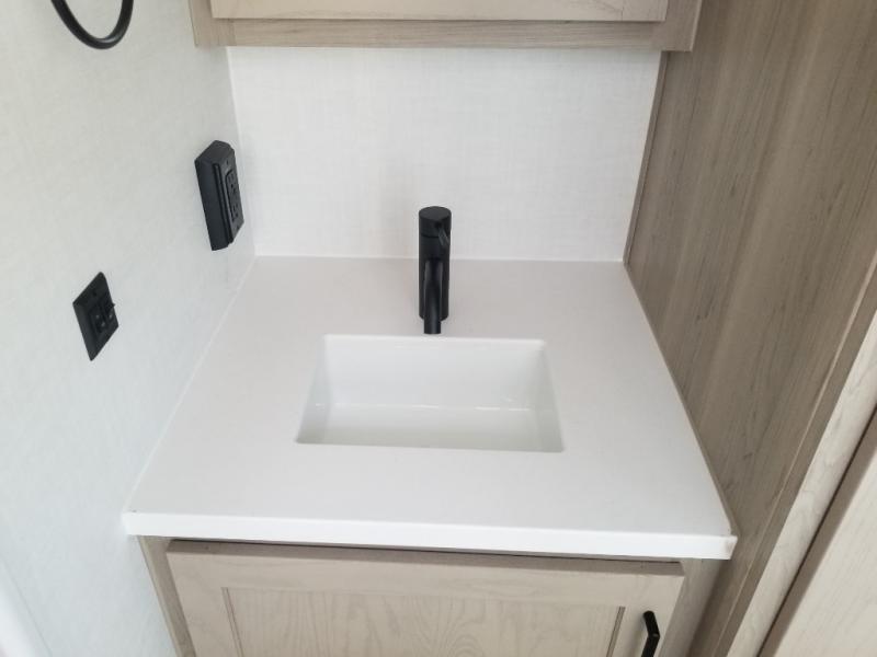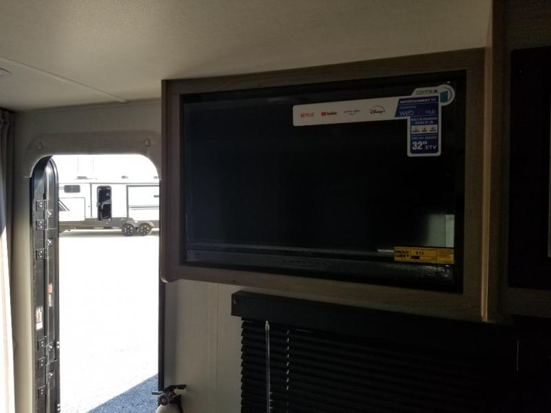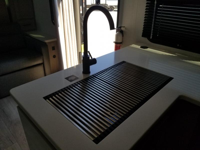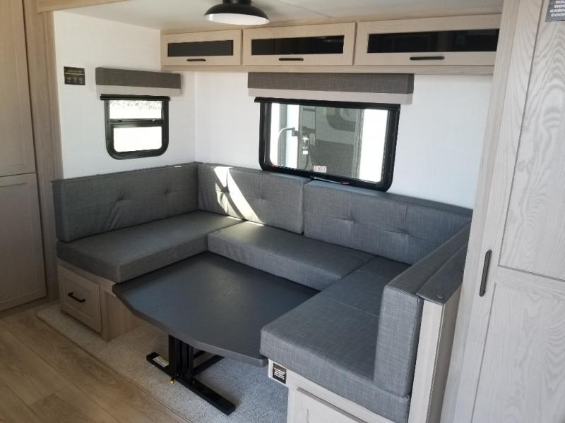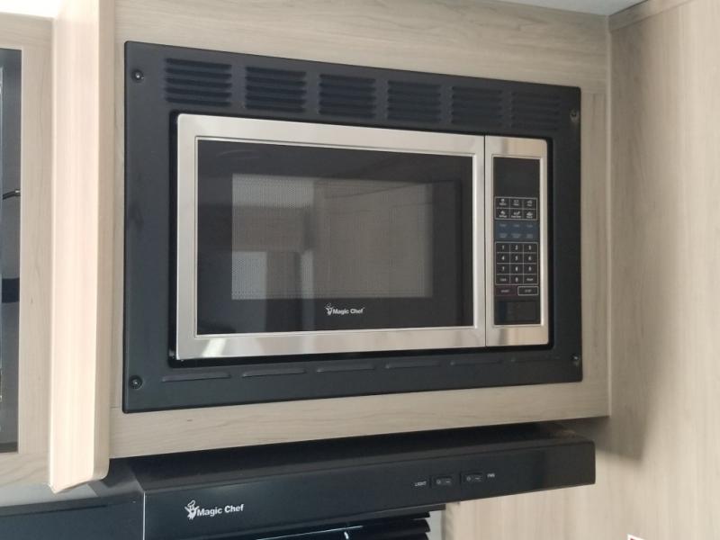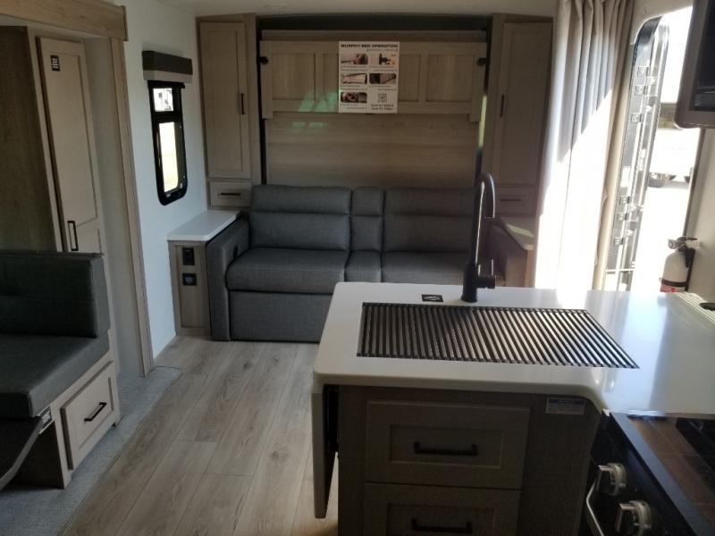 This versatile and cozy travel trailer will be perfect for weekend trips to the lake. Once you arrive at your campground, you can unload the water toys from the pass-thru storage, put out the 15' power awning, then make lunch on the exterior griddle. The U-shaped dinette slide inside will provide a place to dine, play board games, and let a guest or two sleep over, while you take the RV queen-size Murphy bed up front. In the morning, just fold up the bed to expose the 74" sofa! There is a three burner cooktop and microwave oven in the kitchen to make meals each day, along with a 12V refrigerator to keep leftovers fresh.
