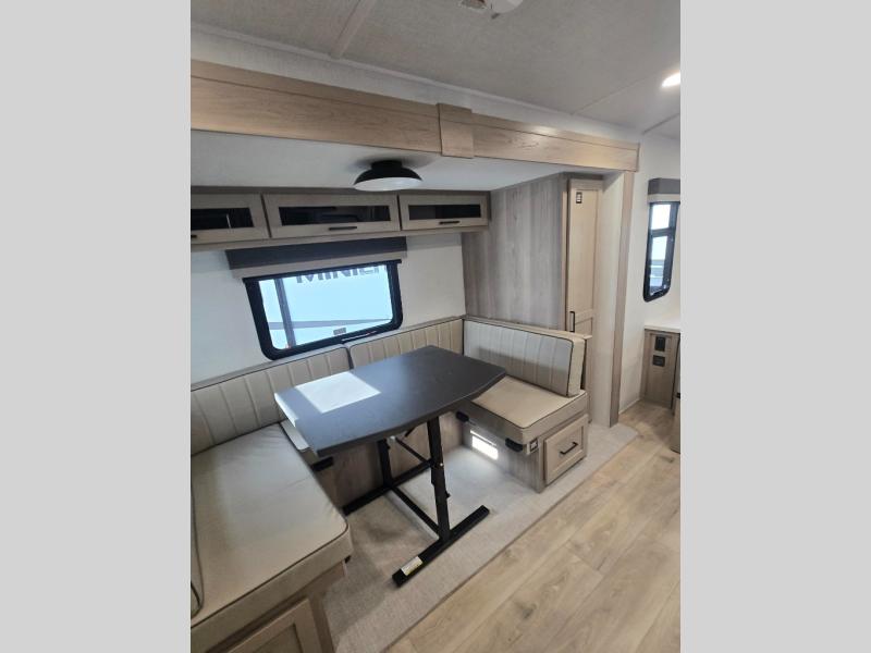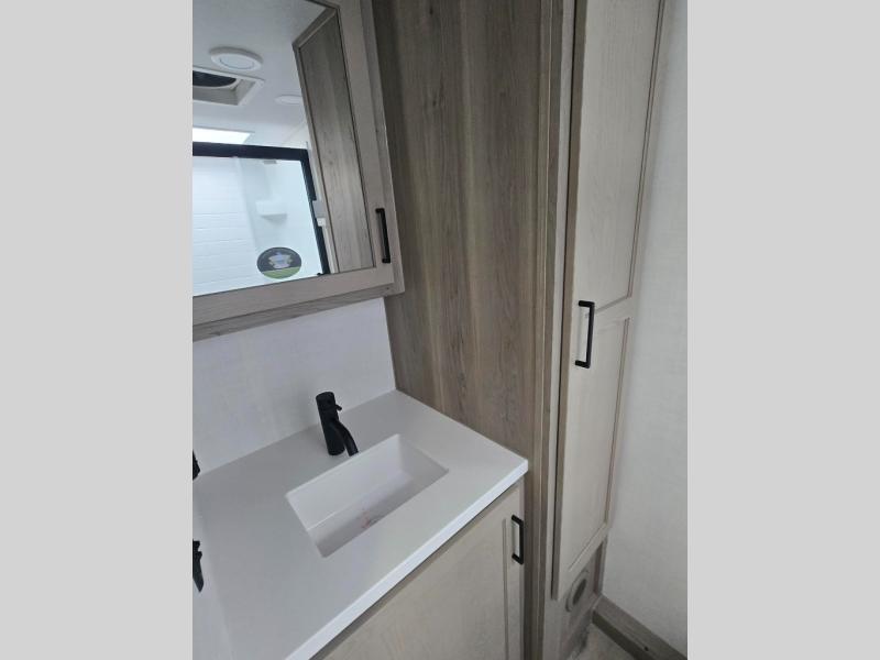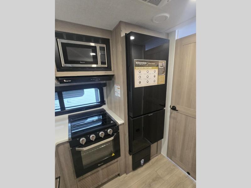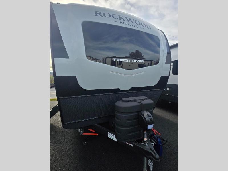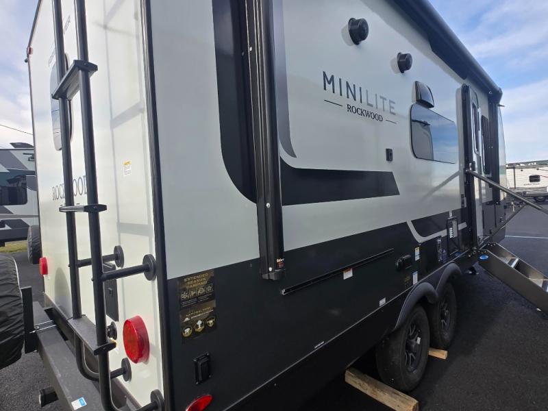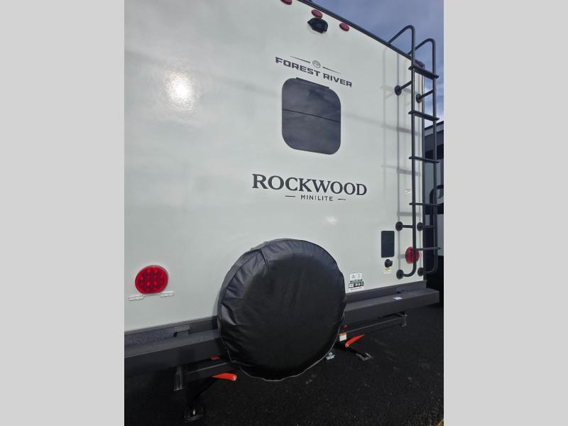 Each Rockwood Mini Lite travel trailer by Forest River is constructed with a fully laminated one-piece walkable roof, sleek frameless windows, and a six-sided full aluminum frame for strength and durability. The 12V thermostatically controlled heated tanks, plus radiant foil in the underbelly will allow you to camp well into the colder months, and the 200W roof solar panel will be perfect for a little off-gridding. Each model includes solid surface kitchen countertops, hidden hinge cabinet doors, roller shades, plus many more interior features. Having an AIR 360+ omnidirectional antenna with WiFi prep on board gives you the option to get some work done if it's needed, and the power tongue jack provides hassle-free set up, so you can enjoy more time relaxing!
