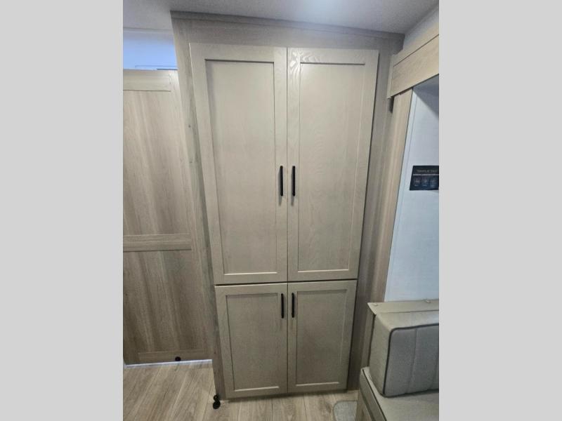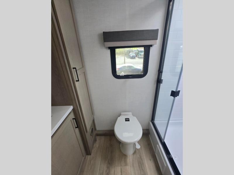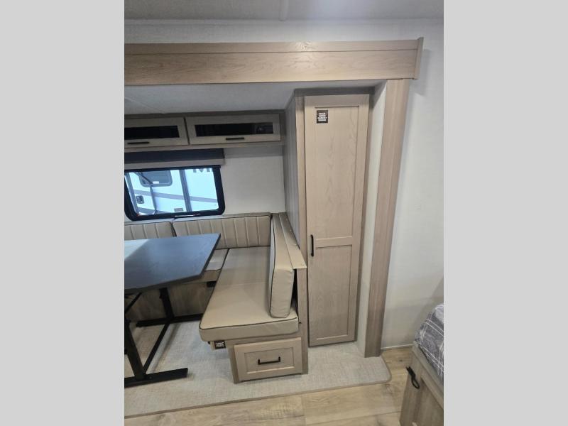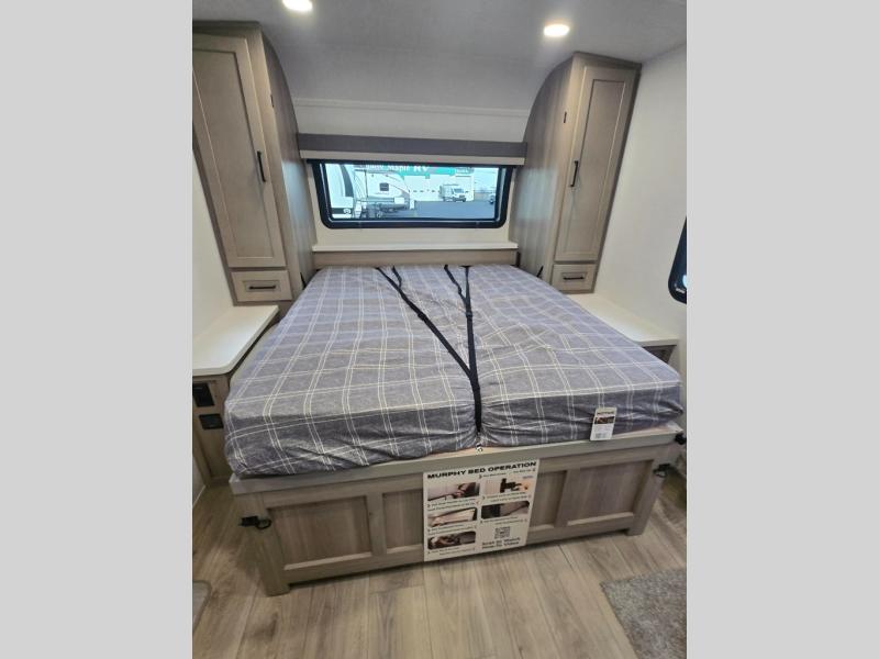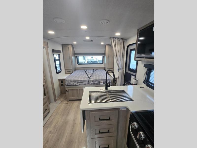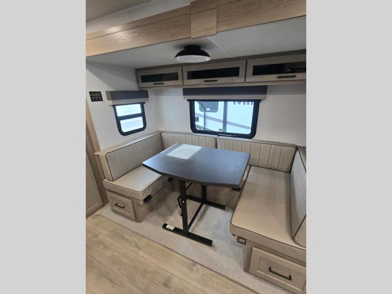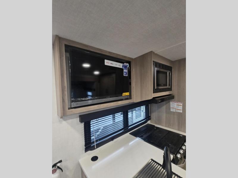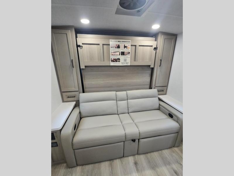 This versatile and cozy travel trailer will be perfect for weekend trips to the lake. Once you arrive at your campground, you can unload the water toys from the pass-thru storage, put out the 15' power awning, then make lunch on the exterior griddle. The U-shaped dinette slide inside will provide a place to dine, play board games, and let a guest or two sleep over, while you take the RV queen-size Murphy bed up front. In the morning, just fold up the bed to expose the 74" sofa! There is a three burner cooktop and microwave oven in the kitchen to make meals each day, along with a 12V refrigerator to keep leftovers fresh.
