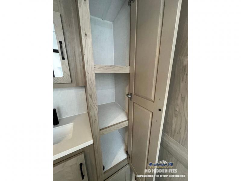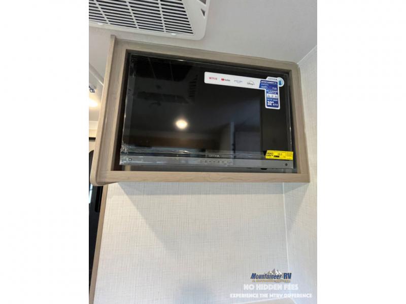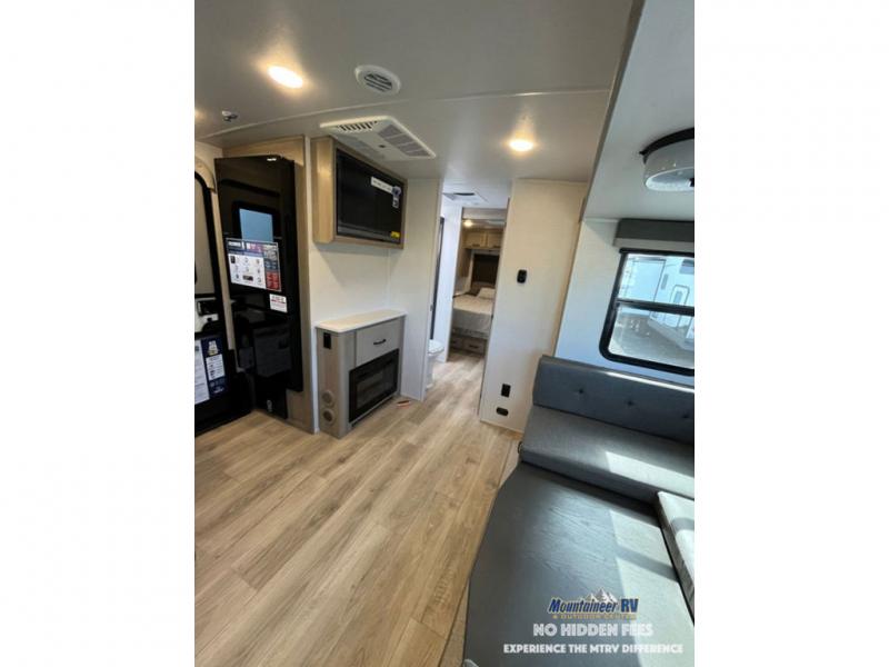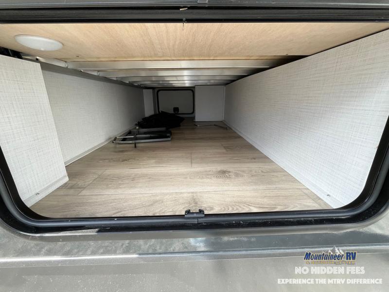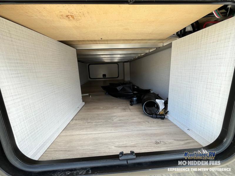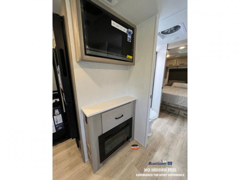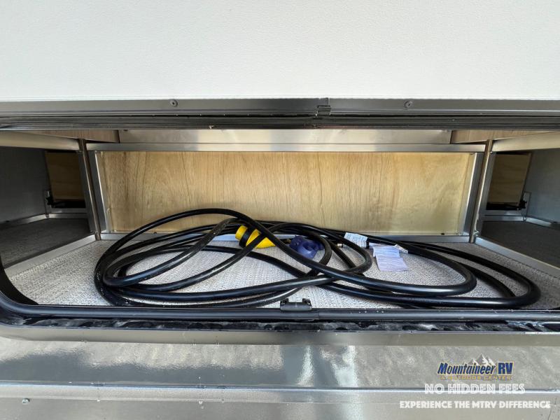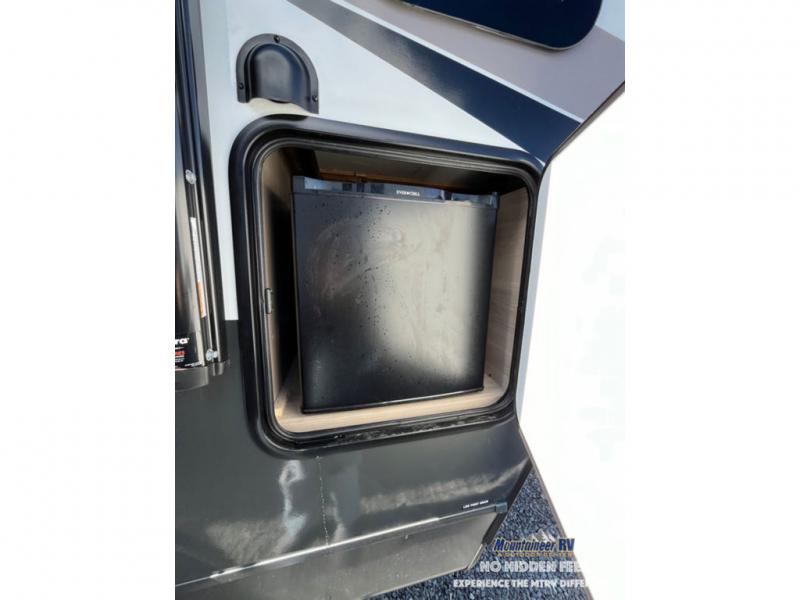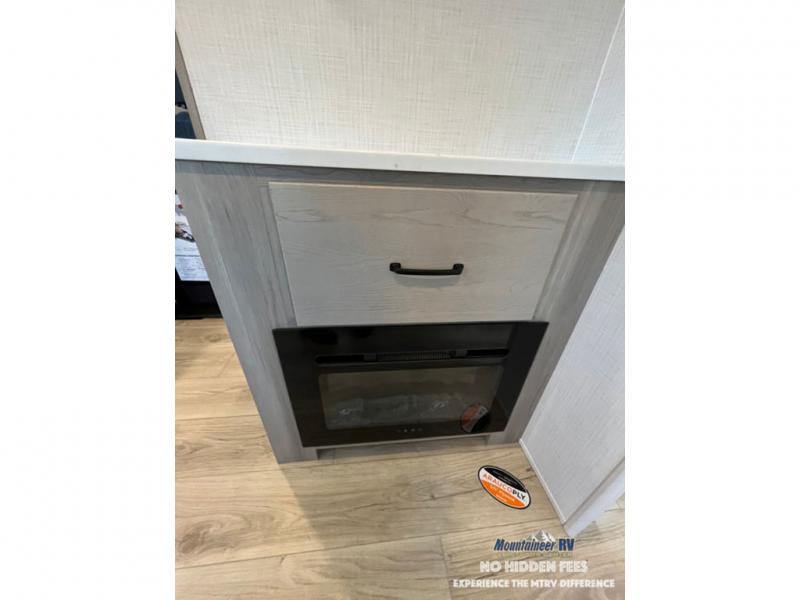 If you like the front kitchen layout, you're going to love this one! You'll have plenty of counter space to prepare and cook meals, or you may just want to head outdoors to cook on the outside griddle. There is a 19' power awning with LED lights to keep you protected from the sun and rain, and there are three exterior storage compartments for lawn chairs, fishing poles, and firewood! This model includes a U-shaped dinette slide in perfect view of the 12V smart entertainment TV and fireplace, and this area can double as your guests' sleeping space at night. You'll stay comfortable in the rear bedroom that includes an RV queen bed, dual bedroom wardrobes, and an optional TV if you enjoy movies in bed!