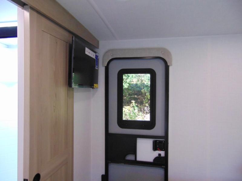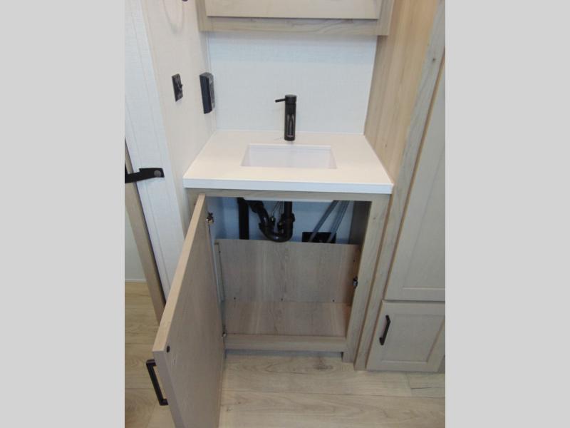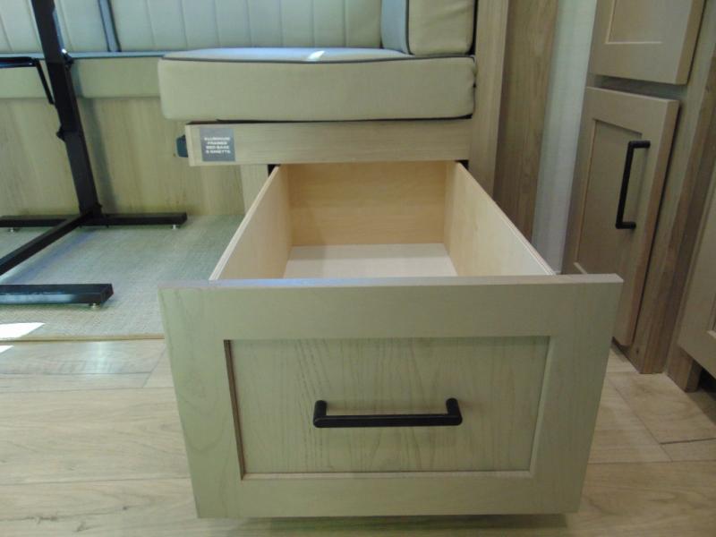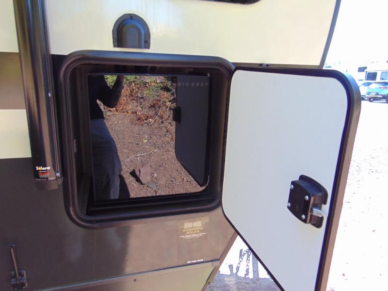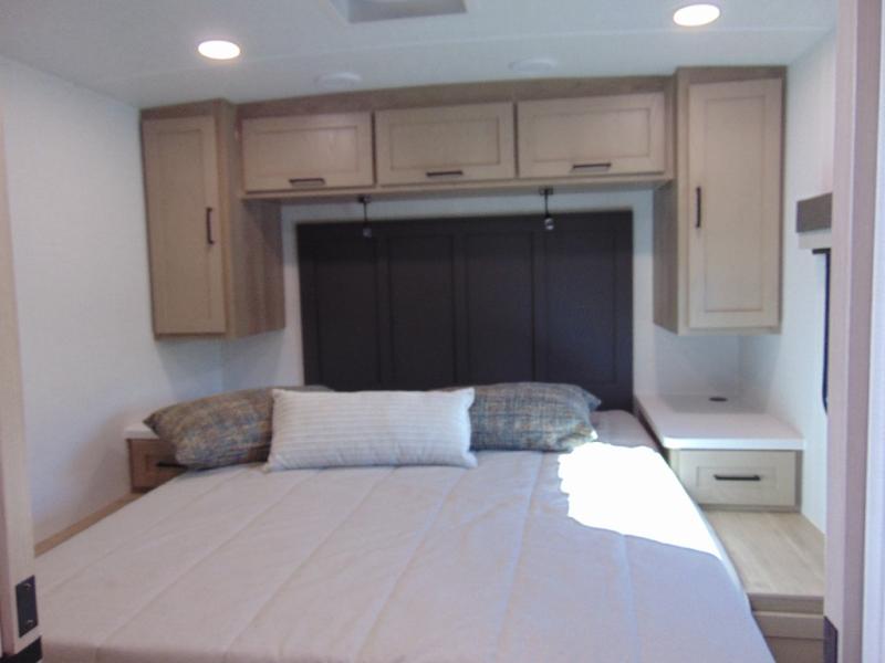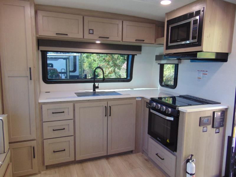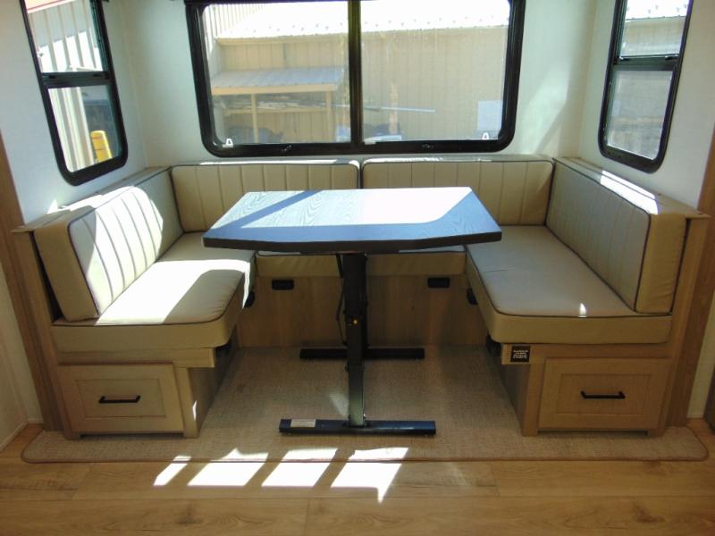 If you like the front kitchen layout, you're going to love this one! You'll have plenty of counter space to prepare and cook meals, or you may just want to head outdoors to cook on the outside griddle. There is a 19' power awning with LED lights to keep you protected from the sun and rain, and there are three exterior storage compartments for lawn chairs, fishing poles, and firewood! This model includes a U-shaped dinette slide in perfect view of the 12V smart entertainment TV and fireplace, and this area can double as your guests' sleeping space at night. You'll stay comfortable in the rear bedroom that includes an RV queen bed, dual bedroom wardrobes, and an optional TV if you enjoy movies in bed!