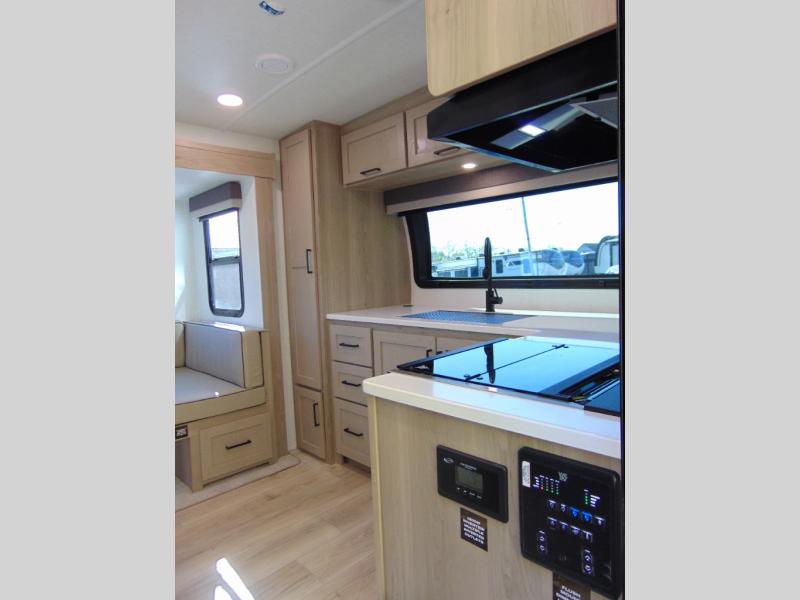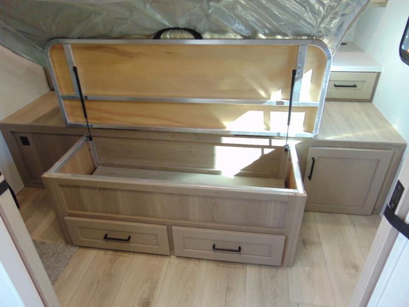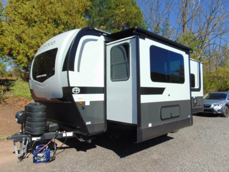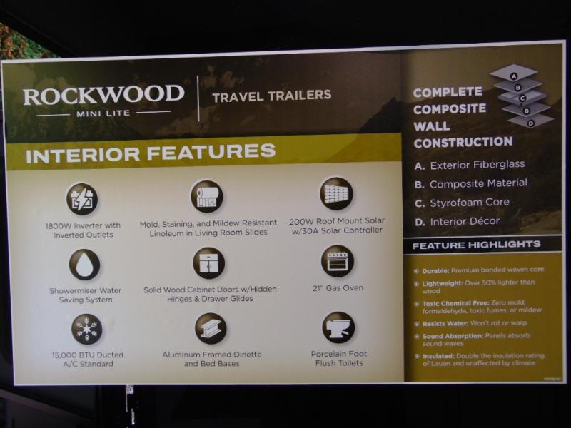 Each Rockwood Mini Lite travel trailer by Forest River is constructed with a fully laminated one-piece walkable roof, sleek frameless windows, and a six-sided full aluminum frame for strength and durability. The 12V thermostatically controlled heated tanks, plus radiant foil in the underbelly and slide out floors will allow you to camp well into the colder months, and the 200W roof solar panel will be perfect for a little off-gridding.
