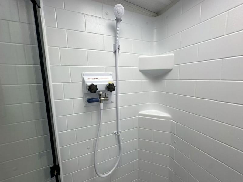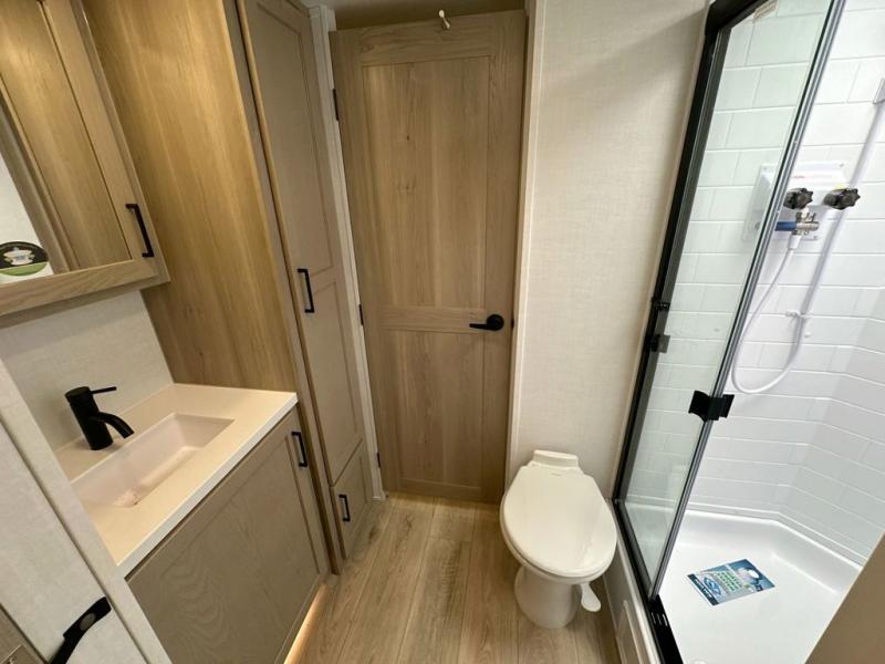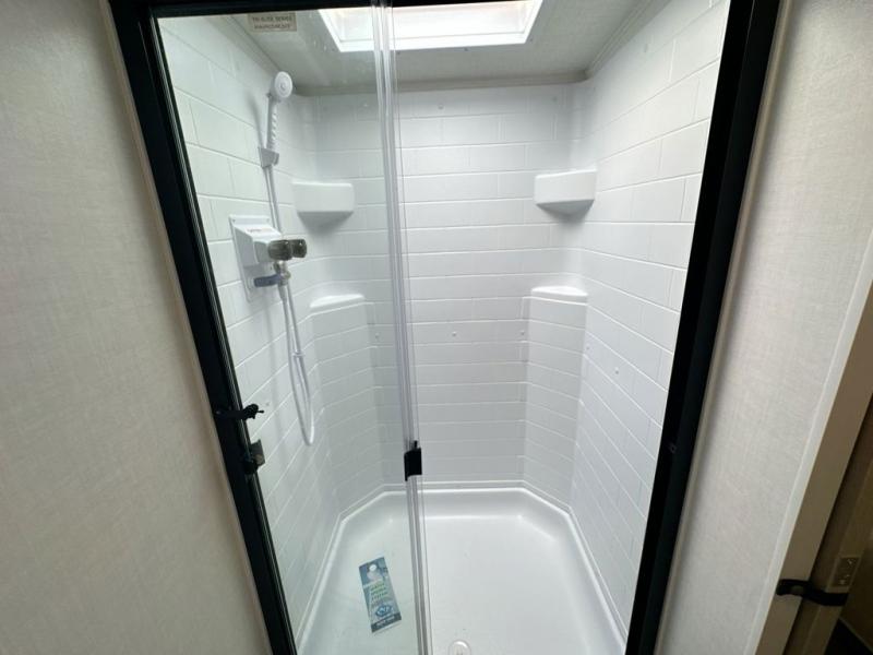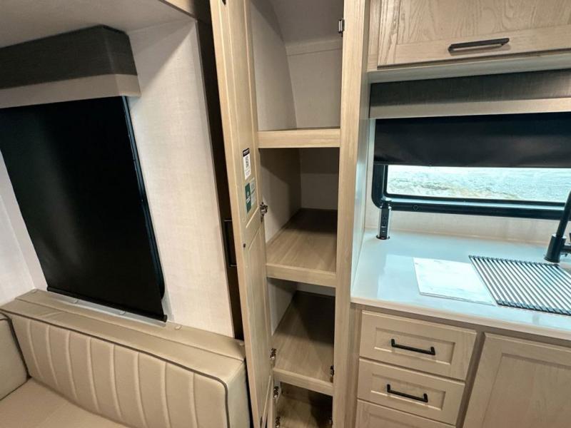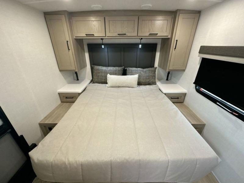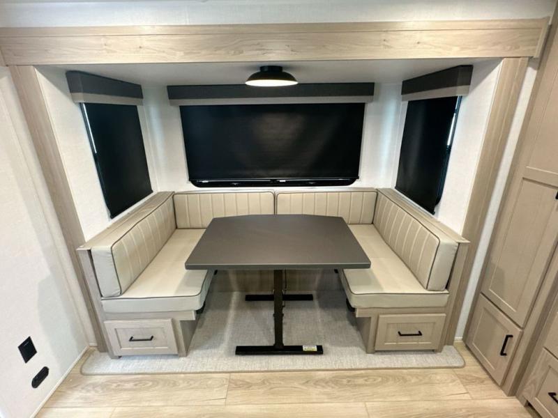 If you like the front kitchen layout, you're going to love this one! You'll have plenty of counter space to prepare and cook meals, or you may just want to head outdoors to cook on the outside griddle. There is a 19' power awning with LED lights to keep you protected from the sun and rain, and there are three exterior storage compartments for lawn chairs, fishing poles, and firewood! This model includes a U-shaped dinette slide in perfect view of the 12V smart entertainment TV and fireplace, and this area can double as your guests' sleeping space at night. You'll stay comfortable in the rear bedroom that includes an RV queen bed, dual bedroom wardrobes, and an optional TV if you enjoy movies in bed!