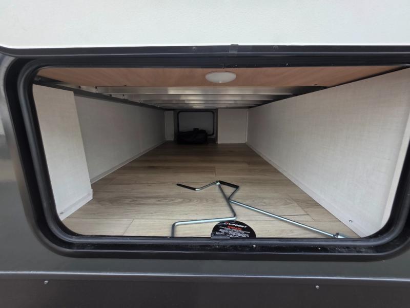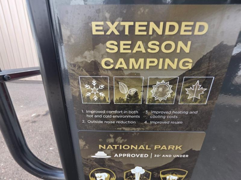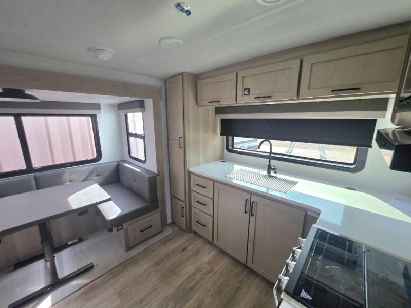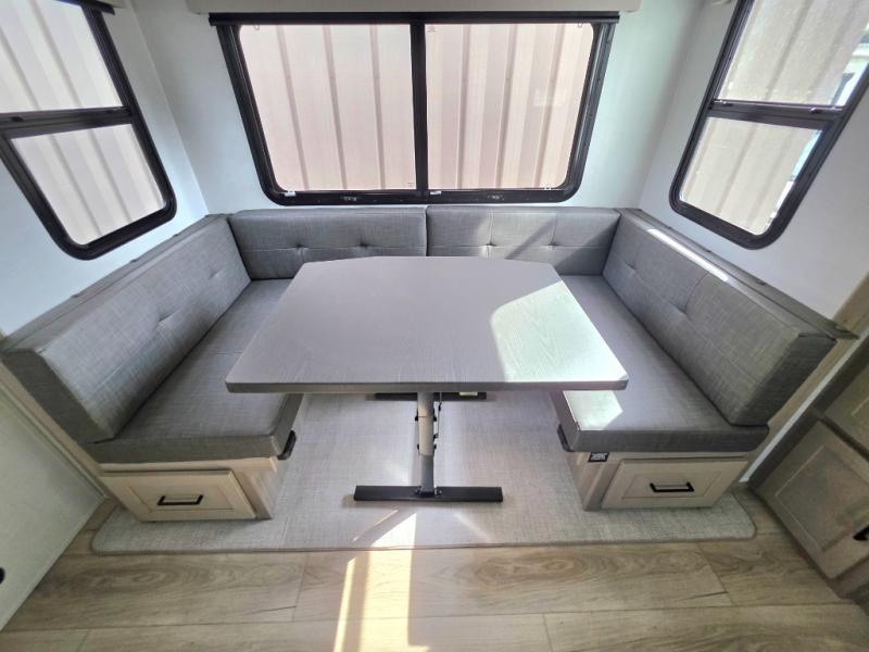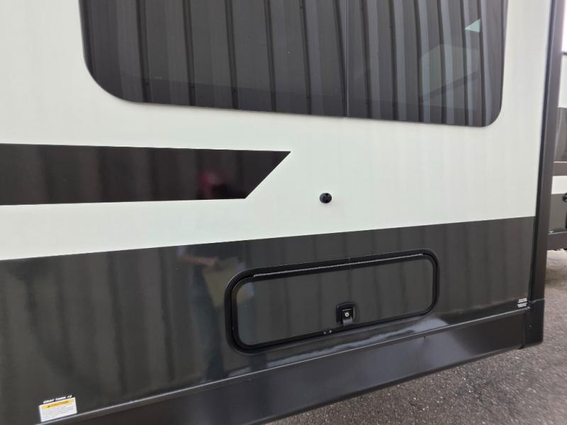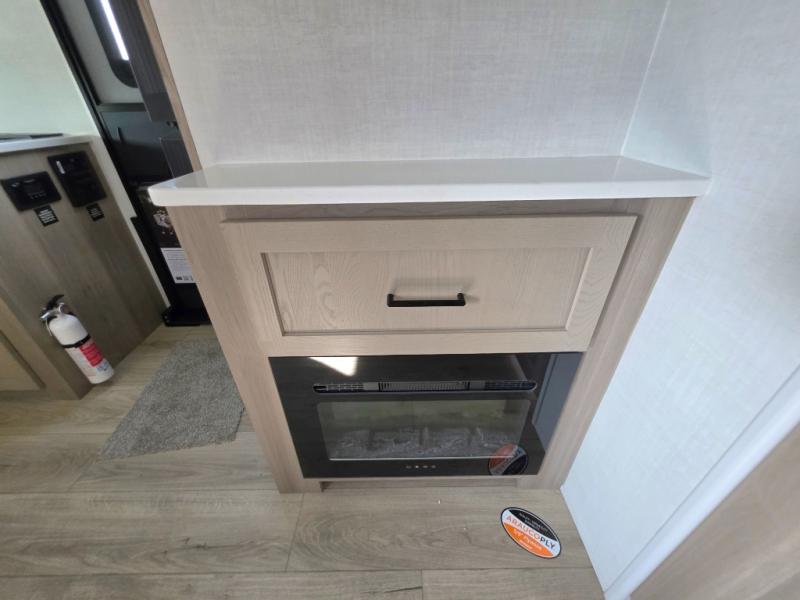 If you like the front kitchen layout, you're going to love this one! You'll have plenty of counter space to prepare and cook meals, or you may just want to head outdoors to cook on the outside griddle. There is a 19' power awning with LED lights to keep you protected from the sun and rain, and there are three exterior storage compartments for lawn chairs, fishing poles, and firewood! This model includes a U-shaped dinette slide in perfect view of the 12V smart entertainment TV and fireplace, and this area can double as your guests' sleeping space at night. You'll stay comfortable in the rear bedroom that includes an RV queen bed, dual bedroom wardrobes, and an optional TV if you enjoy movies in bed!
