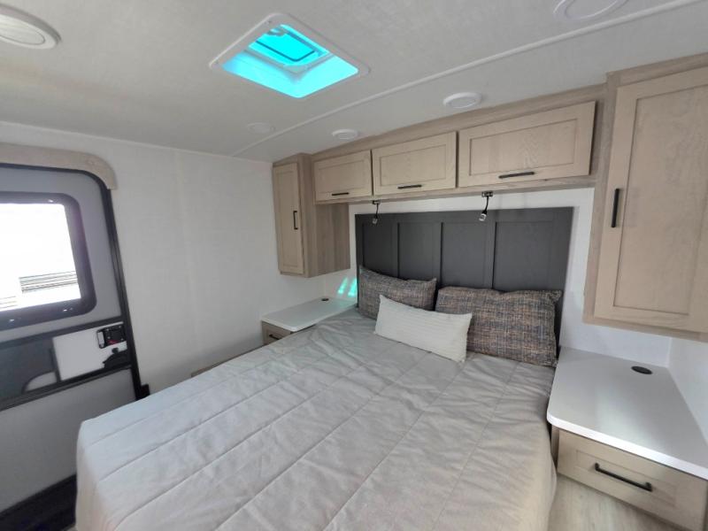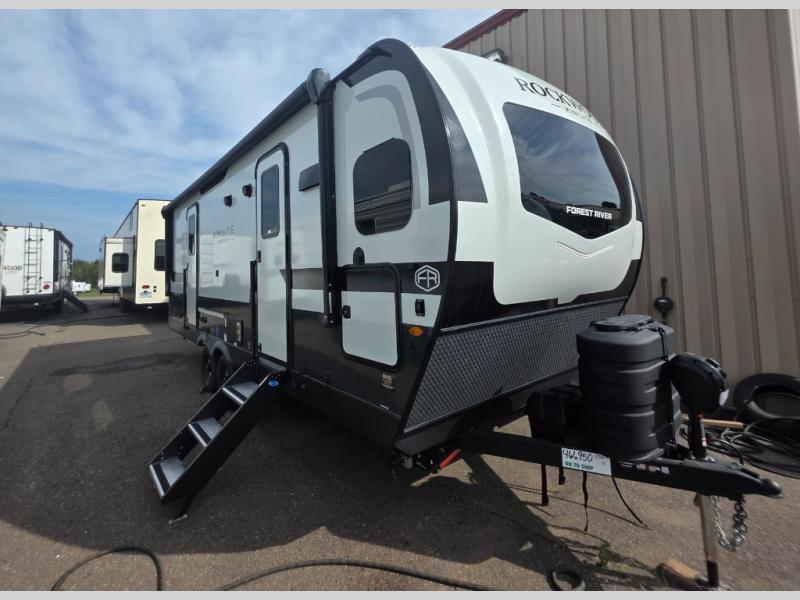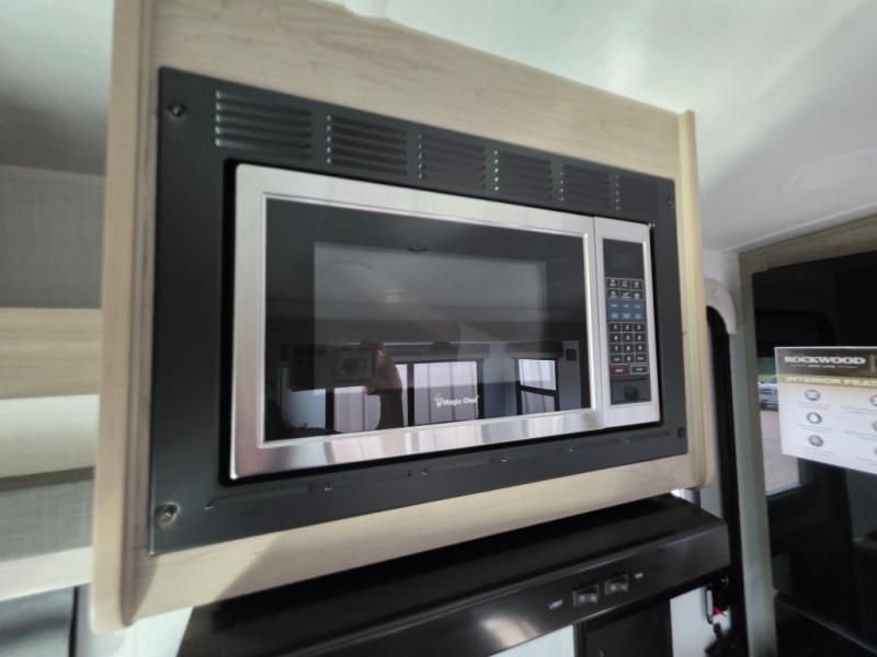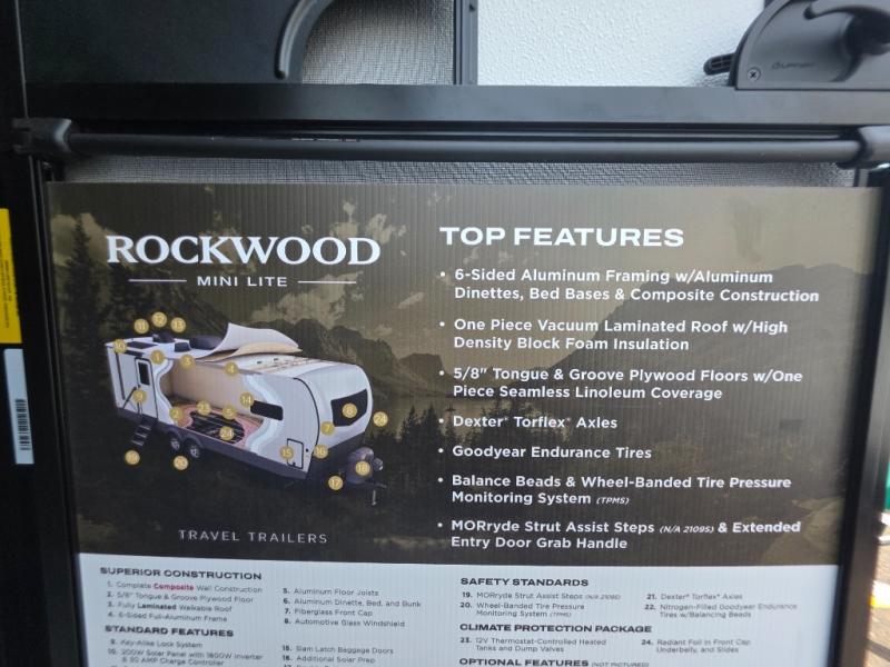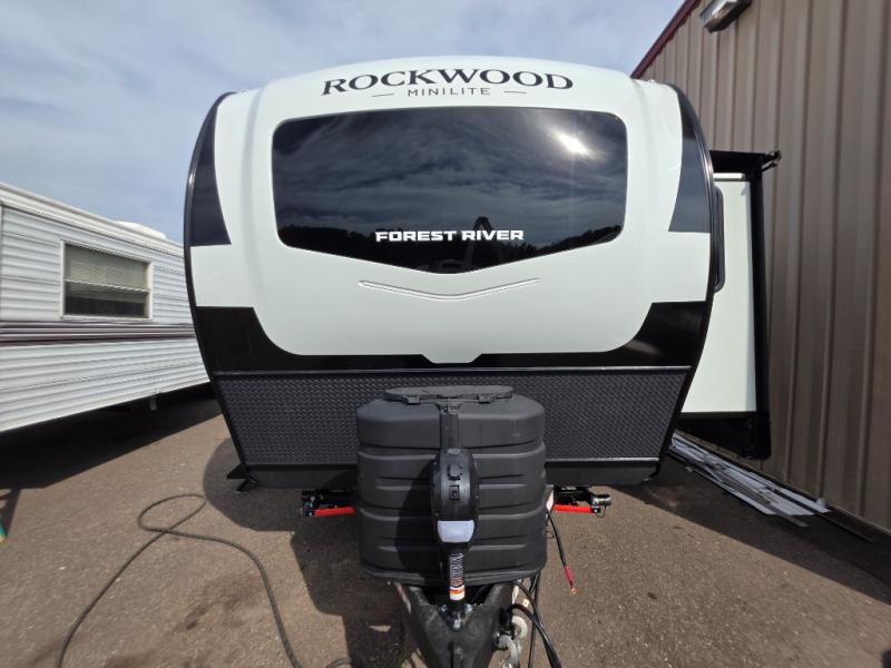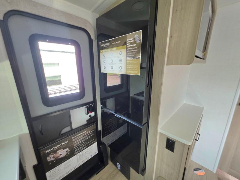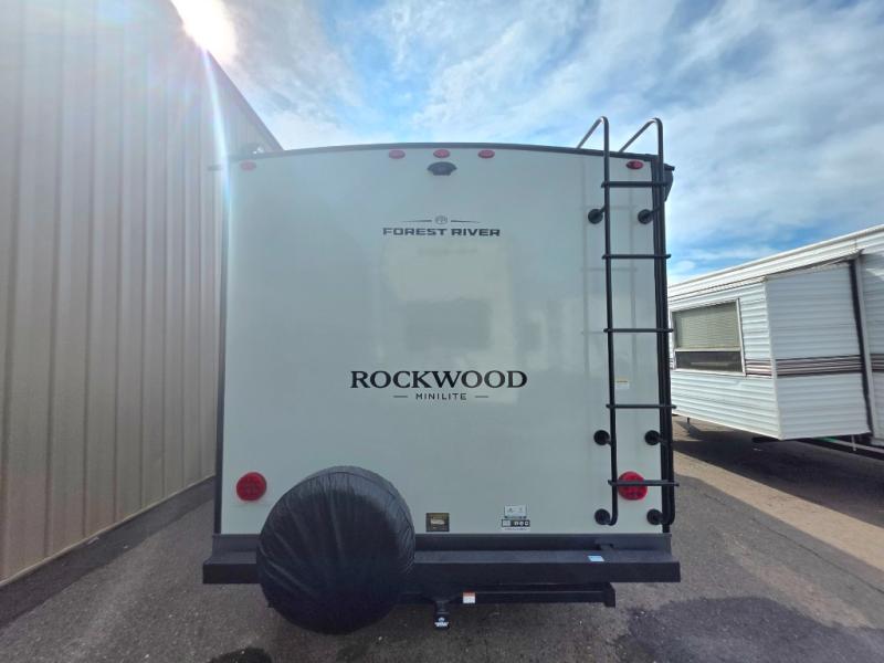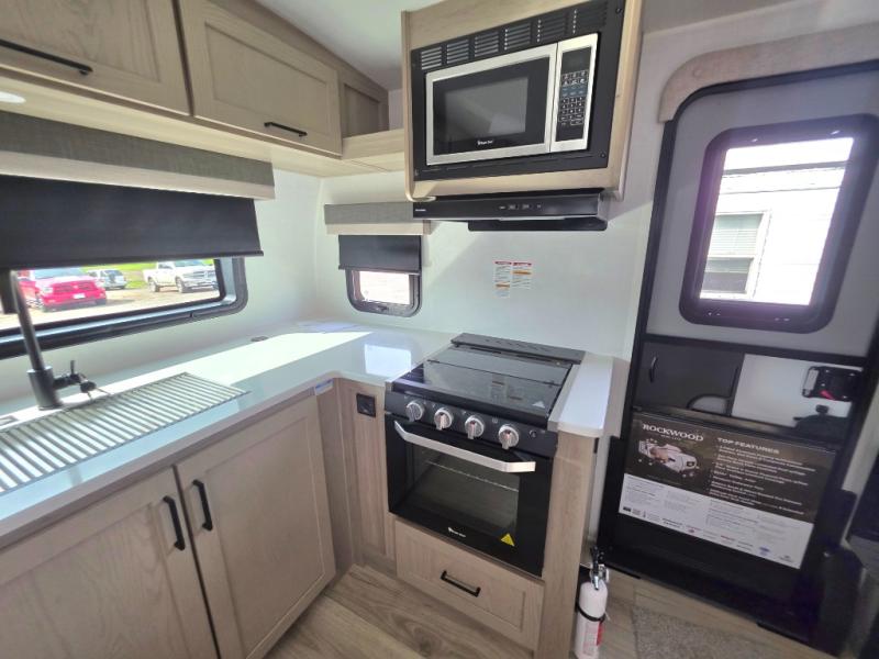 Each Rockwood Mini Lite travel trailer by Forest River is constructed with a fully laminated one-piece walkable roof, sleek frameless windows, and a six-sided full aluminum frame for strength and durability. The 12V thermostatically controlled heated tanks, plus radiant foil in the underbelly will allow you to camp well into the colder months, and the 200W roof solar panel will be perfect for a little off-gridding. Each model includes solid surface kitchen countertops, hidden hinge cabinet doors, roller shades, plus many more interior features. Having an AIR 360+ omnidirectional antenna with WiFi prep on board gives you the option to get some work done if it's needed, and the power tongue jack provides hassle-free set up, so you can enjoy more time relaxing!