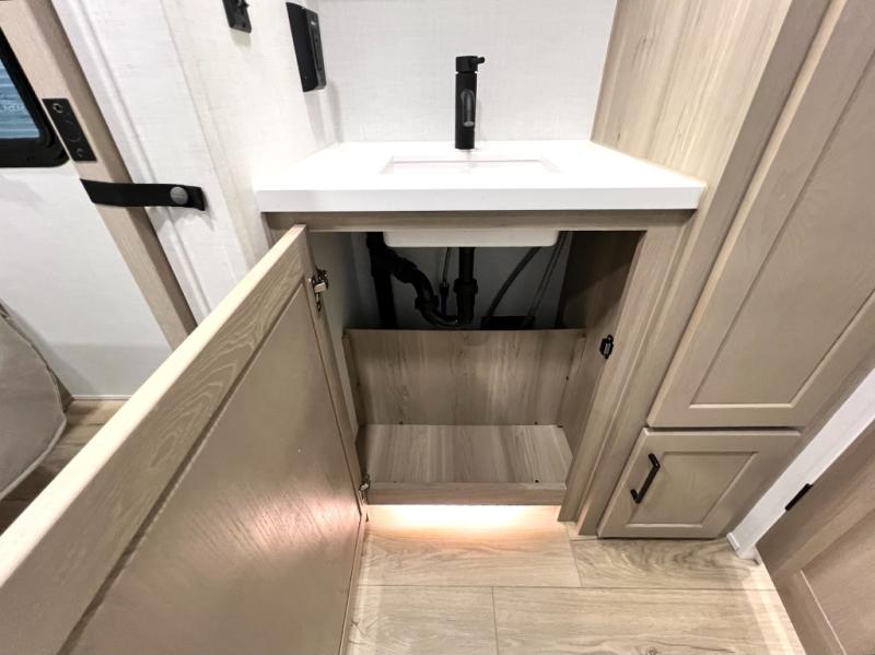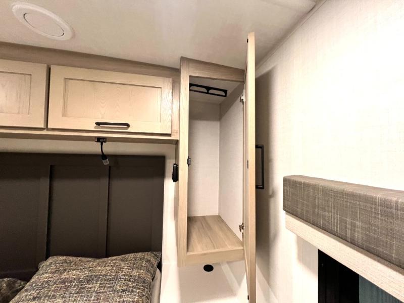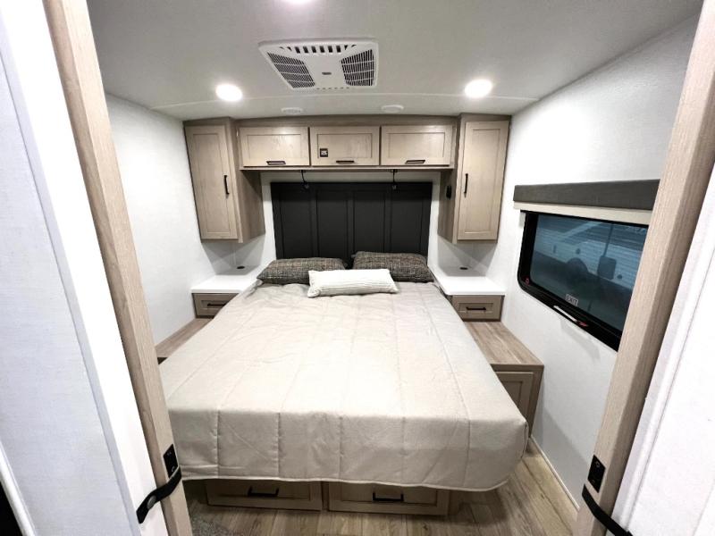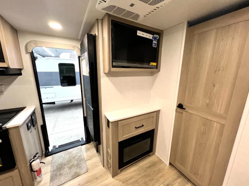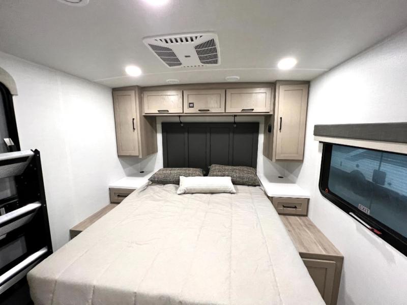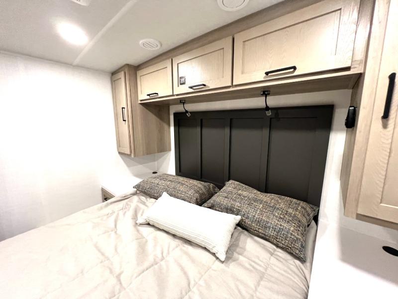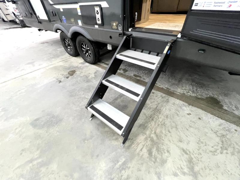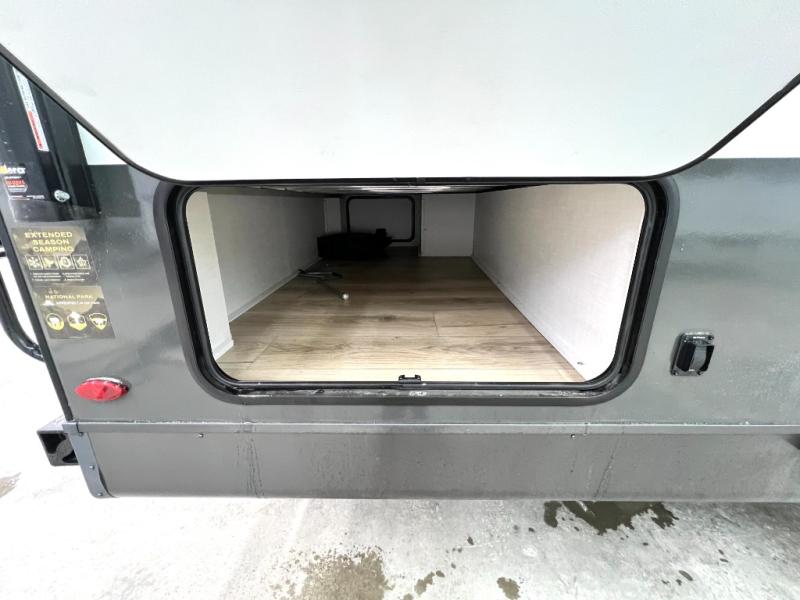 If you like the front kitchen layout, you're going to love this one! There is a 19' power awning with LED lights to keep you protected from the sun and rain, and there are three exterior storage compartments for lawn chairs, fishing poles, and firewood! This model includes a U-shaped dinette slide in perfect view of the 12V smart entertainment TV and fireplace, and this area can double as your guests' sleeping space at night. You'll stay comfortable in the rear bedroom that includes an RV queen bed, dual bedroom wardrobes, and an optional TV if you enjoy movies in bed!