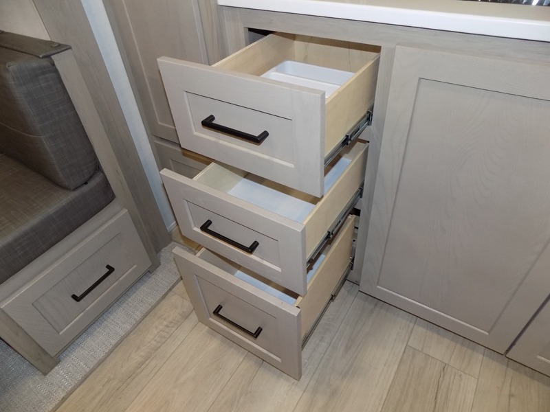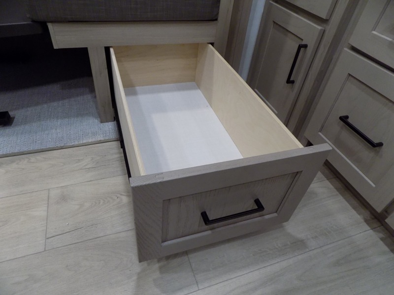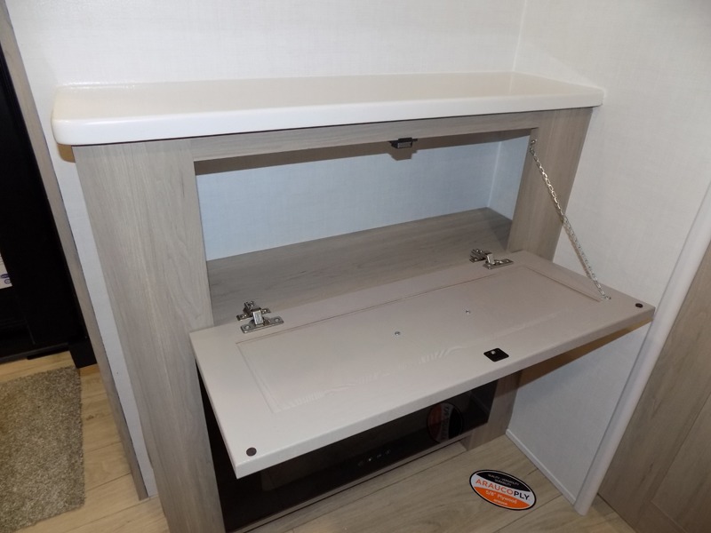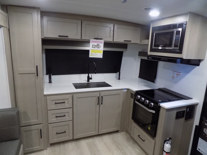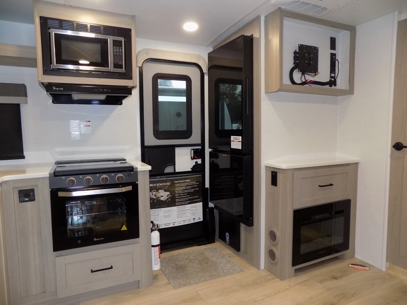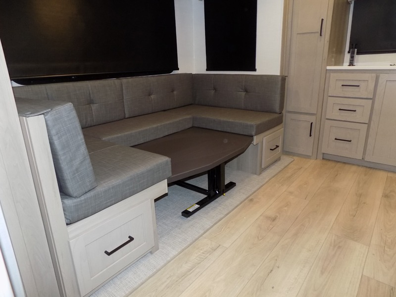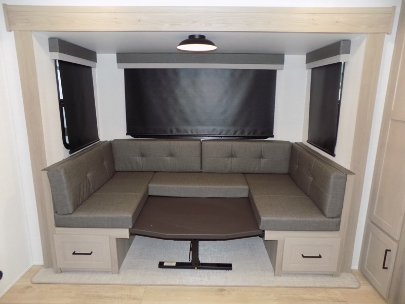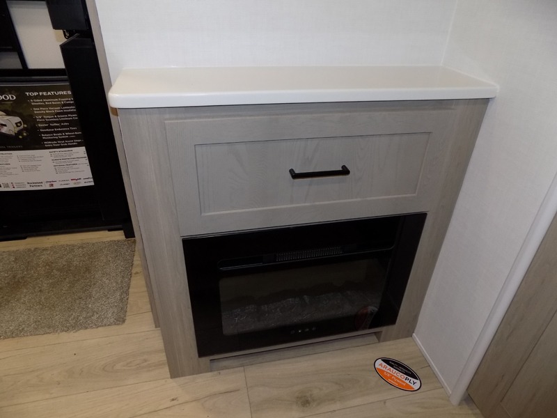 If you like the front kitchen layout, you're going to love this one! There is a 19' power awning with LED lights to keep you protected from the sun and rain, and there are three exterior storage compartments for lawn chairs, fishing poles, and firewood! This model includes a U-shaped dinette slide in perfect view of the 12V smart entertainment TV and fireplace, and this area can double as your guests' sleeping space at night. You'll stay comfortable in the rear bedroom that includes an RV queen bed, dual bedroom wardrobes, and an optional TV if you enjoy movies in bed!
