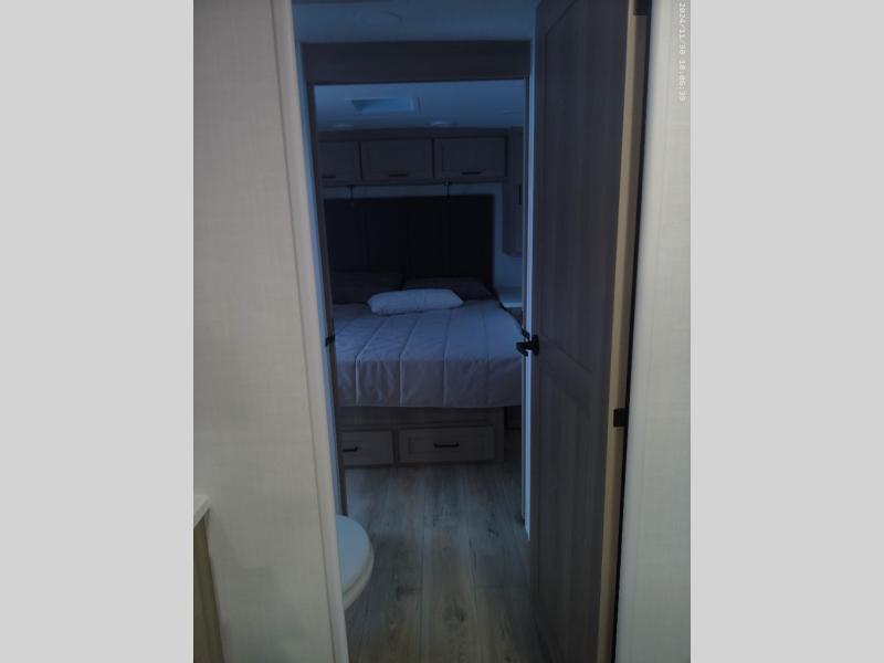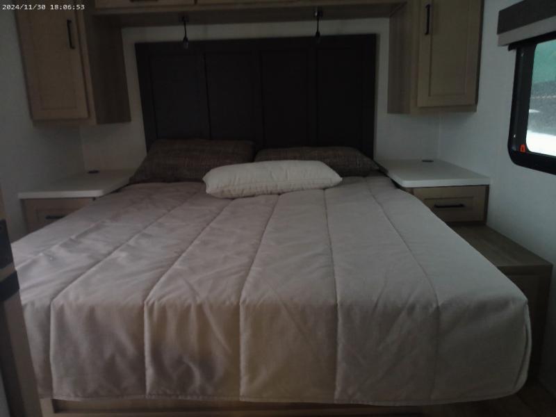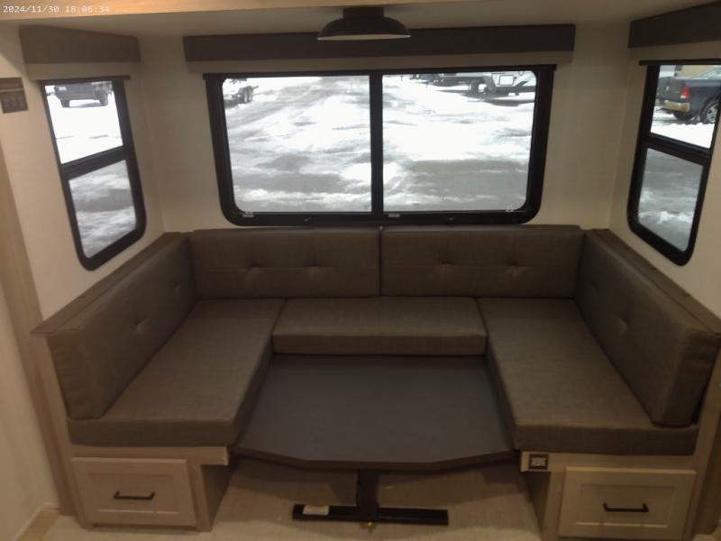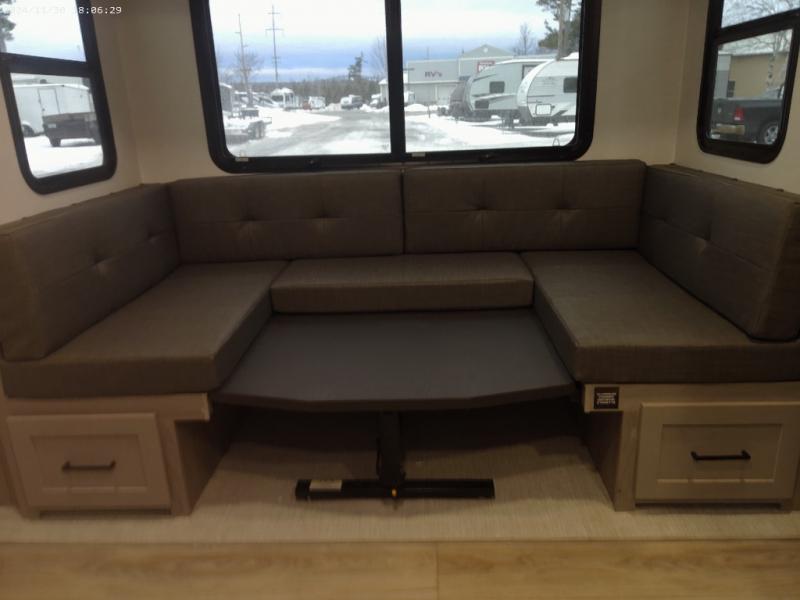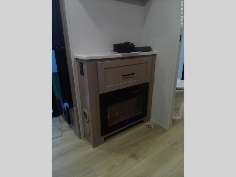 If you like the front kitchen layout, you're going to love this one! You'll have plenty of counter space to prepare and cook meals, or you may just want to head outdoors to cook on the outside griddle. There is a 19' power awning with LED lights to keep you protected from the sun and rain, and there are three exterior storage compartments for lawn chairs, fishing poles, and firewood! This model includes a U-shaped dinette slide in perfect view of the 12V smart entertainment TV and fireplace, and this area can double as your guests' sleeping space at night. You'll stay comfortable in the rear bedroom that includes an RV queen bed, dual bedroom wardrobes, and an optional TV if you enjoy movies in bed!