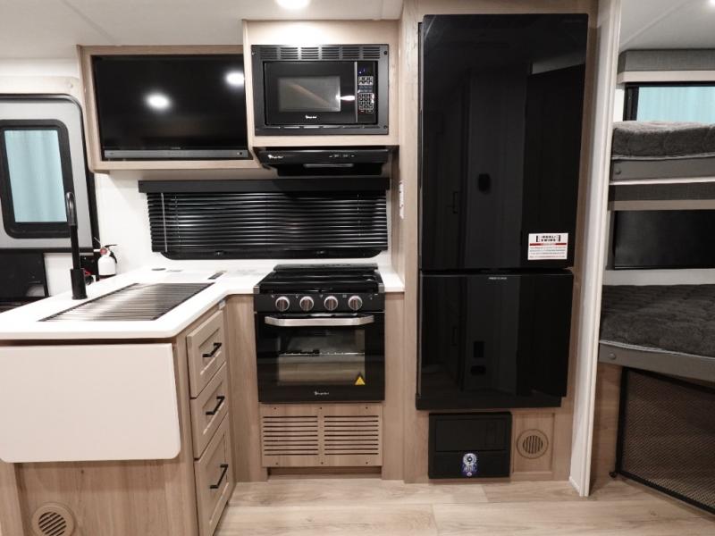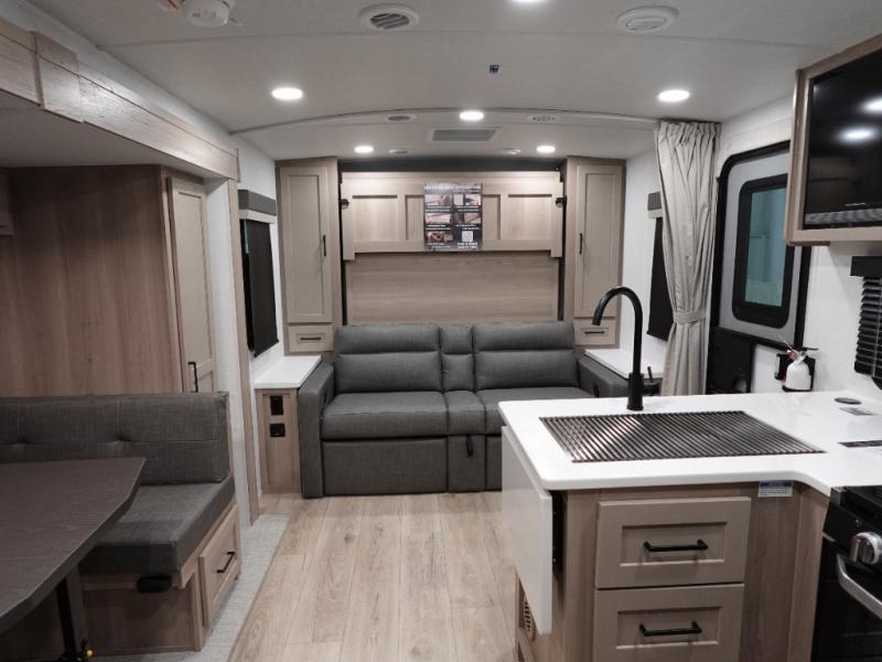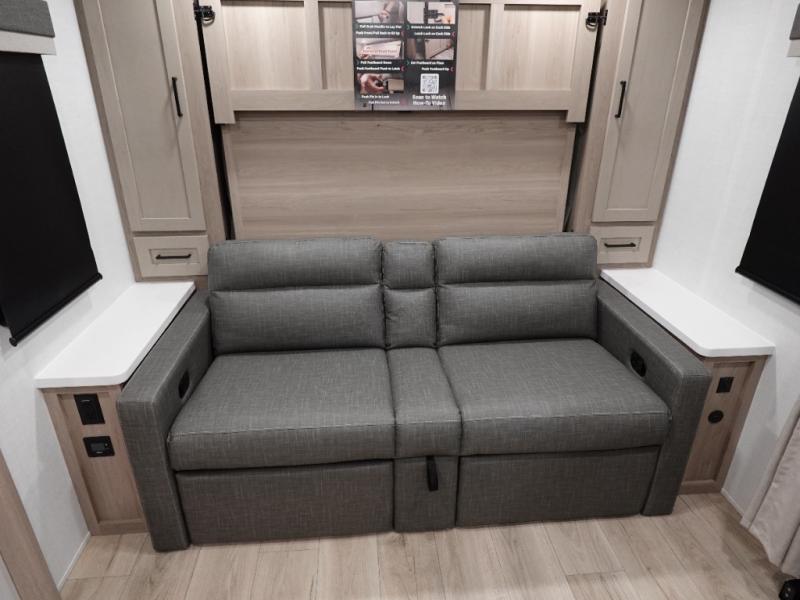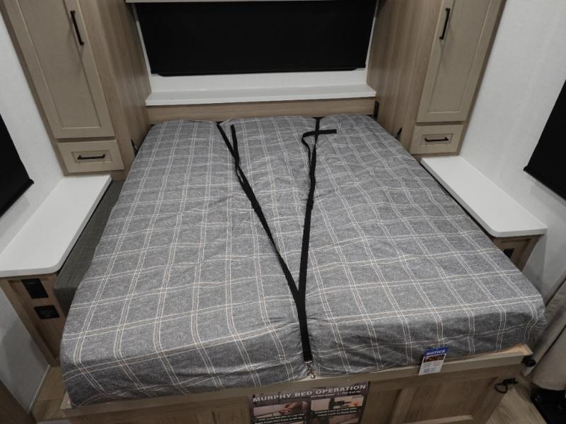 Finally, a lightweight travel trailer with double-size bunks for the kids or your guests! You'll find the versatile Murphy bed up front will be super convenient when you need more space to move around, and the 72" sofa will provide comfy seating space when the bed is put up. This model also includes a U-shaped dinette slide perfect to dine around, play games, and sleep additional guests. A 32" TV in the main living area will allow you to watch your favorite shows in the evenings, or you may just find yourselves outdoors under the 18' power awning with LED lights. And check out the pass-through storage, plus additional exterior storage for your hiking gear!