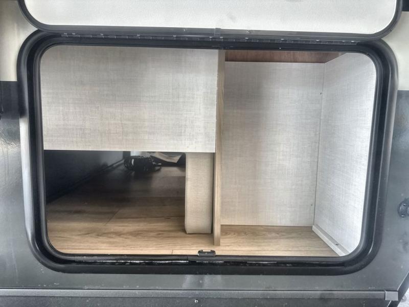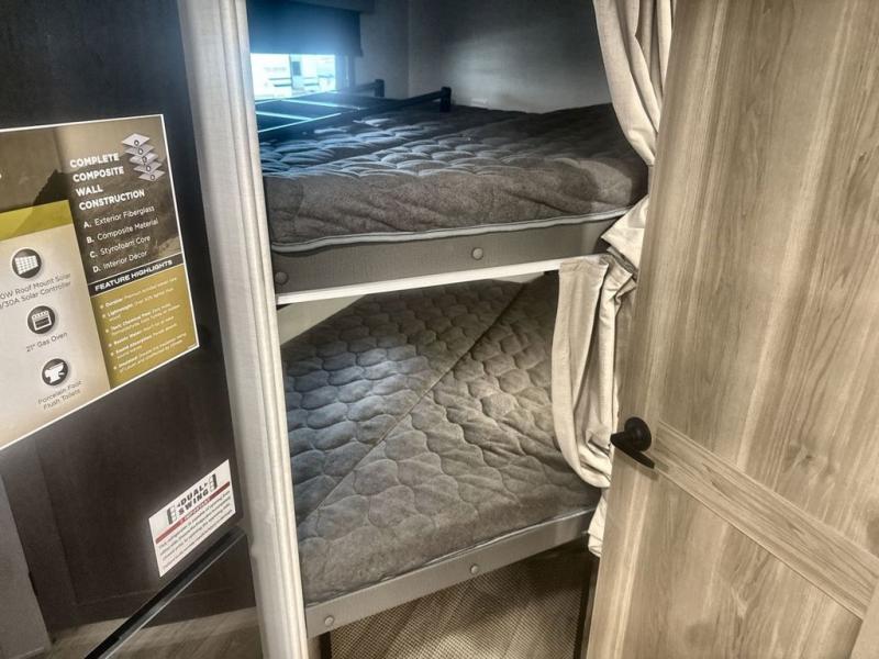 Finally, a lightweight travel trailer with double-size bunks for the kids or your guests! You'll find the versatile Murphy bed up front will be super convenient when you need more space to move around, and the 72" sofa will provide comfy seating space when the bed is put up. This model also includes a U-shaped dinette slide perfect to dine around, play games, and sleep additional guests. A 32" TV in the main living area will allow you to watch your favorite shows in the evenings, or you may just find yourselves outdoors under the 18' power awning with LED lights. And check out the pass-through storage, plus additional exterior storage for your hiking gear!
