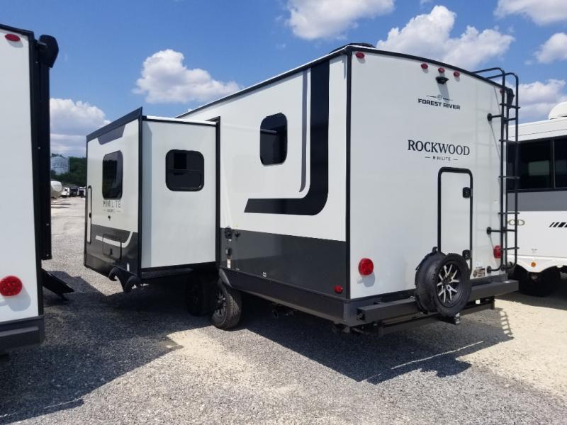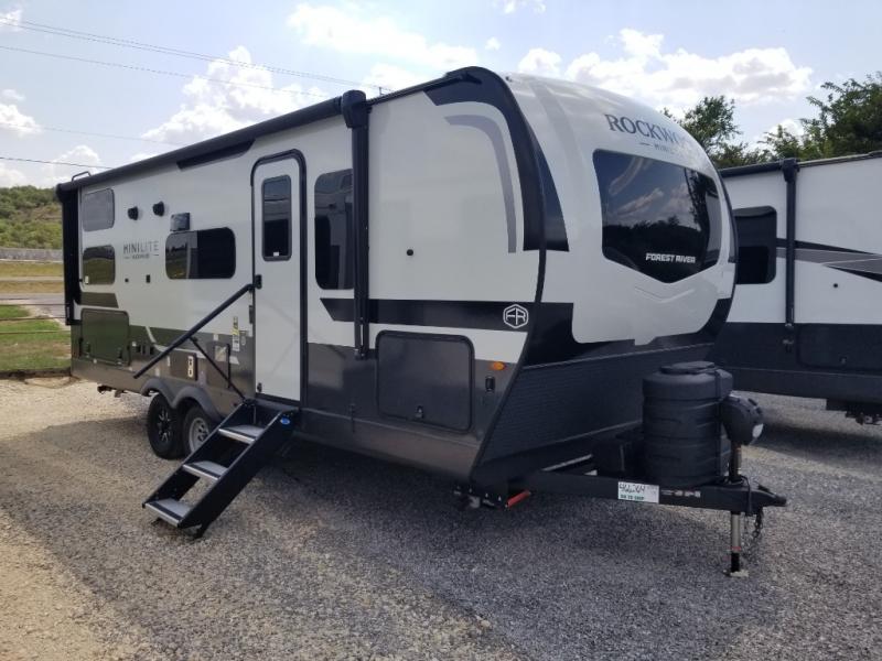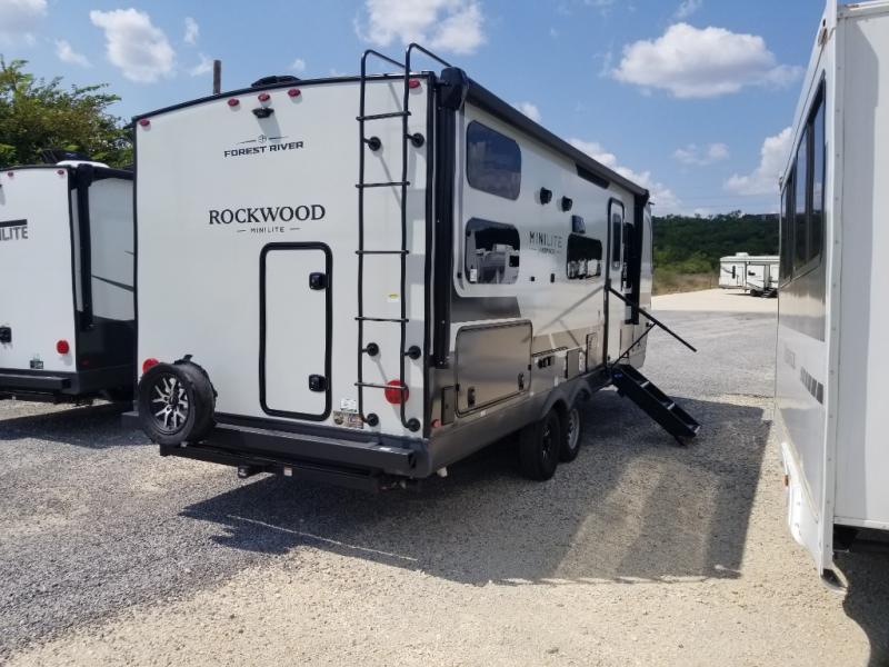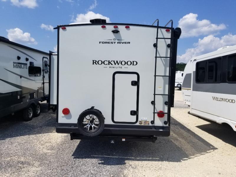 Each Rockwood Mini Lite travel trailer by Forest River is constructed with a fully laminated one-piece walkable roof, sleek frameless windows, and a six-sided full aluminum frame for strength and durability. The 12V thermostatically controlled heated tanks, plus radiant foil in the underbelly will allow you to camp well into the colder months, and the 200W roof solar panel will be perfect for a little off-gridding. Each model includes solid surface kitchen countertops, hidden hinge cabinet doors, roller shades, plus many more interior features. Having an AIR 360+ omnidirectional antenna with WiFi prep on board gives you the option to get some work done if it's needed, and the power tongue jack provides hassle-free set up, so you can enjoy more time relaxing!