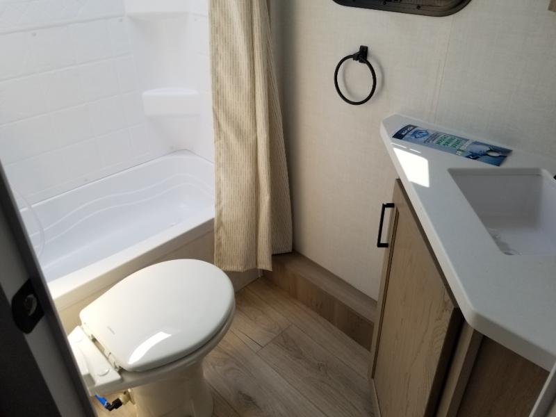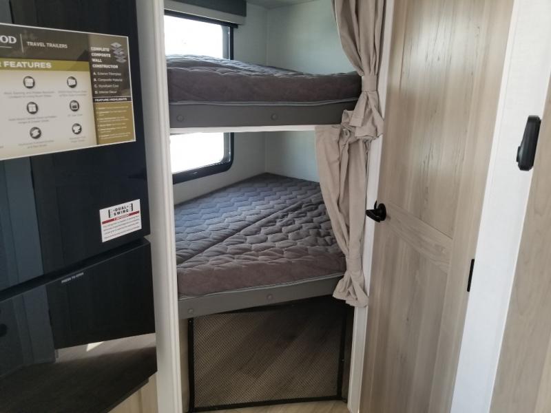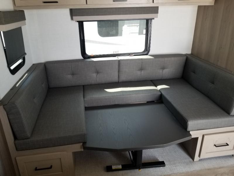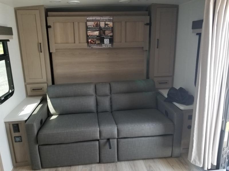 Finally, a lightweight travel trailer with double-size bunks for the kids or your guests! You'll find the versatile Murphy bed up front will be super convenient when you need more space to move around, and the 72" sofa will provide comfy seating space when the bed is put up. This model also includes a U-shaped dinette slide perfect to dine around, play games, and sleep additional guests. A 32" TV in the main living area will allow you to watch your favorite shows in the evenings, or you may just find yourselves outdoors under the 18' power awning with LED lights. And check out the pass-through storage, plus additional exterior storage for your hiking gear!