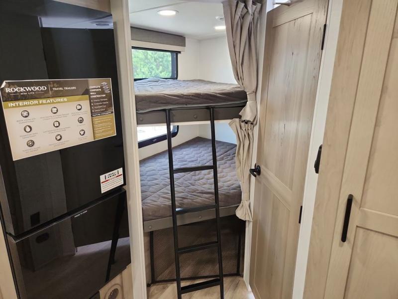 Each Rockwood Mini Lite travel trailer by Forest River is constructed with a fully laminated one-piece walkable roof, sleek frameless windows, and a six-sided full aluminum frame for strength and durability. The 12V thermostatically controlled heated tanks, plus radiant foil in the underbelly will allow you to camp well into the colder months, and the 200W roof solar panel will be perfect for a little off-gridding. Each model includes solid surface kitchen countertops, hidden hinge cabinet doors, roller shades, plus many more interior features. Having an AIR 360+ omnidirectional antenna with WiFi prep on board gives you the option to get some work done if it's needed, and the power tongue jack provides hassle-free set up, so you can enjoy more time relaxing!