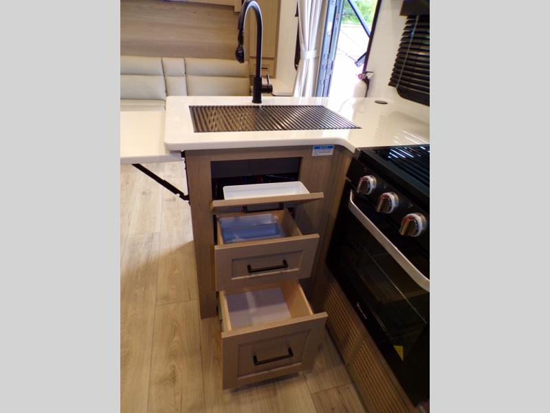 What I liked most: After a lot of searching, we finally found a trailer that "checked all of the boxes". Bunk house, lots of kitchen space (including outside!), a bathroom that larger than a coffin, and a huge awning. The bed is very comfortable...we've even used the heated mattress on a cold Wisconsin morning. All of this, and still under 5500 lbs. When you're inside you can't imagine that it's an easy to tow less than 26 feet long!