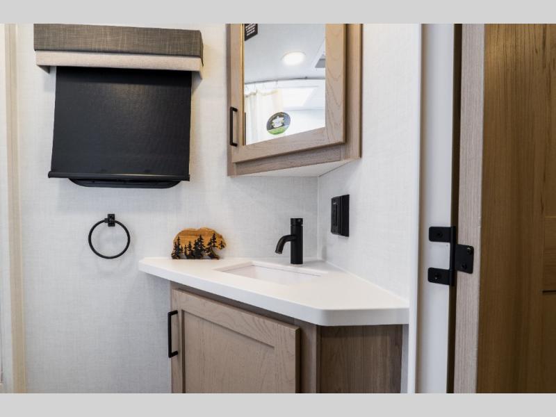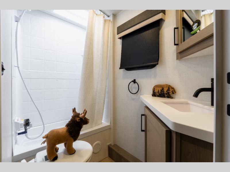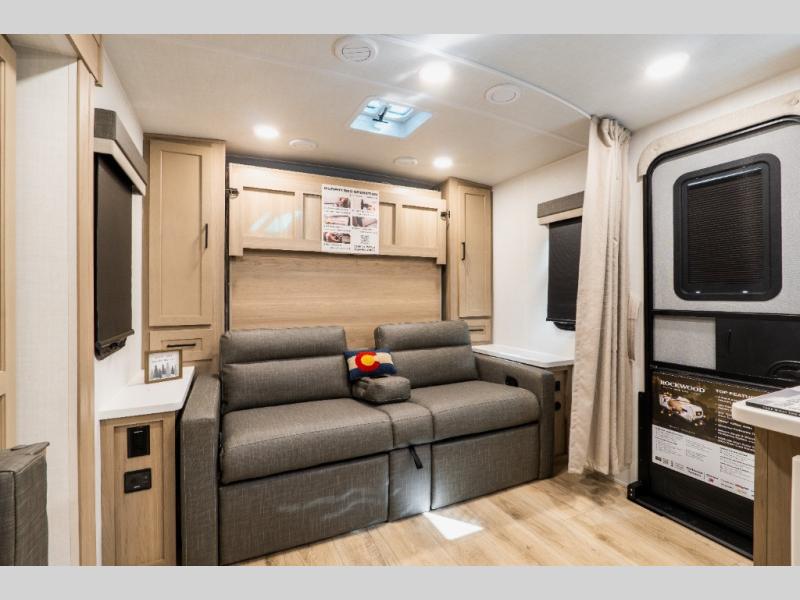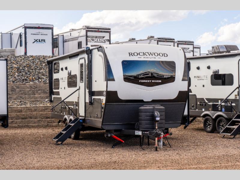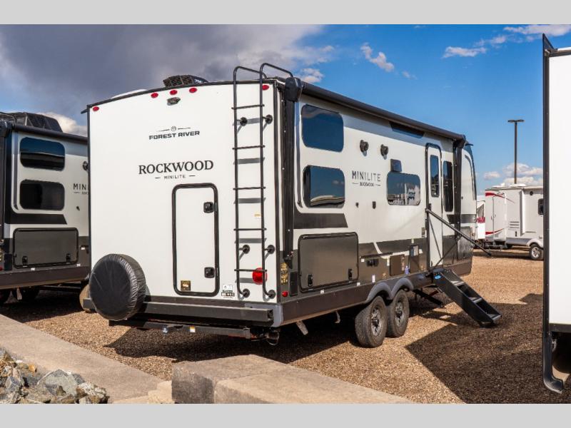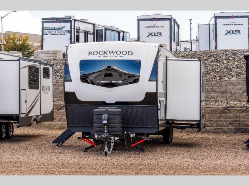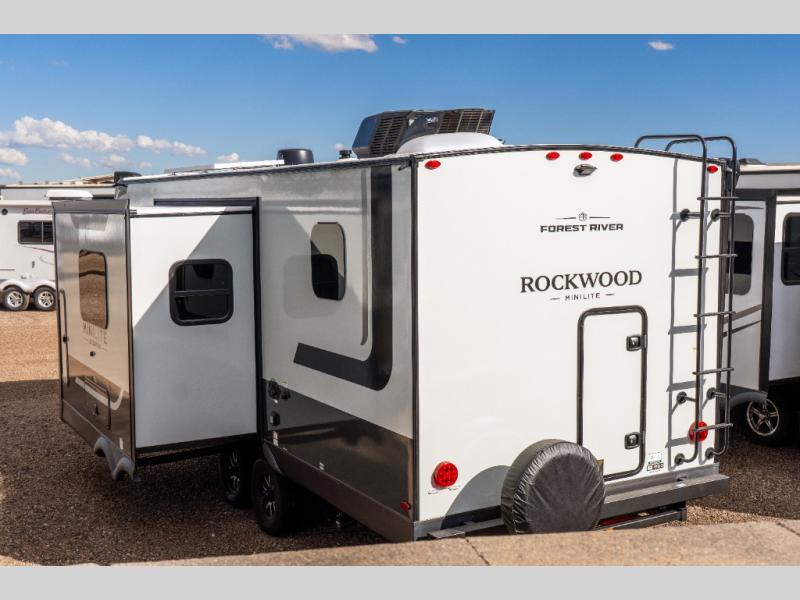 Each Rockwood Mini Lite travel trailer by Forest River is constructed with a fully laminated one-piece walkable roof, sleek frameless windows, and a six-sided full aluminum frame for strength and durability. The 12V thermostatically controlled heated tanks, plus radiant foil in the underbelly will allow you to camp well into the colder months, and the 200W roof solar panel will be perfect for a little off-gridding. Each model includes solid surface kitchen countertops, hidden hinge cabinet doors, roller shades, plus many more interior features. Having an AIR 360+ omnidirectional antenna with WiFi prep on board gives you the option to get some work done if it's needed, and the power tongue jack provides hassle-free set up, so you can enjoy more time relaxing!