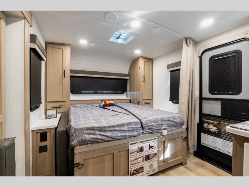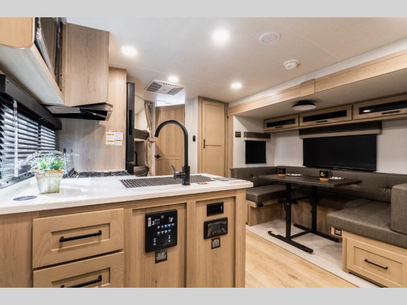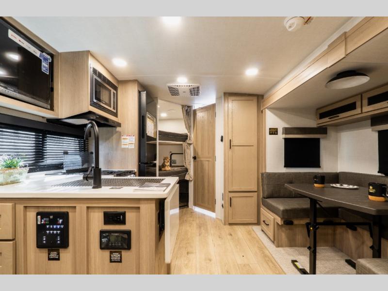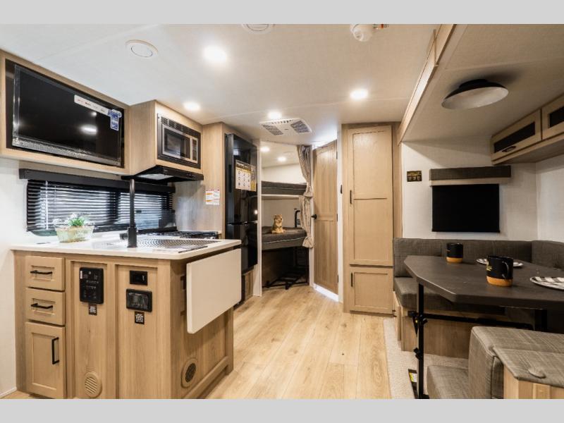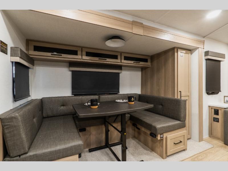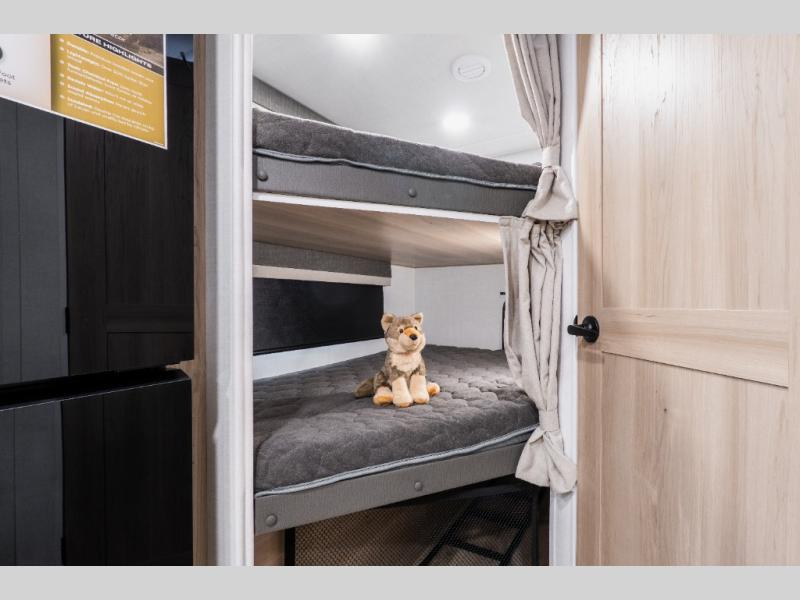 Finally, a lightweight travel trailer with double-size bunks for the kids or your guests! You'll find the versatile Murphy bed up front will be super convenient when you need more space to move around, and the 72" sofa will provide comfy seating space when the bed is put up. This model also includes a U-shaped dinette slide perfect to dine around, play games, and sleep additional guests. A 32" TV in the main living area will allow you to watch your favorite shows in the evenings, or you may just find yourselves outdoors under the 18' power awning with LED lights. And check out the pass-through storage, plus additional exterior storage for your hiking gear!
