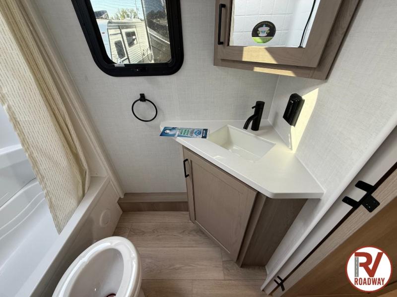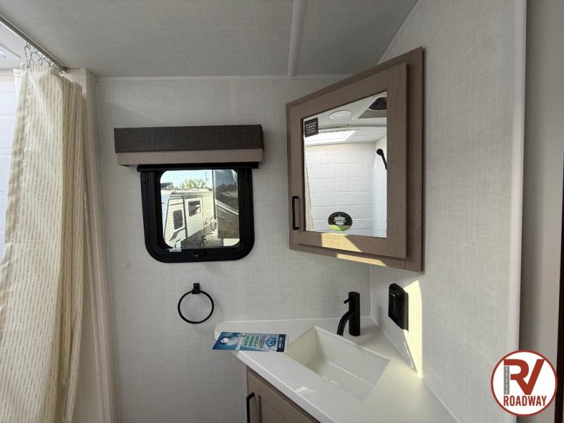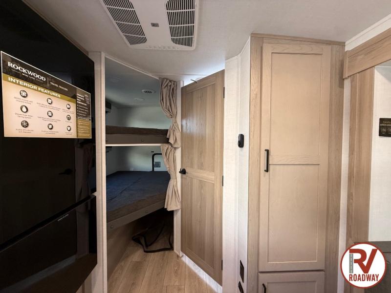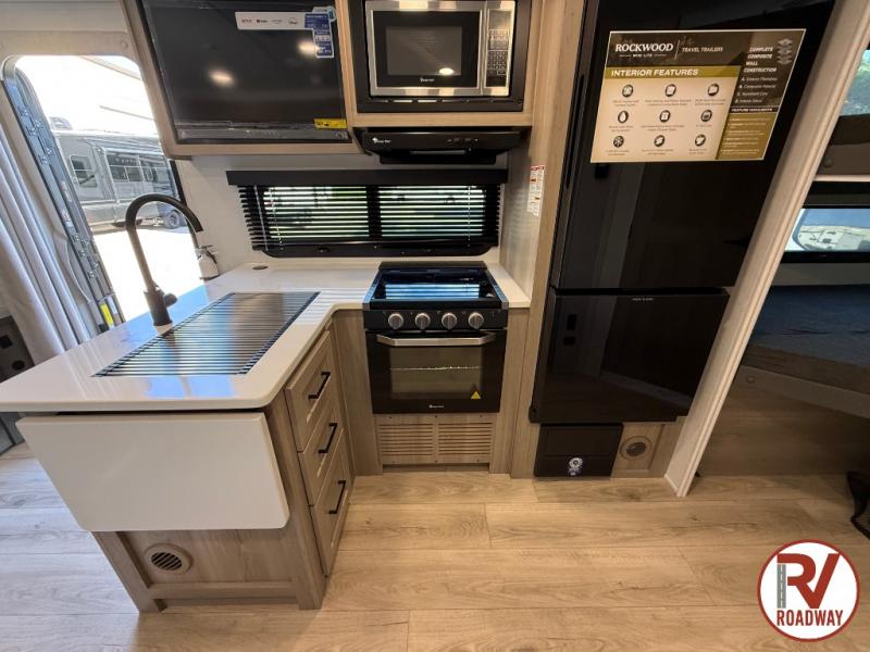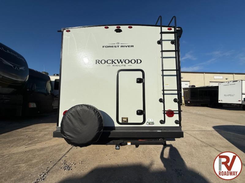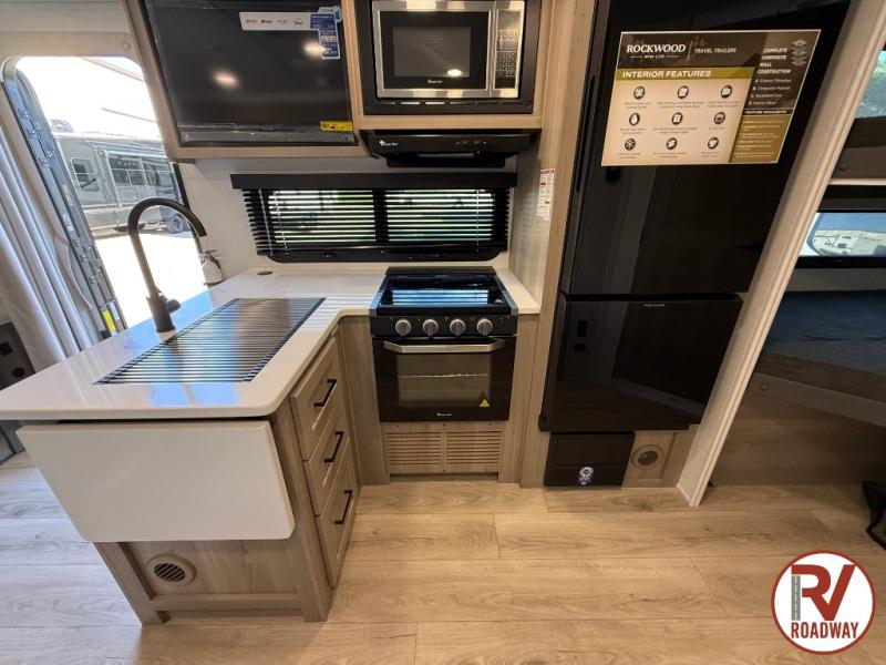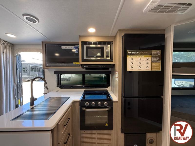 Each Rockwood Mini Lite travel trailer by Forest River is constructed with a fully laminated one-piece walkable roof, sleek frameless windows, and a six-sided full aluminum frame for strength and durability. The 12V thermostatically controlled heated tanks, plus radiant foil in the underbelly will allow you to camp well into the colder months, and the 200W roof solar panel will be perfect for a little off-gridding. Each model includes solid surface kitchen countertops, hidden hinge cabinet doors, roller shades, plus many more interior features. Having an AIR 360+ omnidirectional antenna with WiFi prep on board gives you the option to get some work done if it's needed, and the power tongue jack provides hassle-free set up, so you can enjoy more time relaxing!