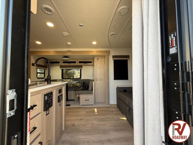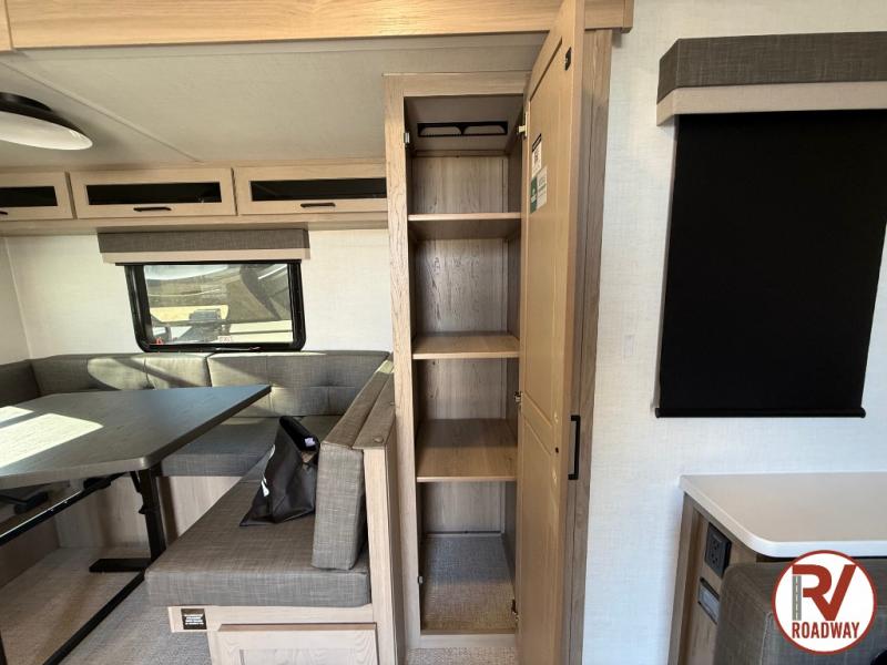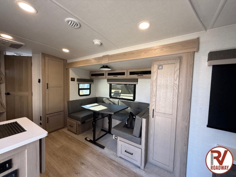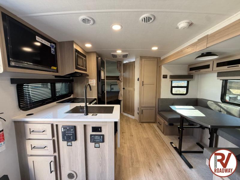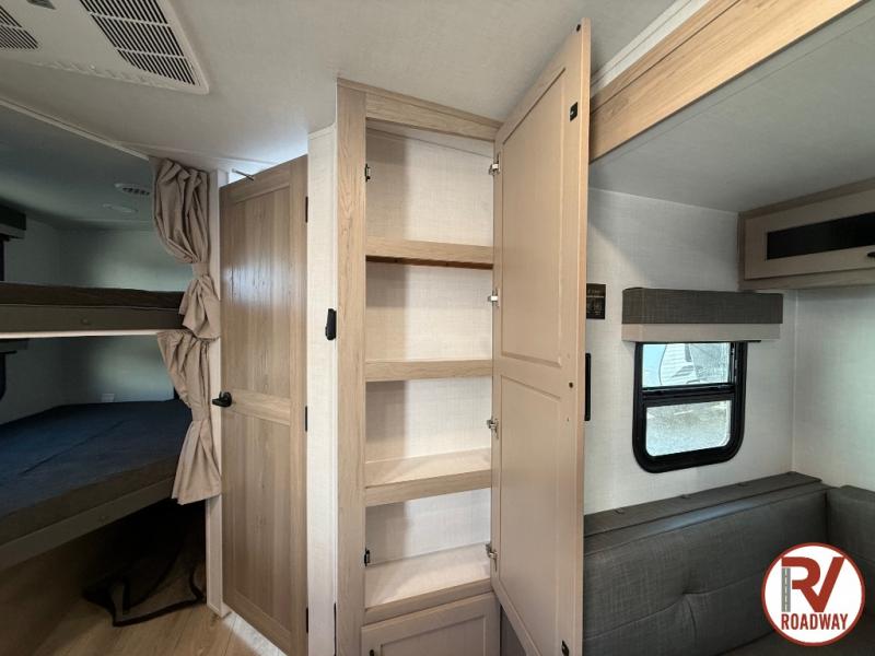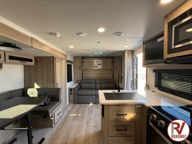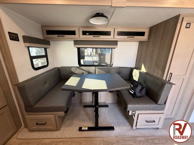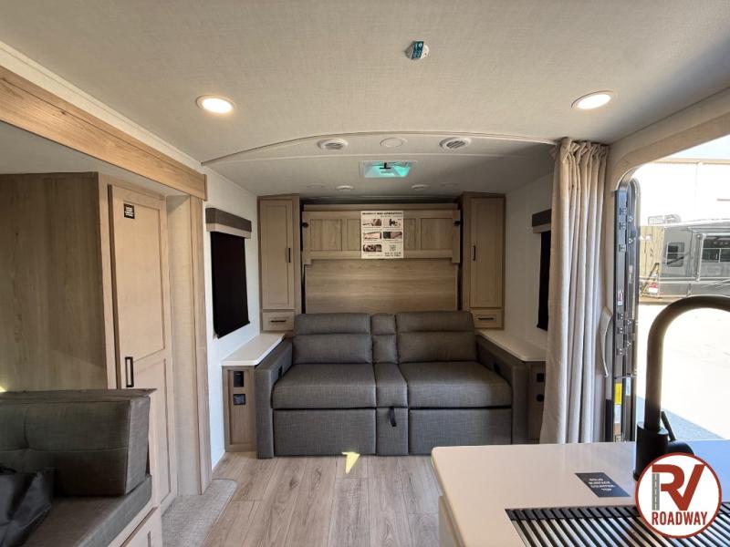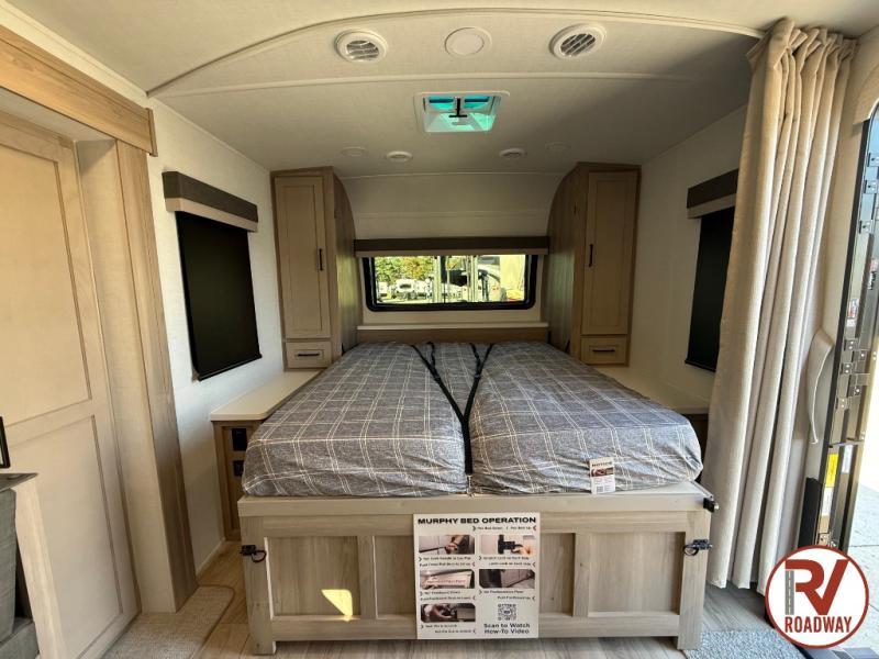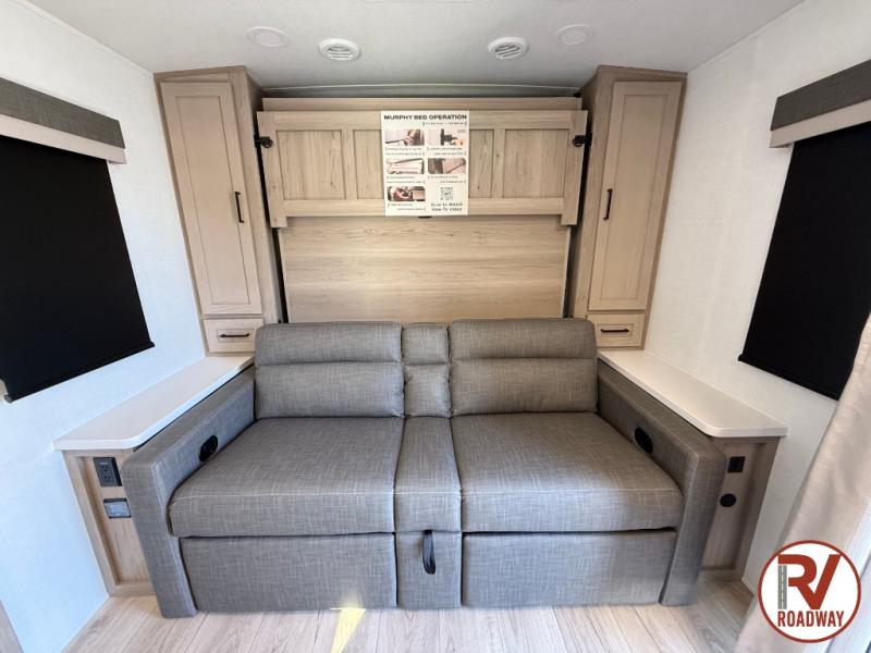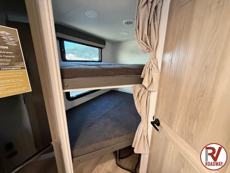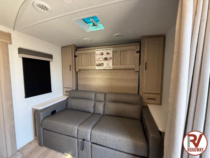 Finally, a lightweight travel trailer with double-size bunks for the kids or your guests! You'll find the versatile Murphy bed up front will be super convenient when you need more space to move around, and the 72" sofa will provide comfy seating space when the bed is put up. This model also includes a U-shaped dinette slide perfect to dine around, play games, and sleep additional guests. A 32" TV in the main living area will allow you to watch your favorite shows in the evenings, or you may just find yourselves outdoors under the 18' power awning with LED lights. And check out the pass-through storage, plus additional exterior storage for your hiking gear!