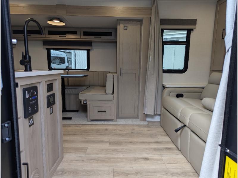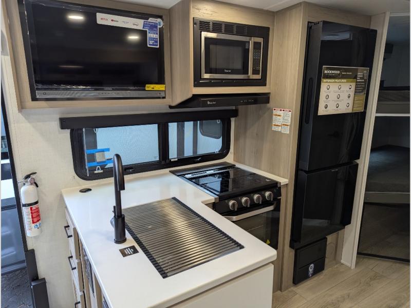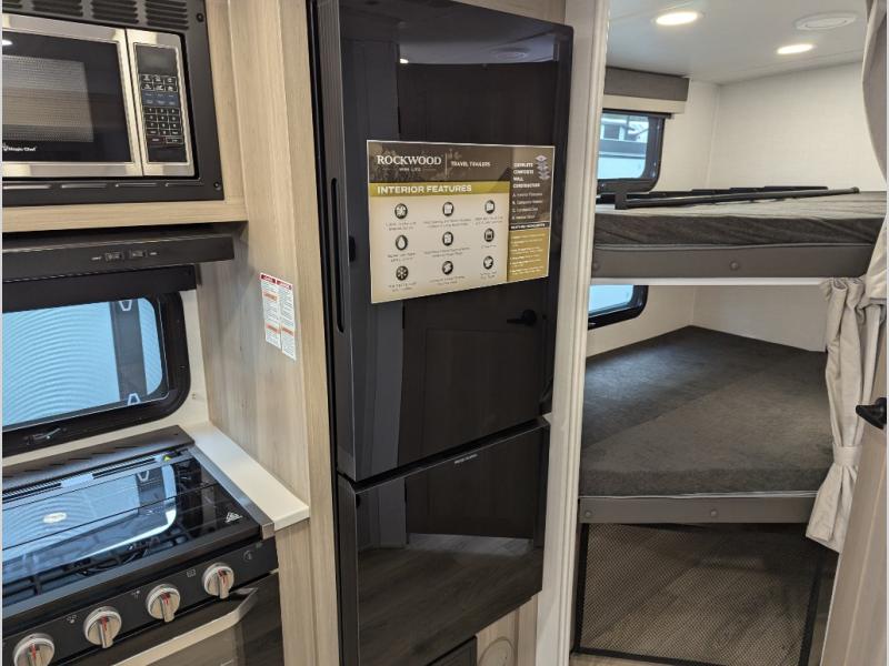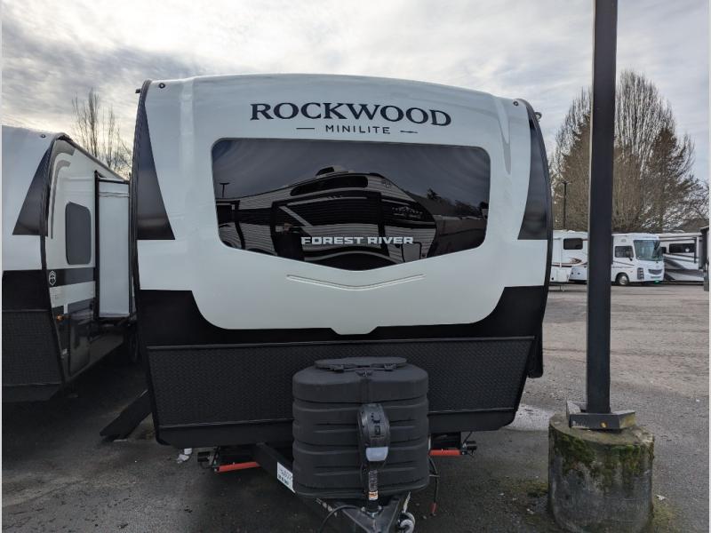 Each Rockwood Mini Lite travel trailer by Forest River is constructed with a fully laminated one-piece walkable roof, sleek frameless windows, and a six-sided full aluminum frame for strength and durability. The 12V thermostatically controlled heated tanks, plus radiant foil in the underbelly will allow you to camp well into the colder months, and the 200W roof solar panel will be perfect for a little off-gridding. Each model includes solid surface kitchen countertops, hidden hinge cabinet doors, roller shades, plus many more interior features. Having an AIR 360+ omnidirectional antenna with WiFi prep on board gives you the option to get some work done if it's needed, and the power tongue jack provides hassle-free set up, so you can enjoy more time relaxing!