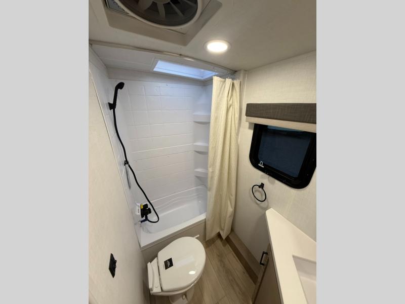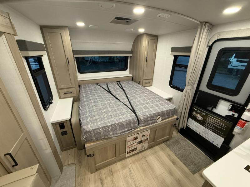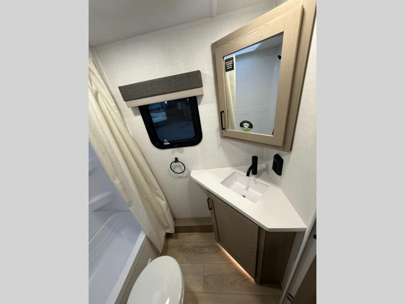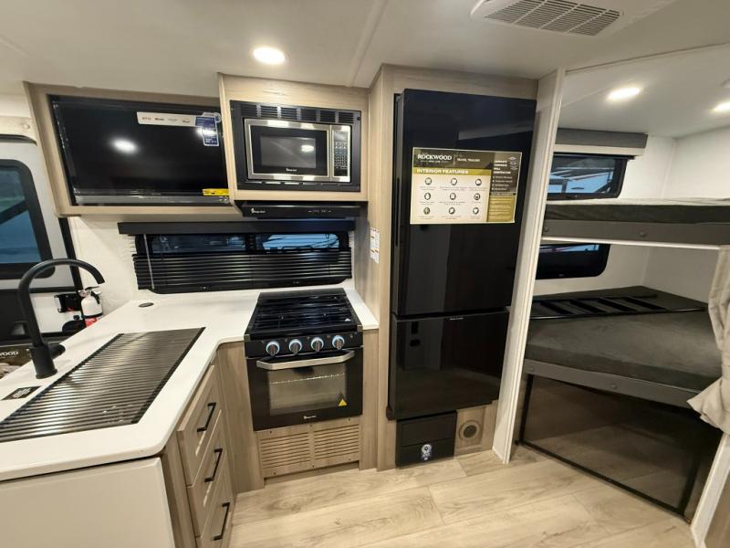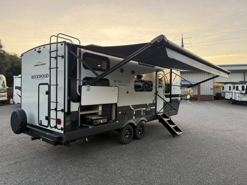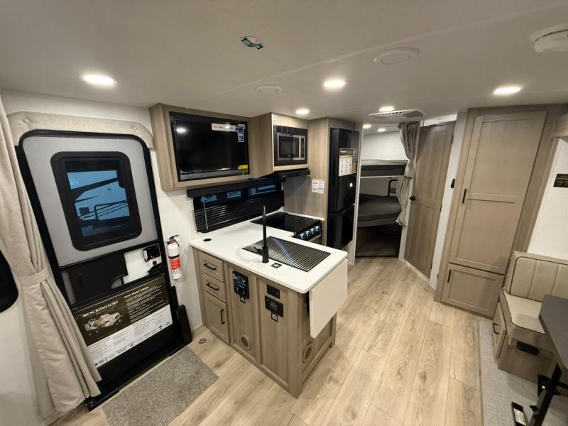 Each Rockwood Mini Lite travel trailer by Forest River is constructed with a fully laminated one-piece walkable roof, sleek frameless windows, and a six-sided full aluminum frame for strength and durability. The 12V thermostatically controlled heated tanks, plus radiant foil in the underbelly will allow you to camp well into the colder months, and the 200W roof solar panel will be perfect for a little off-gridding. Each model includes solid surface kitchen countertops, hidden hinge cabinet doors, roller shades, plus many more interior features. Having an AIR 360+ omnidirectional antenna with WiFi prep on board gives you the option to get some work done if it's needed, and the power tongue jack provides hassle-free set up, so you can enjoy more time relaxing!