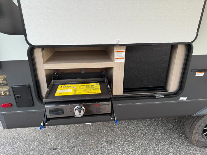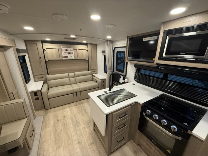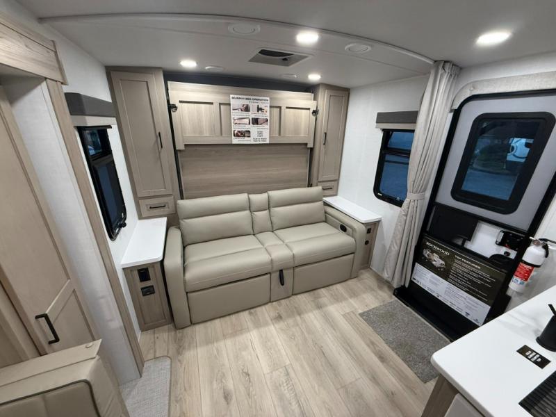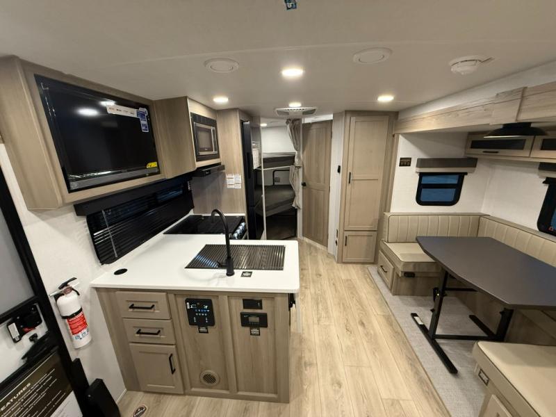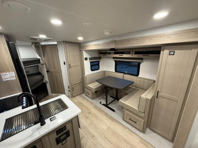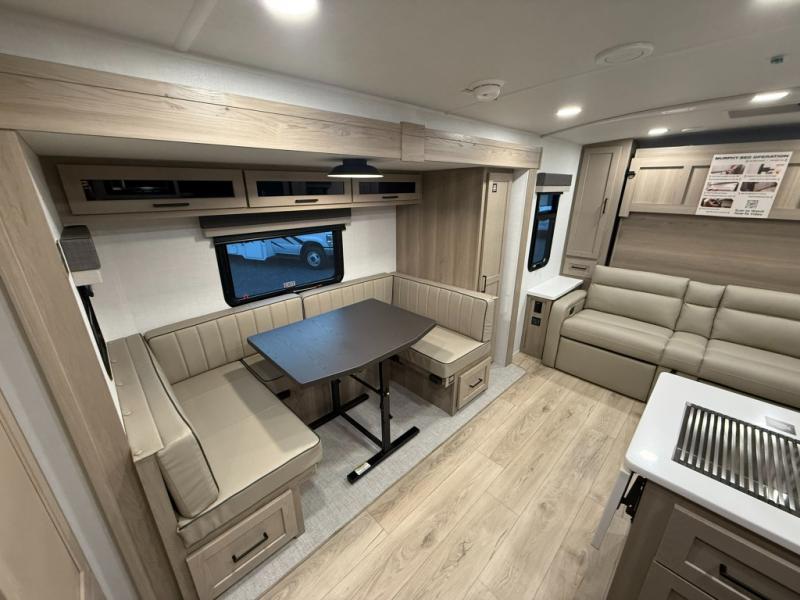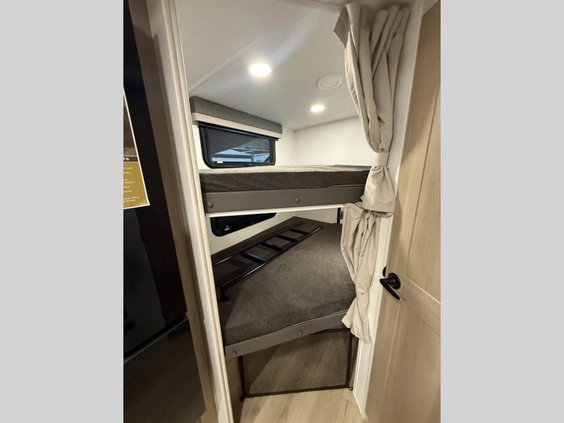 Finally, a lightweight travel trailer with double-size bunks for the kids or your guests! You'll find the versatile Murphy bed up front will be super convenient when you need more space to move around, and the 72" sofa will provide comfy seating space when the bed is put up. This model also includes a U-shaped dinette slide perfect to dine around, play games, and sleep additional guests. A 32" TV in the main living area will allow you to watch your favorite shows in the evenings, or you may just find yourselves outdoors under the 18' power awning with LED lights. And check out the pass-through storage, plus additional exterior storage for your hiking gear!